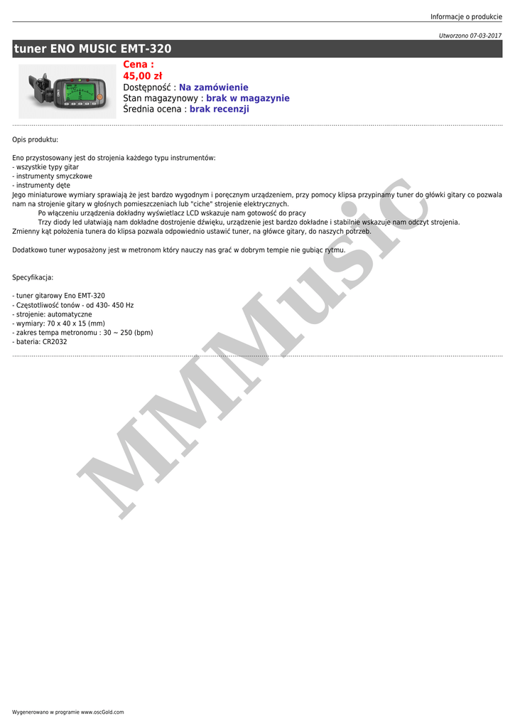 Informacje o produkcie Utworzono 07-03-2017 tuner ENO MUSIC EMT-320 Cena : 45,00 zł Dostępność : Na zamówienie Stan magazynowy : brak w magazynie Średnia ocena : brak recenzji Opis produktu: ic Eno przystosowany jest do strojenia każdego typu instrumentów: - wszystkie typy gitar - instrumenty smyczkowe - instrumenty dęte Jego miniaturowe wymiary sprawiają że jest bardzo wygodnym i poręcznym urządzeniem, przy pomocy klipsa przypinamy tuner do główki gitary co pozwala nam na strojenie gitary w głośnych pomieszczeniach lub "ciche" strojenie elektrycznych. Po włączeniu urządzenia dokładny wyświetlacz LCD wskazuje nam gotowość do pracy Trzy diody led ułatwiają nam dokładne dostrojenie dźwięku, urządzenie jest bardzo dokładne i stabilnie wskazuje nam odczyt strojenia. Zmienny kąt położenia tunera do klipsa pozwala odpowiednio ustawić tuner, na główce gitary, do naszych potrzeb. us Dodatkowo tuner wyposażony jest w metronom który nauczy nas grać w dobrym tempie nie gubiąc rytmu. M M - tuner gitarowy Eno EMT-320 - Częstotliwość tonów - od 430- 450 Hz - strojenie: automatyczne - wymiary: 70 x 40 x 15 (mm) - zakres tempa metronomu : 30 ~ 250 (bpm) - bateria: CR2032 M Specyfikacja: Wygenerowano w programie www.oscGold.com