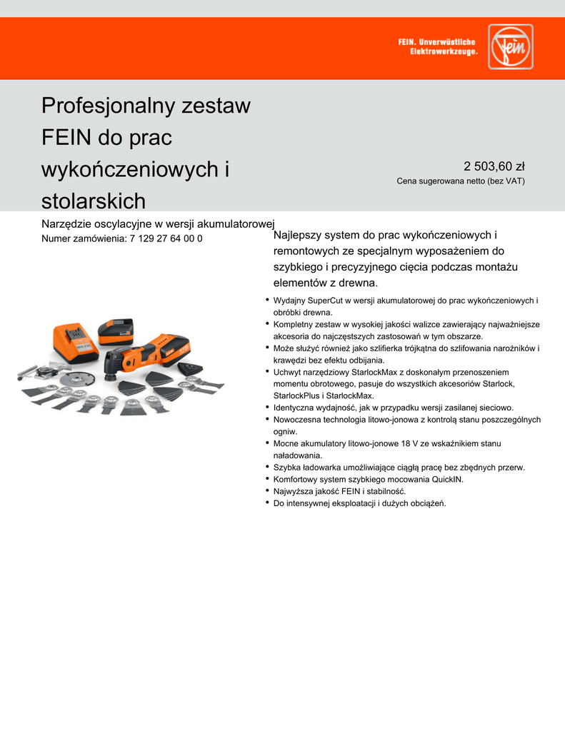 Profesjonalny zestaw FEIN do prac wykończeniowych i stolarskich 2 503,60 zł Cena sugerowana netto (bez VAT) Narzędzie oscylacyjne w wersji akumulatorowej Najlepszy system do prac wykończeniowych i Numer zamówienia: 7 129 27 64 00 0 remontowych ze specjalnym wyposażeniem do szybkiego i precyzyjnego cięcia podczas montażu elementów z drewna. Wydajny SuperCut w wersji akumulatorowej do prac wykończeniowych i obróbki drewna. Kompletny zestaw w wysokiej jakości walizce zawierający najważniejsze akcesoria do najczęstszych zastosowań w tym obszarze. Może służyć również jako szlifierka trójkątna do szlifowania narożników i krawędzi bez efektu odbijania. Uchwyt narzędziowy StarlockMax z doskonałym przenoszeniem momentu obrotowego, pasuje do wszystkich akcesoriów Starlock, StarlockPlus i StarlockMax. Identyczna wydajność, jak w przypadku wersji zasilanej sieciowo. Nowoczesna technologia litowo-jonowa z kontrolą stanu poszczególnych ogniw. Mocne akumulatory litowo-jonowe 18 V ze wskaźnikiem stanu naładowania. Szybka ładowarka umożliwiające ciągłą pracę bez zbędnych przerw. Komfortowy system szybkiego mocowania QuickIN. Najwyższa jakość FEIN i stabilność. Do intensywnej eksploatacji i dużych obciążeń. Profesjonalny zestaw FEIN do prac wykończeniowych i stolarskich Narzędzie oscylacyjne w wersji akumulatorowej Numer zamówienia: 7 129 27 64 00 0 Dane techniczne Cena obejmuje: Napięcie akumulatora 18 V Pojemność akumulatora 5 Ah Częstotliwość drgań Waga z akumulatorem Amplituda Uchwyt narzędzia 10 000-19 500 obr/min 1,8 kg 2 x 2,0 stopnie StarlockMax 1 FEIN SuperCut w wersji akumulatorowej AFSC 18 QSL 1 Brzeszczot ze stali szybkotnącej do drewna Ø 100 mm 1 ogranicznik głębokości 2 brzeszczoty E-Cut Precision (typ 205, 208) 5 brzeszczotów E-Cut Long-Life (typ 183, 160, 161, 201, 203) 2 brzeszczoty E-Cut Universal (typ 151, 152) Wymiana narzędzi QuickIN 1 płytka ścierna Akumulatorowe X po 5 arkuszy papieru ściernego (ziarnistość 80, 120, 180) 2 akumulatory (Li-Ion) 1 ładowarka 1 plastikowa walizka na narzędzia