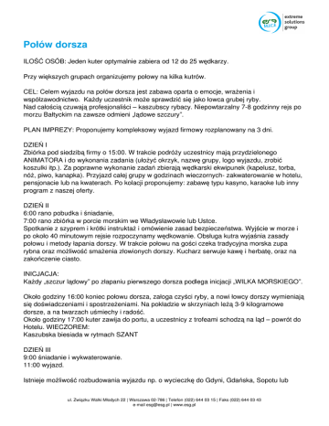 Połów dorsza ILOŚĆ OSÓB: Jeden kuter optymalnie zabiera od 12 do 25 wędkarzy. Przy większych grupach organizujemy połowy na kilka kutrów. CEL: Celem wyjazdu na połów dorsza jest zabawa oparta o emocje, wrażenia i współzawodnictwo. Każdy uczestnik może sprawdzić się jako łowca grubej ryby. Nad całością czuwają profesjonaliści – kaszubscy rybacy. Niepowtarzalny 7-8 godzinny rejs po morzu Bałtyckim na zawsze odmieni „lądowe szczury”. PLAN IMPREZY: Proponujemy kompleksowy wyjazd firmowy rozplanowany na 3 dni. DZIEŃ I Zbiórka pod siedzibą firmy o 15:00. W trakcie podróży uczestnicy mają przydzielonego ANIMATORA i do wykonania zadania (ułożyć okrzyk, nazwę grupy, logo wyjazdu, zrobić koszulki itp.). Za poprawne wykonanie zadań zbierają wędkarski ekwipunek (kapelusz, torba, nóż, piwo, kanapka). Przyjazd całej grupy w godzinach wieczornych- zakwaterowanie w hotelu, pensjonacie lub na kwaterach. Po kolacji proponujemy: zabawę typu kasyno, karaoke lub inny program z naszej oferty. DZIEŃ II 6:00 rano pobudka i śniadanie, 7:00 rano zbiórka w porcie morskim we Władysławowie lub Ustce. Spotkanie z szyprem i krótki instruktaż i omówienie zasad bezpieczeństwa. Wyjście w morze i po około 40 minutowym rejsie rozpoczynamy wędkowanie. Obsługa kutra wyjaśnia zasady połowu i metody łapania dorszy. W trakcie połowu na gości czeka tradycyjna morska zupa rybna oraz możliwość smażenia złowionych dorszy. Kucharz serwuje kawę i herbatę, oraz na zakończenie ciasto. INICJACJA: Każdy „szczur lądowy” po złapaniu pierwszego dorsza podlega inicjacji „WILKA MORSKIEGO”. Około godziny 16:00 koniec połowu dorsza, załoga czyści ryby, a nowi łowcy dorszy wymieniają się doświadczeniami i spostrzeżeniami. Na pokładzie w skrzyniach leżą 3-9 kilogramowe dorsze, a na twarzach uśmiechy i radość. Około godziny 17:00 kuter zawija do portu, a uczestnicy z trofeami schodzą na ląd – powrót do Hotelu. WIECZOREM: Kaszubska biesiada w rytmach SZANT DZIEŃ III 9:00 śniadanie i wykwaterowanie. 11:00 wyjazd. Istnieje możliwość rozbudowania wyjazdu np. o wycieczkę do Gdyni, Gdańska, Sopotu lub ul. Związku Walki Młodych 22 | Warszawa 02-786 | Telefon (022) 644 03 15 | Faks (022) 644 03 43 e-mail [email protected] | www.esg.pl fokarium na Helu. Koszt uzależniony jest od ilości uczestników, wybranych atrakcji i scenariusza. Szczegółowa kalkulacja na życzenie. KALKULACJA CENOWA: Koszt samego połowu od 150 zł + koszt wypożyczenia sprzętu za osobę. Dla 35 osób koszt wynosi około 6900 zł netto w cenie wynajem 2 kutrów, obsługa, wypożyczenie sprzętu wędkarskiego, poczęstunek, dyplomy, zdjęcia pamiątkowe itp. KALKULACJA wyjazdu trzydniowego na konkretne zamówienie. KALKULACJE innych atrakcji również na konkretne zamówienie. ul. Związku Walki Młodych 22 | Warszawa 02-786 | Telefon (022) 644 03 15 | Faks (022) 644 03 43 e-mail [email protected] | www.esg.pl Powered by TCPDF (www.tcpdf.org)