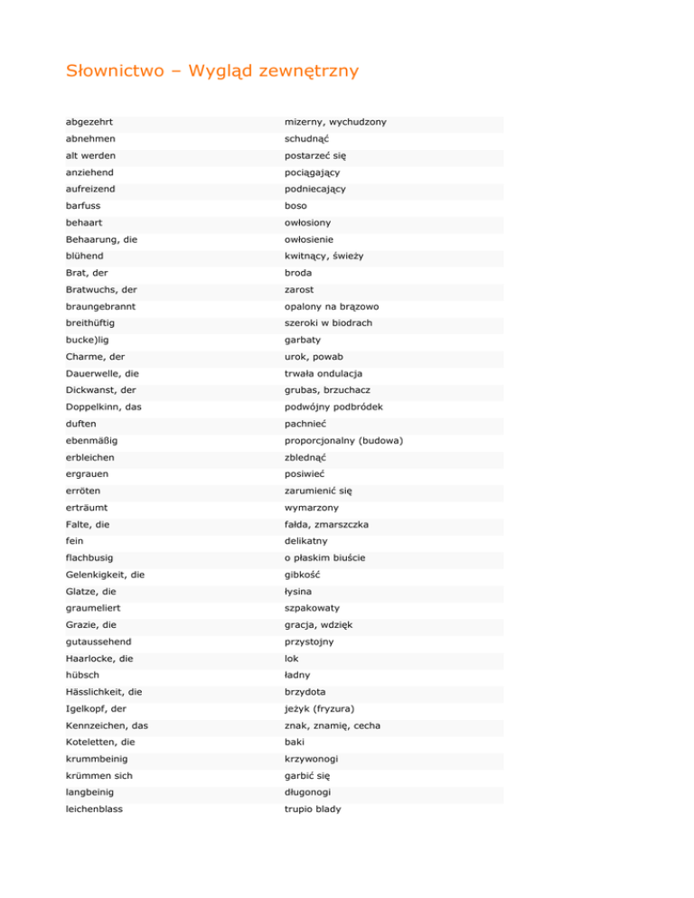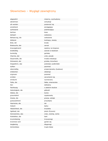 Słownictwo – Wygląd zewnętrzny abgezehrt mizerny, wychudzony abnehmen schudnąć alt werden postarzeć się anziehend pociągający aufreizend podniecający barfuss boso behaart owłosiony Behaarung, die owłosienie blühend kwitnący, świeŜy Brat, der broda Bratwuchs, der zarost braungebrannt opalony na brązowo breithüftig szeroki w biodrach bucke)lig garbaty Charme, der urok, powab Dauerwelle, die trwała ondulacja Dickwanst, der grubas, brzuchacz Doppelkinn, das podwójny podbródek duften pachnieć ebenmäßig proporcjonalny (budowa) erbleichen zblednąć ergrauen posiwieć erröten zarumienić się erträumt wymarzony Falte, die fałda, zmarszczka fein delikatny flachbusig o płaskim biuście Gelenkigkeit, die gibkość Glatze, die łysina graumeliert szpakowaty Grazie, die gracja, wdzięk gutaussehend przystojny Haarlocke, die lok hübsch ładny Hässlichkeit, die brzydota Igelkopf, der jeŜyk (fryzura) Kennzeichen, das znak, znamię, cecha Koteletten, die baki krummbeinig krzywonogi krümmen sich garbić się langbeinig długonogi leichenblass trupio blady Lächeln, das uśmiech Mitesser, der wągier, zaskórnik muskulös muskularny nackt nagi, goły Narbe, die blizna narbig pokryty bliznami pausbackig pyzaty Pickel, der pryszcz pickelig pryszczaty plump niezgrabny, ocięŜały Pony, der grzywka (na czole) pudern przypudrować Pustel, die krostka, pryszcz Riese, der olbrzym rot werden zaczerwienić się scharfsichtig bystrooki, przenikliwy Scheitel, der przedziałak schlampig niechlujny, niedbały schlicht skromny Schlitzauge, das skośne oko schmalhüftig wąski w biodrach Schnurrbart, der wąsy Schuppe, die łupieŜ Schweiß, der pot schwitzen pocić się Schwächling, der chuderlak, słabeusz Sommersprosse, die piegi stinken śmierdzieć stupsnäsig z zadartym nosem Tollpatsch, der niezdara vollbusig o pełnym biuście vollschlank o pełnych kształtach vorquellen wyłupiaste Warze, die brodawka winzig drobniutki, malutki Übergewicht, das nadwaga zart subtelny Zopf, der warkocz zunehmen przytyć Zwerg, der karzeł
