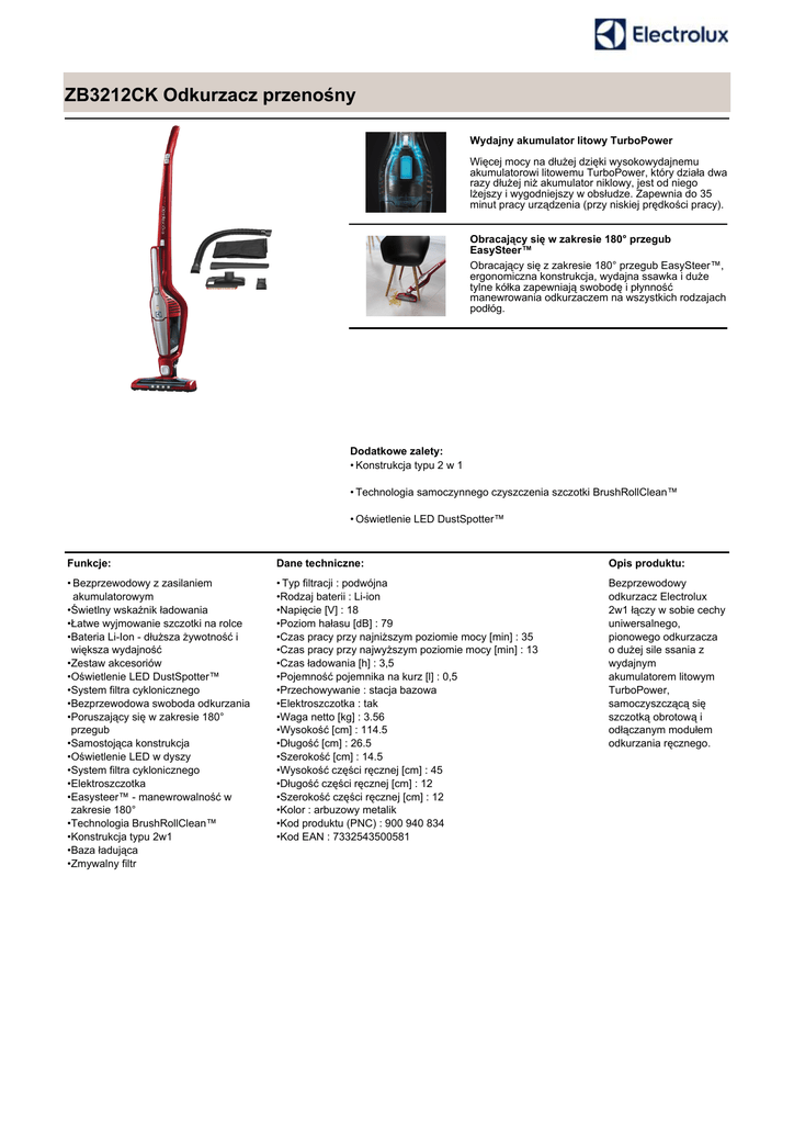 ZB3212CK Odkurzacz przenośny Wydajny akumulator litowy TurboPower Więcej mocy na dłużej dzięki wysokowydajnemu akumulatorowi litowemu TurboPower, który działa dwa razy dłużej niż akumulator niklowy, jest od niego lżejszy i wygodniejszy w obsłudze. Zapewnia do 35 minut pracy urządzenia (przy niskiej prędkości pracy). Obracający się w zakresie 180° przegub EasySteer™ Obracający się z zakresie 180° przegub EasySteer™, ergonomiczna konstrukcja, wydajna ssawka i duże tylne kółka zapewniają swobodę i płynność manewrowania odkurzaczem na wszystkich rodzajach podłóg. Dodatkowe zalety: • Konstrukcja typu 2 w 1 • Technologia samoczynnego czyszczenia szczotki BrushRollClean™ • Oświetlenie LED DustSpotter™ Funkcje: Dane techniczne: Opis produktu: • Bezprzewodowy z zasilaniem akumulatorowym •Świetlny wskaźnik ładowania •Łatwe wyjmowanie szczotki na rolce •Bateria Li-Ion - dłuższa żywotność i większa wydajność •Zestaw akcesoriów •Oświetlenie LED DustSpotter™ •System filtra cyklonicznego •Bezprzewodowa swoboda odkurzania •Poruszający się w zakresie 180° przegub •Samostojąca konstrukcja •Oświetlenie LED w dyszy •System filtra cyklonicznego •Elektroszczotka •Easysteer™ - manewrowalność w zakresie 180° •Technologia BrushRollClean™ •Konstrukcja typu 2w1 •Baza ładująca •Zmywalny filtr • Typ filtracji : podwójna •Rodzaj baterii : Li-ion •Napięcie [V] : 18 •Poziom hałasu [dB] : 79 •Czas pracy przy najniższym poziomie mocy [min] : 35 •Czas pracy przy najwyższym poziomie mocy [min] : 13 •Czas ładowania [h] : 3,5 •Pojemność pojemnika na kurz [l] : 0,5 •Przechowywanie : stacja bazowa •Elektroszczotka : tak •Waga netto [kg] : 3.56 •Wysokość [cm] : 114.5 •Długość [cm] : 26.5 •Szerokość [cm] : 14.5 •Wysokość części ręcznej [cm] : 45 •Długość części ręcznej [cm] : 12 •Szerokość części ręcznej [cm] : 12 •Kolor : arbuzowy metalik •Kod produktu (PNC) : 900 940 834 •Kod EAN : 7332543500581 Bezprzewodowy odkurzacz Electrolux 2w1 łączy w sobie cechy uniwersalnego, pionowego odkurzacza o dużej sile ssania z wydajnym akumulatorem litowym TurboPower, samoczyszczącą się szczotką obrotową i odłączanym modułem odkurzania ręcznego.