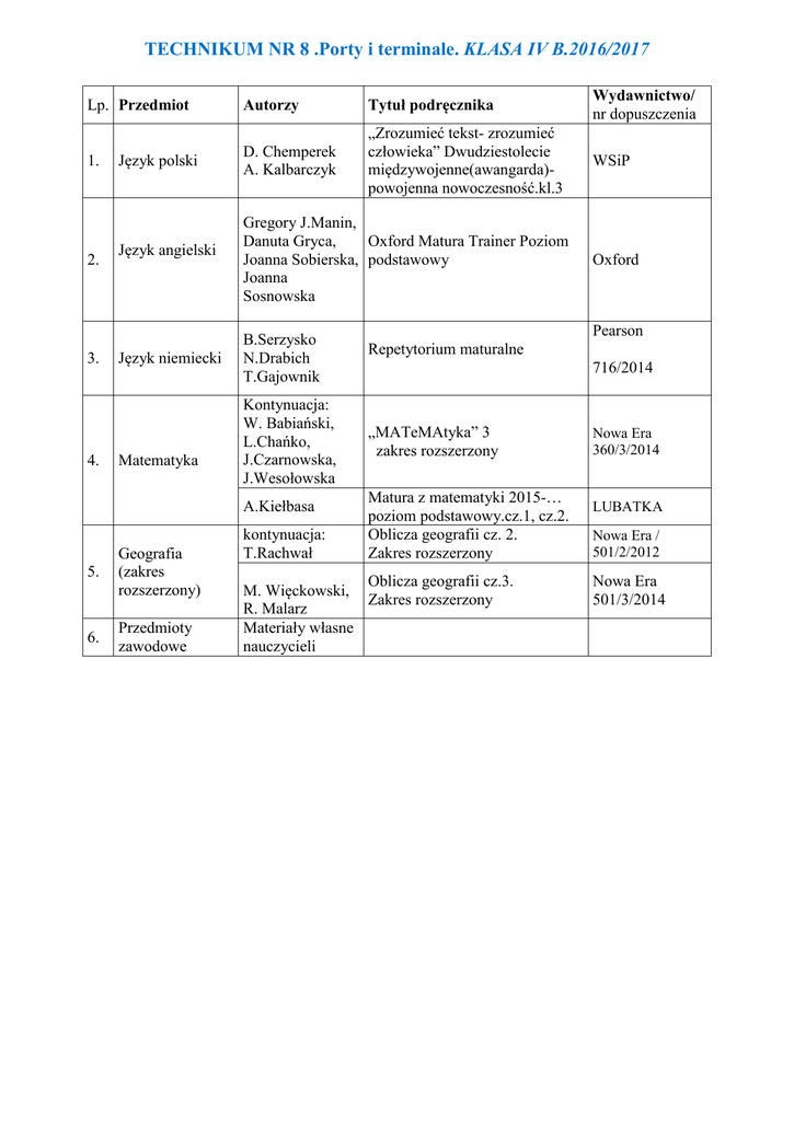 TECHNIKUM NR 8 .Porty i terminale. KLASA IV B.2016/2017 Lp. Przedmiot 1. 2. 3. 4. Język polski Język angielski Język niemiecki Matematyka Autorzy Tytuł podręcznika Wydawnictwo/ nr dopuszczenia D. Chemperek A. Kalbarczyk „Zrozumieć tekst- zrozumieć człowieka” Dwudziestolecie międzywojenne(awangarda)powojenna nowoczesność.kl.3 WSiP Gregory J.Manin, Danuta Gryca, Oxford Matura Trainer Poziom Joanna Sobierska, podstawowy Joanna Sosnowska B.Serzysko N.Drabich T.Gajownik Kontynuacja: W. Babiański, L.Chańko, J.Czarnowska, J.Wesołowska A.Kiełbasa 5. Geografia (zakres rozszerzony) 6. Przedmioty zawodowe kontynuacja: T.Rachwał Oxford Pearson Repetytorium maturalne 716/2014 „MATeMAtyka” 3 zakres rozszerzony Matura z matematyki 2015-… poziom podstawowy.cz.1, cz.2. Oblicza geografii cz. 2. Zakres rozszerzony Oblicza geografii cz.3. M. Więckowski, Zakres rozszerzony R. Malarz Materiały własne nauczycieli Nowa Era 360/3/2014 LUBATKA Nowa Era / 501/2/2012 Nowa Era 501/3/2014