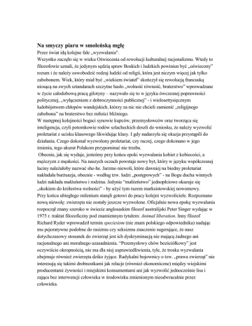 Na smyczy piaru w smoleńską mgłę Przez świat idą kolejne fale „wyzwalania". Wszystko zaczęło się w wieku Oświecenia od rewolucji kulturalnej racjonalizmu. Wtedy to filozofowie uznali, że jedynym sędzią spraw Boskich i ludzkich powinien być „oświecony” rozum i że należy oswobodzić rodzaj ludzki od religii, która jest niczym więcej jak tylko zabobonem. Wiek, który miał być „wiekiem świateł” skończył się rewolucją francuską niosącą na swych sztandarach szczytne hasło „wolność równość, braterstwo” wprowadzane w życie całodobową pracą gilotyny – nazywało się to w języku ówczesnej poprawności politycznej, „wyłączeniem z dobroczynności publicznej” - i wielosettysięcznym ludobójstwem chłopów wandejskich, którzy za nic nie chcieli zamienić „religijnego zabobonu” na braterstwo bez miłości bliźniego. W następnej kolejności bogaci synowie kupców, przemysłowców oraz tworząca się inteligencja, czyli potomkowie rodów szlacheckich doszli do wniosku, że należy wyzwolić proletariat z ucisku klasowego likwidując klasy. I gdy nadarzyła się okazja przystąpili do działania. Czego dokonał wyzwolony proletariat, czy raczej, czego dokonano w jego imieniu, tego akurat Polakom przypominać nie trzeba. Obecnie, jak się wydaje, jesteśmy przy końcu epoki wyzwalania kobiet z kobiecości, a mężczyzn z męskości. Na naszych oczach powstaje nowy byt, który w języku współczesnej łaciny należałoby nazwać she-he. Jarzmo niewoli, które dawniej na biedny proletariat nakładała burżuazja, obecnie - według tzw. ludzi „postępowych” - na Bogu ducha winnych ludzi nakłada małżeństwo i rodzina. Jedynie “małżeństwo” jednopłciowe okazuje się „skokiem do królestwa wolności” - by użyć tym razem marksistowskiej nowomowy. Przy końcu ubiegłego milenium stanęli gotowi do pracy kolejni wyzwoliciele. Rozpoznano nową niewolę: zwierzęta nie zostały jeszcze wyzwolone. Oficjalnie nowa epokę wyzwalania rozpoczął znany szeroko w świecie anglosaskim filozof australijski Peter Singer wydając w 1975 r. traktat filozoficzny pod znamiennym tytułem: Animal liberation. Inny filozof Richard Ryder wprowadził termin speciesism (nie znam polskiego odpowiednika) nadając mu pejoratywne podobne do rasizmu czy seksizmu znaczenie sugerujące, że nasz dotychczasowy stosunek do zwierząt jest ich dyskryminacją nie mającą żadnego ani racjonalnego ani moralnego uzasadnienia. “Przemysłowy chów bezściółkowy” jest oczywiście okropnością, nie ma dla niej usprawiedliwienia, tyle, że troska wyzwalania obejmuje również zwierzęta dziko żyjące. Radykalni bojownicy o tzw. „prawa zwierząt” nie interesują się takimi drobnostkami jak relacje (również ekonomiczne) między wiejskimi producentami żywności i miejskimi konsumentami ani jak wyzwolić jednocześnie lisa i zająca bez interwencji człowieka w środowisku zmienionym nieodwracalnie przez człowieka. Okazuje się, ze wyzwalać można nie tylko istoty żywe. W Unii Europejskiej od kilku lat rozpoczęło się wyzwalanie krajobrazów i budynków od krzyży – szpecą bezwyznaniową urodę przestrzeni publicznej. Ta ostatnia akcja jest częścią szerszej: wyzwalania Europy z chrześcijaństwa. Efektem tego wyzwolenia, – jeśli się powiedzie, co jest na szczęście wątpliwe – będzie „goła” Europa ograbiona z historii i pozbawiona konstytuującej ją kultury. Bo - jak pisze Ryszard Legutko - „Można być agnostykiem lub ateistą, można nie znosić obrazów z Madonną i architektury sakralnej; można śmiać się z Wcielenia, a Wielkanoc poświęcać na malowanie mieszkania; można marzyć o kupieniu budynku kościelnego i przemienieniu go w agencję towarzyską; można uważać średniowiecze za wieki mroczne, Św. Tomasza za głupca, Woltera za mędrca; można robić i myśleć jeszcze wiele innych rzeczy mądrych i głupich. Wszystko to nie zmieni faktu, iż chrześcijaństwo w sposób zasadniczy kształtowało Europę przez wiele wieków i że gdyby nie ono, Europa nawet w najbardziej tolerancyjnym przybliżeniu nie byłaby dzisiaj tym, czym jest. Co więcej, myślenie uniwersalistyczne, które leży u podstaw integracji (europejskiej – przypisek mój: S. K.) miało z chrześcijaństwem europejskim ścisły związek”. Udane wyzwolenie Europy z chrześcijaństwa byłoby zatem wyzwoleniem świata od Europy. Entuzjastyczny wyzwoliciel (a braku entuzjazmu wyzwolicielom z pewnością zarzucić nie można) zawsze znajdzie coś do wyzwolenia; autentyczny proletariat wcale nie jest potrzebny, wystarczy jakiś zastępczy: kobiety poddane „męskiej dominacji”, rodziny, które należy wyzwolić od wychowywania dzieci, pary homoseksualne, którym w zdrowej społeczności odmawia się statusu małżeństwa. Te proletariaty zastępcze są ulubionym żerem zacietrzewionych postępowców i modernizatorów, doganiaczy „nowoczesnej” Europy i miłośników ludzkości. Niektóre wyzwolenia mają zasięg globalny, wtedy wyzwoliciele działają według starej metody: „proletariusze wszystkich krajów łączcie się”, inne mają charakter lokalny, jeszcze inne dzieją się w ramach narodowych. W Polsce np. nasiliły się ostatnio dwa wyzwolenia: wyzwolenie Polaków z patriotyzmu i wyzwolenie z dobrych obyczajów. Można wiec spokojnie parafrazować piosenkę Wojciecha Młynarskiego: co by tu jeszcze, co by tu jeszcze wyzwolić panowie. Nie widać, żeby parafraza traciła aktualność. Trzeba przyznać, że wyzwoliciele mają niemałe osiągnięcia. Gdy czytam w polonijnym miesięczniku – by posłużyć się przykładem - wypowiedź autora, który uważa, ze poległy w Smoleńsku prezydent Lech Kaczyński na Wawel nie zasłużył, to niezależnie od tego czy się z tym poglądem zgadzamy czy nie, autor zasługuje na szacunek, jak każdy człowiek, który ma własne zdanie i chce się z nim podzielić z innymi. Ale, gdy przy ok