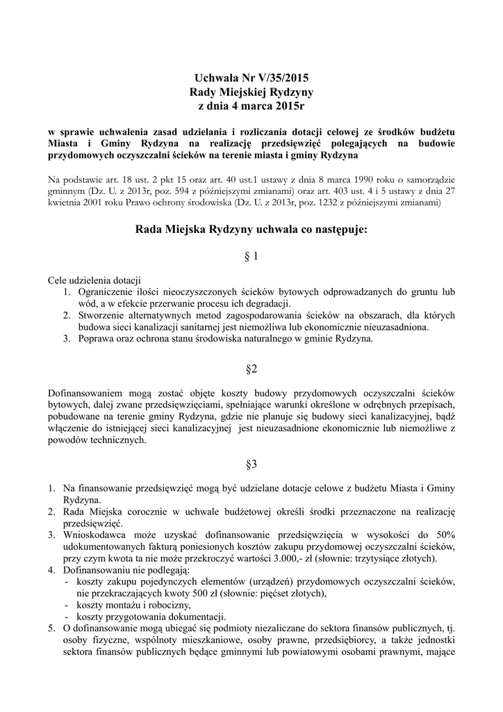 Uchwała Nr V/35/2015 Rady Miejskiej Rydzyny z dnia 4 marca 2015r w sprawie uchwalenia zasad udzielania i rozliczania dotacji celowej ze środków budŜetu Miasta i Gminy Rydzyna na realizację przedsięwzięć polegających na budowie przydomowych oczyszczalni ścieków na terenie miasta i gminy Rydzyna Na podstawie art. 18 ust. 2 pkt 15 oraz art. 40 ust.1 ustawy z dnia 8 marca 1990 roku o samorządzie gminnym (Dz. U. z 2013r, poz. 594 z późniejszymi zmianami) oraz art. 403 ust. 4 i 5 ustawy z dnia 27 kwietnia 2001 roku Prawo ochrony środowiska (Dz. U. z 2013r, poz. 1232 z późniejszymi zmianami) Rada Miejska Rydzyny uchwala co następuje: §1 Cele udzielenia dotacji 1. Ograniczenie ilości nieoczyszczonych ścieków bytowych odprowadzanych do gruntu lub wód, a w efekcie przerwanie procesu ich degradacji. 2. Stworzenie alternatywnych metod zagospodarowania ścieków na obszarach, dla których budowa sieci kanalizacji sanitarnej jest niemoŜliwa lub ekonomicznie nieuzasadniona. 3. Poprawa oraz ochrona stanu środowiska naturalnego w gminie Rydzyna. §2 Dofinansowaniem mogą zostać objęte koszty budowy przydomowych oczyszczalni ścieków bytowych, dalej zwane przedsięwzięciami, spełniające warunki określone w odrębnych przepisach, pobudowane na terenie gminy Rydzyna, gdzie nie planuje się budowy sieci kanalizacyjnej, bądź włączenie do istniejącej sieci kanalizacyjnej jest nieuzasadnione ekonomicznie lub niemoŜliwe z powodów technicznych. §3 1. Na finansowanie przedsięwzięć mogą być udzielane dotacje celowe z budŜetu Miasta i Gminy Rydzyna. 2. Rada Miejska corocznie w uchwale budŜetowej określi środki przeznaczone na realizację przedsięwzięć. 3. Wnioskodawca moŜe uzyskać dofinansowanie przedsięwzięcia w wysokości do 50% udokumentowanych fakturą poniesionych kosztów zakupu przydomowej oczyszczalni ścieków, przy czym kwota ta nie moŜe przekroczyć wartości 3.000,- zł (słownie: trzytysiące złotych). 4. Dofinansowaniu nie podlegają: - koszty zakupu pojedynczych elementów (urządzeń) przydomowych oczyszczalni ścieków, nie przekraczających kwoty 500 zł (słownie: pięćset złotych), - koszty montaŜu i robocizny, - koszty przygotowania dokumentacji. 5. O dofinansowanie mogą ubiegać się podmioty niezaliczane do sektora finansów publicznych, tj. osoby fizyczne, wspólnoty mieszkaniowe, osoby prawne, przedsiębiorcy, a takŜe jednostki sektora finansów publicznych będące gminnymi lub powiatowymi osobami prawnymi, mające tytuł prawny do nieruchomości zlokalizowanej na terenie miasta i gminy Rydzyna. W przypadku posiadania innego tytułu prawnego niŜ własność, naleŜy dołączyć zgodę właściciela nieruchomości. JeŜeli nieruchomość znajduje się we współwłasności, wymagana jest zgoda wszystkich współwłaścicieli na budowę oczyszczalni oraz oświadczenie o wyraŜeniu zgody na wypłacenie dofinansowania jednemu z współwłaścicieli ponoszącemu koszty budowy, zgodnie z drukiem stanowiącym załącznik nr 1 do uchwały 6. Istnieje moŜliwość przyznania dotacji na budowę oczyszczalni ścieków obsługujących większą liczbę nieruchomości. W takim przypadku wniosek powinna złoŜyć osoba, która posiada tytuł prawny do nieruchomości, na której znajdować się będzie oczyszczalnia. Do wniosku naleŜy dołączyć dokument z potwierdzeniem zamiaru współuczestnictwa pozostałych uŜytkowników oczyszczalni ścieków w realizacji przedsięwzięcia. 7. Uzyskanie dotacji w jednym roku nie blokuje moŜliwości składania wniosku w latach kolejnych, jeśli zamierzona inwestycja dotyczyć będzie innej nieruchomości. 8. Dofinansowaniem mogą być objęte wyłącznie systemy oczyszczania ścieków bytowych, których przepustowość nie przekracza 5m³/dobę. §4 1. 2. 3. 4. 5. 6. 7. 8. Wzór wniosku o przyznanie dotacji celowej na realizację przedsięwzięć polegających na budowie przydomowych oczyszczalni ścieków na terenie miasta i gminy Rydzyna, stanowi załącznik nr 2 do niniejszej uchwały. Pisemny wniosek o przyznanie dotacji celowej wraz z załącznikami naleŜy złoŜyć w Urzędzie Miasta i Gminy Rydzyna na odpowiednim formularzu do dnia 30 października danego roku. Wnioski, które zostaną złoŜone po dniu 30 października, będą rozpatrywane w roku kolejnym. Wnioski niekompletne nie będą rozpatrywane do czasu ich uzupełnienia. Wniosek jest kompletny jeŜeli został właściwie wypełniony i zawiera wszystkie niezbędne informacje oraz dokumenty (określone w niniejszych zasadach) pozwalające na jego rozpatrzenie. Do wniosku naleŜy dołączyć: a) kserokopię tytułu prawnego do władania nieruchomością, b) oświadczenie o którym mowa w § 3 ust 5, c) kserokopię faktury wraz z oryginałem (do wglądu) określającą wartość zakupionych urządzeń oczyszczalni ścieków, d) opis techniczny przydomowej oczyszczalni ścieków, e) aprobatę techniczną przydomowej oczyszczalni ścieków f) kopię mapy lub szkicu sytuacyjnego z zaznaczeniem pobudowanej oczyszczalni, g) dokument potwierdzający dokonanie zgłoszenia Staroście Leszczyńskiemu zamiaru prowadzenia robót budowlanych budowy przydomowej oczyszczalni ścieków. O kolejności udzielenia dotacji decyduje kolejność złoŜonych wniosków. Burmistrz Miasta i Gminy Rydzyna działający w imieniu gminy, po dokonaniu oceny spełnienia warunków, moŜe zawrzeć z wnioskującym umowę o przyznanie dotacji celowej. Wniosek, który spełnił warunki dofinansowania, a który w danym roku budŜetowym z uwagi na wyczerpanie środków przeznaczonych na ten cel takiego dofinansowania nie otrzymał, moŜe zostać rozpatrzony w następnym roku budŜetowym, bez prawa do odsetek za zwłokę w realizacji dofinansowania. Przed udzieleniem dofinansowania zostanie przeprowadzona kontrola zgodności zabudowy urządzeń przydomowej oczyszczalni ścieków z dokonanymi zgłoszeniami i obowiązującymi przepisami. Rozliczenie dotacji następować będzie p