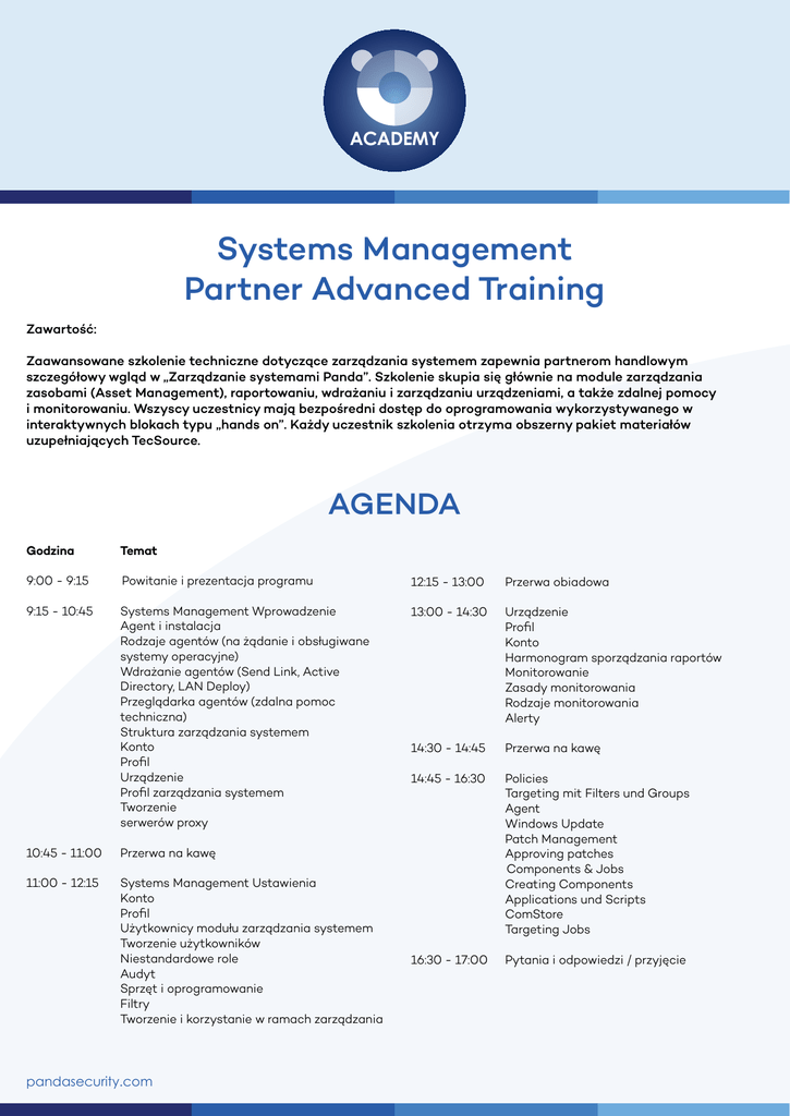 ACADEMY Systems Management Partner Advanced Training Zawartość: Zaawansowane szkolenie techniczne dotyczące zarządzania systemem zapewnia partnerom handlowym szczegółowy wgląd w „Zarządzanie systemami Panda”. Szkolenie skupia się głównie na module zarządzania zasobami (Asset Management), raportowaniu, wdrażaniu i zarządzaniu urządzeniami, a także zdalnej pomocy i monitorowaniu. Wszyscy uczestnicy mają bezpośredni dostęp do oprogramowania wykorzystywanego w interaktywnych blokach typu „hands on”. Każdy uczestnik szkolenia otrzyma obszerny pakiet materiałów uzupełniających TecSource. AGENDA GodzinaTemat 9:00 - 9:15Powitanie i prezentacja programu 12:15 - 13:00 9:15 - 10:45 Systems Management Wprowadzenie Agent i instalacja Rodzaje agentów (na żądanie i obsługiwane systemy operacyjne) Wdrażanie agentów (Send Link, Active Directory, LAN Deploy) Przeglądarka agentów (zdalna pomoc techniczna) Struktura zarządzania systemem Konto Profil Urządzenie Profil zarządzania systemem Tworzenie serwerów proxy 13:00 - 14:30 Urządzenie Profil Konto Harmonogram sporządzania raportów Monitorowanie Zasady monitorowania Rodzaje monitorowania Alerty 10:45 - 11:00 Przerwa na kawę 11:00 - 12:15 Systems Management Ustawienia Konto Profil Użytkownicy modułu zarządzania systemem Tworzenie użytkowników Niestandardowe role Audyt Sprzęt i oprogramowanie Filtry Tworzenie i korzystanie w ramach zarządzania pandasecurity.com 14:30 - 14:45 Przerwa obiadowa Przerwa na kawę 14:45 - 16:30 Policies Targeting mit Filters und Groups Agent Windows Update Patch Management Approving patches Components & Jobs Creating Components Applications und Scripts ComStore Targeting Jobs 16:30 - 17:00 Pytania i odpowiedzi / przyjęcie