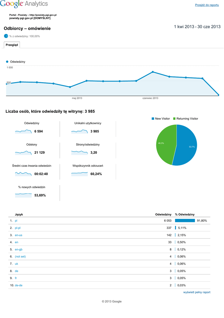 Przejdź do raportu Portal Powiaty – http://powiaty.pgi.gov.pl powiaty.pgi.gov.pl [DOMYŚLNY] 1 kwi 2013 30 cze 2013 Odbiorcy – omówienie % z odwiedziny: 100,00% Przegląd Odwiedziny 1 000 500 maj 2013 czerwiec 2013 Liczba osób, które odwiedziły tę witrynę: 3 985 New Visitor Odwiedziny 6 594 Odsłony 21 129 Średni czas trwania odwiedzin 00:02:40 Returning Visitor Unikalni użytkownicy 3 985 46.3% Strony/odwiedziny 53.7% 3,20 Współczynnik odrzuceń 60,24% % nowych odwiedzin 53,69% Język Odwiedziny 1. pl % Odwiedziny 6 053 91,80% 2. plpl 337 5,11% 3. enus 142 2,15% 33 0,50% 5. engb 8 0,12% 6. (not set) 4 0,06% 7. uk 4 0,06% 8. de 3 0,05% 9. fr 3 0,05% 10. dede 2 0,03% 4. en wyświetl pełny raport © 2013 Google Przejdź do raportu Portal Powiaty – http://powiaty.pgi.gov.pl powiaty.pgi.gov.pl [DOMYŚLNY] 1 kwi 2013 30 cze 2013 Lokalizacja % z odwiedziny: 100,00% Nakładka mapy Wykorzystanie witryny 1 Kraj/terytorium 6,485 Odwiedziny Średni czas trwania Strony/odwiedziny % nowych odwiedzin odwiedzin Współczynnik odrzuceń 6 594 3,20 00:02:40 53,70% 60,24% % całości: 100,00% Średnia dla witryny: 3,20 Średnia dla witryny: 00:02:40 Średnia dla witryny: 53,69% Średnia dla witryny: 60,24% (6 594) (0,00%) (0,00%) (0,03%) (0,00%) 6 485 3,23 00:02:42 53,57% 60,00% 1. Poland 2. (not set) 29 1,31 00:00:19 58,62% 75,86% 3. Germany 25 1,60 00:00:28 52,00% 88,00% 4. United Kingdom 12 1,58 00:02:13 58,33% 75,00% 5. Belgium 7 1,43 00:00:23 71,43% 57,14% 6. United States 7 1,43 00:00:17 100,00% 85,71% 7. France 6 5,83 00:04:32 83,33% 66,67% 8. Czech Republic 4 2,50 00:04:44 25,00% 50,00% 9. Austria 3 1,67 00:00:37 66,67% 66,67% 10. Ireland 3 2,00 00:04:40 66,67% 33,33% 11. Italy 3 2,33 00:01:34 33,33% 33,33% 12. Netherlands 2 1,50 00:00:08 50,00% 50,00% 13. Canada 1 1,00 00:00:00 100,00% 100,00% 14. Denmark 1 1,00 00:00:00 100,00% 100,00% 15. Spain 1 15,00 00:02:47 0,00% 0,00% 16. Lithuania 1 1,00 00:00:00 100,00% 100,00% 17. Luxembourg 1 1,00 00:00:00 100,00% 100,00% 18. Mexico 1 1,00 00:00:00 0,00% 100,00% 19. Norway 1 1,00 00:00:00 100,00% 100,00% 20. Ukraine 1 1,00 00:00:00 100,00% 100,00% Wiersze 120 z 20 © 2013 Google Przejdź do raportu Portal Powiaty – http://powiaty.pgi.gov.pl powiaty.pgi.gov.pl [DOMYŚLNY] 1 kwi 2013 30 cze 2013 Lokalizacja WSZYSTKIE » KRAJ/TERYTORIUM: Poland % z odwiedziny: 98,35% Nakładka mapy Wykorzystanie witryny 1 Region 1,532 Odwiedziny Średni czas trwania Strony/odwiedziny % nowych odwiedzin odwiedzin Współczynnik odrzuceń 6 485 3,23 00:02:42 53,57% 60,00% % całości: 98,35% Średnia dla witryny: 3,20 Średnia dla witryny: 00:02:40 Średnia dla witryny: 53,69% Średnia dla witryny: 60,24% (6 594) (0,69%) (0,98%) (0,21%) (0,39%) 1 532 3,79 00:03:09 48,96% 61,23% 1. Masovian Voivodeship 2. Lesser Poland Voivodeship 971 2,56 00:01:55 51,08% 59,32% 3. Silesian Voivodeship 784 2,82 00:02:18 66,33% 60,84% 4. Lower Silesian Voivodeship 514 2,81 00:02:45 52,53% 63,62% 5. Greater Poland Voivodeship 381 2,94 00:02:38 56,43% 63,52% 6. Lubusz Voivodeship 327 2,86 00:02:08 37,00% 72,17% 7. Podkarpackie Voivodeship 284 3,88 00:03:22 58,45% 54,23% 8. Lublin Voivodeship 283 3,27 00:02:19 59,36% 54,42% 9. Lodz Voivodeship 274 3,11 00:02:41 52,55% 55,84% 10. Pomeranian Voivodeship 256 4,27 00:03:28 50,78% 50,00% 11. KuyavianPomeranian Voivodeship 202 3,39 00:03:10 51,98% 61,39% 12. Swietokrzyskie Voivodeship 194 3,80 00:03:33 45,88% 52,58% 13. West Pomeranian Voivodeship 139 3,09 00:02:09 58,27% 56,83% 14. WarmianMasurian Voivodeship 138 2,75 00:02:37 70,29% 57,25% 15. Podlaskie Voivodeship 131 2,91 00:02:46 52,67% 64,12% 16. Opole Voivodeship 17. (not set) 74 4,49 00:03:46 70,27% 50,00% 1 1,00 00:00:00 100,00% 100,00% Wiersze 117 z 17 © 2013 Google