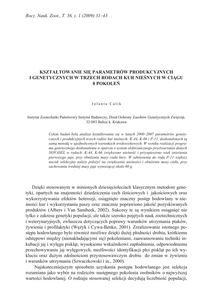 Rocz. Nauk. Zoot., T. 36, z. 1 (2009) 31–43 KSZTAŁTOWANIE SIĘ PARAMETRÓW PRODUKCYJNYCH I GENETYCZNYCH W TRZECH RODACH KUR NIEŚNYCH W CIĄGU 8 POKOLEŃ Jolanta Calik Instytut Zootechniki Państwowy Instytut Badawczy, Dział Ochrony Zasobów Genetycznych Zwierząt, 32-083 Balice k. Krakowa Celem badań była analiza kształtowania się w latach 2000–2007 parametrów genetycznych i produkcyjnych trzech rodów kur nieśnych: K-44, K-66 i P-11, doskonalonych tą samą metodą w ujednoliconych warunkach środowiskowych. W wyniku realizacji programu genetycznego doskonalenia w oparciu o system elektronicznego przetwarzania danych NOVASEL w rodach: K-44, K-66 zwiększono nieśność i przyspieszono wiek zniesienia pierwszego jaja, przy obniżeniu masy ciała kury. W odniesieniu do rodu P-11 większy nacisk selekcyjny należy położyć na zwiększenie nieśności i obniżenie masy ciała, przy zachowaniu średniej masy jaja wynoszącej około 60 g. Dzięki stosowanym w minionych dziesięcioleciach klasycznym metodom genetyki, opartych na znajomości dziedziczenia cech ilościowych i jakościowych oraz wykorzystywaniu efektów heterozji, osiągnięto znaczny postęp hodowlany w nieśności kur i wykorzystaniu paszy oraz znacznie poprawiono jakość pozyskiwanych produktów (Albers i Van Sambeek, 2002). Sukcesy te są wynikiem osiągnięć nie tylko z zakresu genetyki populacji, ale także szeroko pojętych nauk zootechnicznych i weterynaryjnych, zwłaszcza dotyczących poprawy warunków utrzymania ptaków, żywienia i profilaktyki (Wężyk i Cywa-Benko, 2001). Zrealizowanie istotnego postępu hodowlanego było również możliwe dzięki dużej płodności drobiu, krótkiemu odstępowi między (nienakładającymi się) pokoleniami, zaawansowaniu techniki inkubacji jaj i wylęgu piskląt, wysokiemu wskaźnikowi zapłodnienia, odpowiedniemu przechowywaniu jaj wylęgowych, możliwości identyfikacji płci piskląt po ich wykluciu oraz dużym zdolnościom przystosowawczym drobiu do zmian w żywieniu i warunków utrzymania (Szwaczkowski i in., 2000). Najskuteczniejszym sposobem uzyskania postępu hodowlanego jest selekcja rozumiana jako wybór na rodziców następnego pokolenia osobników o najwyższej wartości hodowlanej. O rodzaju stosowanej selekcji decydują liczebność populacji, 32 J. Calik wartość współczynnika odziedziczalności danej cechy oraz wartość współczynników korelacji genetycznych między doskonalonymi cechami. Zasadniczym skutkiem selekcji są zmiany frekwencji występowania genów i gamet. Wszystkie inne efekty selekcji, a mianowicie różnice w średnich wartościach cech i wielkościach wariancji oraz kowariancji, są tylko ich konsekwencją. Zmiany frekwencji genów są trwałe i utrzymują się przez kilka pokoleń po zaprzestaniu selekcji, aż do momentu, kiedy jej brak zacznie oddziaływać w innym kierunku (Wężyk i Jankowski, 2003). Aktualnie w Polsce, jak i w większości krajów europejskich, selekcja kur w stadach zarodowych opiera się na indeksie selekcyjnym zaproponowanym przez Hazela (1943), z pewnymi jego modyfikacjami, takimi jak system SELEKT (Wężyk, 1978) i system NOVASEL (Bednarczyk i in., 2000). Praca hodowlana prowadzona jest w miarę stabilnych warunkach środowiskowych w populacji o strukturze hierarchicznej, o stosunkowo dużej liczebności podklas – grup pełnego rodzeństwa. Zgromadzono bogate piśmiennictwo dotyczące oceny reakcji populacji na zastosowaną metodę selekcji. Prowadzone analizy obejmują jednak najczęściej względnie krótki, bo kilkupokoleniowy okres. Mniej badań przeprowadzono odnośnie kształtowania się wartości cech produkcyjnych i ich parametrów genetycznych, w selekcjonowanych taką samą metodą kilku rodów ptaków, utrzymywanych w takich samych lub zbliżonych warunkach środowiskowych na jednej fermie przez wiele pokoleń. Celem badań była analiza kształtowania się w latach 2000–2007 produkcyjności i parametrów genetycznych trzech rodów kur nieśnych: K-44, K-66 i P-11, doskonalonych tą samą metodą w ujednoliconych warunkach środowiskowych. Materiał i metody Materiał badawczy stanowiły zarodowe rody kur nieśnych: Rhode Island Red (K-44, K-66), Barred Rock (P-11), poddane w latach 2000–2007 genetycznemu doskonaleniu w Zarodowej Fermie Kur Nieśnych, w Dusznikach, należącej do Zakładu Doświadczalnego Instytutu Zootechniki PIB Zakrzewo sp. z o.o. W 18. tygodniu życia ptaki przeniesiono z wychowalni do kurnika, zachowując liczebność podaną w tabeli 1. Stosując wzory Wrighta (1931), obliczono tzw. efektywną liczebność populacji (Ne), czyli tempo eliminacji genów w wyniku działania losowego dryftu genetycznego i wzrost homozygotyczności stada (Fx), który jest odwrotnie proporcjonalny do efektywnej wielkości populacji. Rody kur utrzymywano intensywnym systemem chowu w budynkach wyposażonych w nowoczesne urządzenia technologiczne. W wychowie i chowie kury żywiono ad libitum standardowymi mieszankami pełnoporcjowymi. Wykorzystano identyfikację osobników na podstawie znaczków skrzydłowych z kodami kreskowymi z dekoderami i terminalami. System ten istotnie ogranicza możliwość popełnienia błędów podczas przeprowadzania indywidualnej kontroli użytkowości kur i znacznie zmniejsza jej pracochłonność, zwiększając równocześnie skuteczność pracy selekcyjnej (Bednarczyk i in., 2000). 299 268 36 36 36 36 36 36 38 2002 2003 2004 2005 2006 2007 297 254 202 258 265 253 45 2001 319 40 2000 667 632 779 770 488 587 640 599 842 matki córki mothers daughters Liczba/Number ojcowie sires x Lata Year Ród/Line K-44 131,68 128,53 128,43 126,12 122,22 126,37 126,78 152,82 142,17 Ne 0,38 0,39 0,39 0,39 0,41 0,40 0,39 0,33 0,35 Fx 37 35 36 36 36 35 36 45 40 233 252 264 225 159 196 242 221 305 590 642 614 584 399 449 532 767 734 ojcowie matki córki sires mothers daughters Liczba/Number Ród/Line K-66 128,29 122,93 126,72 124,14 117,42 118,79 125,35 149,55 141,45 Ne 0,39 