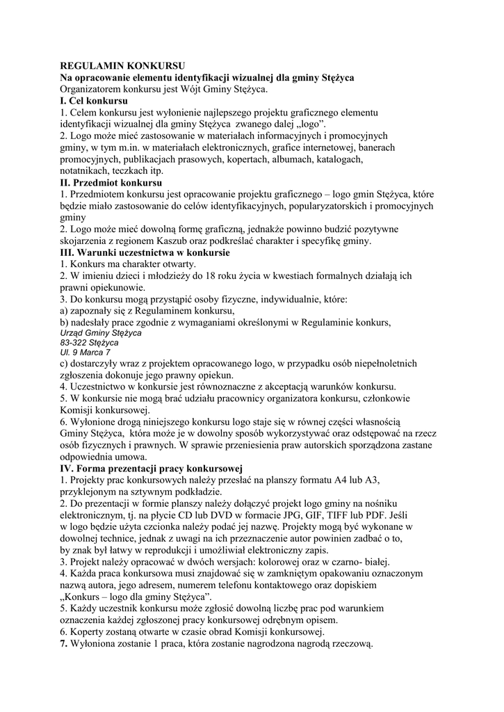 REGULAMIN KONKURSU Na opracowanie elementu identyfikacji wizualnej dla gminy Stężyca Organizatorem konkursu jest Wójt Gminy Stężyca. I. Cel konkursu 1. Celem konkursu jest wyłonienie najlepszego projektu graficznego elementu identyfikacji wizualnej dla gminy Stężyca zwanego dalej „logo”. 2. Logo może mieć zastosowanie w materiałach informacyjnych i promocyjnych gminy, w tym m.in. w materiałach elektronicznych, grafice internetowej, banerach promocyjnych, publikacjach prasowych, kopertach, albumach, katalogach, notatnikach, teczkach itp. II. Przedmiot konkursu 1. Przedmiotem konkursu jest opracowanie projektu graficznego – logo gmin Stężyca, które będzie miało zastosowanie do celów identyfikacyjnych, popularyzatorskich i promocyjnych gminy 2. Logo może mieć dowolną formę graficzną, jednakże powinno budzić pozytywne skojarzenia z regionem Kaszub oraz podkreślać charakter i specyfikę gminy. III. Warunki uczestnictwa w konkursie 1. Konkurs ma charakter otwarty. 2. W imieniu dzieci i młodzieży do 18 roku życia w kwestiach formalnych działają ich prawni opiekunowie. 3. Do konkursu mogą przystąpić osoby fizyczne, indywidualnie, które: a) zapoznały się z Regulaminem konkursu, b) nadesłały prace zgodnie z wymaganiami określonymi w Regulaminie konkurs, Urząd Gminy Stężyca 83-322 Stężyca Ul. 9 Marca 7 c) dostarczyły wraz z projektem opracowanego logo, w przypadku osób niepełnoletnich zgłoszenia dokonuje jego prawny opiekun. 4. Uczestnictwo w konkursie jest równoznaczne z akceptacją warunków konkursu. 5. W konkursie nie mogą brać udziału pracownicy organizatora konkursu, członkowie Komisji konkursowej. 6. Wyłonione drogą niniejszego konkursu logo staje się w równej części własnością Gminy Stężyca, która może je w dowolny sposób wykorzystywać oraz odstępować na rzecz osób fizycznych i prawnych. W sprawie przeniesienia praw autorskich sporządzona zastane odpowiednia umowa. IV. Forma prezentacji pracy konkursowej 1. Projekty prac konkursowych należy przesłać na planszy formatu A4 lub A3, przyklejonym na sztywnym podkładzie. 2. Do prezentacji w formie planszy należy dołączyć projekt logo gminy na nośniku elektronicznym, tj. na płycie CD lub DVD w formacie JPG, GIF, TIFF lub PDF. Jeśli w logo będzie użyta czcionka należy podać jej nazwę. Projekty mogą być wykonane w dowolnej technice, jednak z uwagi na ich przeznaczenie autor powinien zadbać o to, by znak był łatwy w reprodukcji i umożliwiał elektroniczny zapis. 3. Projekt należy opracować w dwóch wersjach: kolorowej oraz w czarno- białej. 4. Każda praca konkursowa musi znajdować się w zamkniętym opakowaniu oznaczonym nazwą autora, jego adresem, numerem telefonu kontaktowego oraz dopiskiem „Konkurs – logo dla gminy Stężyca”. 5. Każdy uczestnik konkursu może zgłosić dowolną liczbę prac pod warunkiem oznaczenia każdej zgłoszonej pracy konkursowej odrębnym opisem. 6. Koperty zostaną otwarte w czasie obrad Komisji konkursowej. 7. Wyłoniona zostanie 1 praca, która zostanie nagrodzona nagrodą rzeczową. V. Miejsce i termin składania prac konkursowych. 1. Prace konkursowe należy nadesłać przesyłką poleconą na adres: Urząd Gminy Stężyca, 83322 Stężyca, ul. 9 Marca 7 (obowiązuje data stempla pocztowego) lub składać w sekretariacie Urzędu Gminy Stężyca w godzinach urzędowania do dnia 15 czerwca 2010 roku. 3. Prace konkursowe nie spełniające wymagań , o których mowa w Regulaminie konkursu lub dostarczone po upływie terminu, nie będą podlegały ocenie Jury. VI. Kryteria oceny prac konkursowych Prace konkursowe oceniane będą zgodnie z następującymi kryteriami oceny: a) wartości projektowe: oddanie charakteru gminy Stężyca, b) wartości marketingowe: wywoływanie pozytywnych skojarzeń, łatwość rozpoznania i zapamiętania, c) wartości użytkowe: niezależność od nośnika i środka powielania oraz przekazu, łatwa czytelność w różnych skalach, funkcjonowanie w wersji czarno- białej i barwnej (w tym jako grafika komputerowa). VII. Zasady przyznawania nagród 1. Wyboru laureata konkursu na projekt graficzny logo gminy dokonuje Komisja konkursowa 2. Komisja konkursowa dokonuje oceny prac konkursowych zgodnie z kryteriami oceny, o których mowa w Regulaminie konkursu i wskazuje uczestnika konkursu, któremu zostanie przyznana nagroda, 3. Uczestnikom konkursu nie przysługuje prawo odwołania. 5. Komisja konkursowa zastrzega sobie prawo do nie rozstrzygnięcia konkursu. VIII. Rozstrzygnięcie konkursu 1. Planowana data ogłoszenia wyników konkursu do dnia 30 czerwca 2010 r. 2. Wyniki konkursu zostaną podane do wiadomości publicznej na stronie internetowej gminy. O terminie i miejscu wręczeniu nagrody laureat konkursu zostanie powiadomieni odrębnie. IX. Prawa autorskie Prawa autorskie do nagrodzonej pracy przechodzą na własność Gminy Stężyca w momencie przekazania nagrody. Zwycięzcy nie przysługuje żadne dalsze wynagrodzenie z tytułu wykorzystywania przez gminę stworzonego znaku graficznego – „logo”. X. Miejsce organizacji konkursu Urząd Gminy Stężyca 83-322 Stężyca ul. 9 Marca 7 Tel. 058 685-63-31 e-mail: [email protected] XI. Postanowienia końcowe 1. Organizator konkursu nie ponosi odpowiedzialności za usługi pocztowe, kurierskie lub usługi poczty elektronicznej, z których korzystać będą uczestnicy konkursu. 2. Organizator przewiduje możliwość zmiany Regulaminu konkursu, przerwania lub odwołania konkursu z ważnych przyczyn.