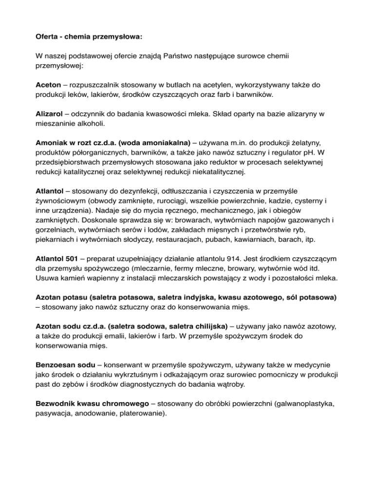 Oferta - chemia przemysłowa:" ! W naszej podstawowej ofercie znajdą Państwo następujące surowce chemii przemysłowej:! ! Aceton – rozpuszczalnik stosowany w butlach na acetylen, wykorzystywany także do produkcji leków, lakierów, środków czyszczących oraz farb i barwników.! ! Alizarol – odczynnik do badania kwasowości mleka. Skład oparty na bazie alizaryny w mieszaninie alkoholi.! ! Amoniak w rozt cz.d.a. (woda amoniakalna) – używana m.in. do produkcji żelatyny, produktów półorganicznych, barwników, a także jako nawóz sztuczny i regulator pH. W przedsiębiorstwach przemysłowych stosowana jako reduktor w procesach selektywnej redukcji katalitycznej oraz selektywnej redukcji niekatalitycznej.! ! Atlantol – stosowany do dezynfekcji, odtłuszczania i czyszczenia w przemyśle żywnościowym (obwody zamknięte, rurociągi, wszelkie powierzchnie, kadzie, cysterny i inne urządzenia). Nadaje się do mycia ręcznego, mechanicznego, jak i obiegów zamkniętych. Doskonale sprawdza się w: browarach, wytwórniach napojów gazowanych i gorzelniach, wytwórniach serów i lodów, zakładach mięsnych i przetwórstwie ryb, piekarniach i wytwórniach słodyczy, restauracjach, pubach, kawiarniach, barach, itp.! ! Atlantol 501 – preparat uzupełniający działanie atlantolu 914. Jest środkiem czyszczącym dla przemysłu spożywczego (mleczarnie, fermy mleczne, browary, wytwórnie wód itd. Usuwa kamień wapienny z instalacji mleczarskich powstający z wody i pozostałości mleka.! ! Azotan potasu (saletra potasowa, saletra indyjska, kwasu azotowego, sól potasowa) – stosowany jako nawóz sztuczny oraz do konserwowania mięs.! ! Azotan sodu cz.d.a. (saletra sodowa, saletra chilijska) – używany jako nawóz azotowy, a także do produkcji emalii, lakierów i farb. W przemyśle spożywczym środek do konserwowania mięs.! ! Benzoesan sodu – konserwant w przemyśle spożywczym, używany także w medycynie jako środek o działaniu wykrztuśnym i odkażającym oraz surowiec pomocniczy w produkcji past do zębów i środków diagnostycznych do badania wątroby.! ! Bezwodnik kwasu chromowego – stosowany do obróbki powierzchni (galwanoplastyka, pasywacja, anodowanie, platerowanie).! ! Borax 10 wodny – składnik nawozów mineralnych stosowany w przemyśle szklarskim i ceramicznym, do lutowania, w przemyśle kosmetycznym i środków piorących, w laboratoriach chemicznych, stosowany także jako substancja buforowa! ! Borax 5 wodny – jw.! ! Chlorek poliglinu – stosowany do uzdatniania wody pitnej i przemysłowej, powierzchniowej i podziemnej, a także do oczyszczania ścieków przemysłowych.! ! Chlorek potasu – wykorzystywany jako nawóz potasowy, a także jako składnik soli do posypywania dróg w zimie.! ! Chlorek sodu (sól warzona/kamienna) – środek spożywczy i dom konserwacji żywności, stosowany także w garbarstwie, przemyśle szklarskim, w spektrospkopii, chłodnictwie i jako surowiec do otrzymywania innych związków chemicznych.! ! Chlorek sodu w tabletkach – jw.! Chlorek wapnia (stały i w r-r) – stosowany jako środek osuszający i do sporządzania mieszanin oziębiających.! ! Chlorek żelaza (II) i (III) (żelaza chlorek, trójchlorek żelaza) – stosowany do uzdatniania ścieków i wody, w hutnictwie do przerobu rud miedzi i srebra, jako zaprawa w farbiarstwie, w przemyśle organicznym jako łagodny środek utleniający i jako środek kondensacyjny podczas chlorowania, katalizator w lecznictwie do tamowania krwi, do wyrobu błękitu berlińskieg, do wyrobu farb i atramentu.! ! Chlorosiarczan żelaza – przydatny do oczyszczania ścieków i uzdatniania wody pitnej.! ! Clovin RS – proszek do mycia i czyszczenia w przemyśle rolno-spożywczym oraz do zamaczania bielizny w procesie prania.! ! Czterochloroetylen – rozpuszczalnik tłuszczów, żywic, wosków, służyb także do czyszczenia i prania wyrobów z włókien naturalnych, syntetycznych i ich mieszanek. W przemyśle metalowym, precyzyjnym i motoryzacyjnym stosowany sprawdza się jako środek odtłuszczający (odtłuszczanie metali) i jako środek ekstrakcyjny! ! Dwuchloroeten – stosowany m.in. jako rozpuszczalnik.! ! Dwuchromian potasu – utleniacz w przemyśle chemicznym i preparatyce laboratoryjnej, stosowany także w elektrolizie, do produkcji barwników, w pirotechnice, wyrobie szkła, klejów, farbiarstwie, w litografii i fotografii oraz w przemyśle ceramicznym.! ! Dwukrzemian sodowy – użyteczny w przemyśle chemicznym i w chemii gospodarczej.! ! Esencja octowa E260 – stosowana w przemyśle spożywczym do sporządzania roztworu kwasu octowego wykorzystywanego przy produkcji żywności! Fluorokrzemian sodowy – stosowany jako środek owadobójczy i do fluorowania wody.! ! Formalina – znajduje bogate zastosowania w wielu rodzajach przemysłu chemicznego, tworzyw sztucznych i gumy, produkcji papieru i wielu innych. Dzięki swej silnej bakteriobójczości sprawdza się w konserwacji i przechowywaniu preparatów biologicznych.! Fosforan dwuamonowy – stosowany m.in. jako nawóz oraz jako pożywka przy produkcji win.! ! Fosforan dwuwapniowy – wykorzystywany jako suplement diety i źródło wapnia oraz zagęstnik iśrodek spulchniający do ciasta. Znajduje zastosowanie również w produktach stomatologicznych i medycznych, w tworzywach sztucznych i nawozach oraz przy produkcji szkła.! ! Fosforan jednowapniowy – składnik nawozów, proszków do pieczenia oraz suplement diety i stabilizator tworzyw sztucznych.! ! Fosforan sodu (ortofosforan trójsodowy, fosforan trisodowy) – jest stosowany głównie jako środek do zmiękczania wody, do produkcji środków myjących, papieru i w przemyśle galwanotechnicznym.! ! Fosforan trójsodowy – doskonała pożywka dla drożdży gorzelniczych i winiarskich, zwiększa wydajność drożdży i skraca czas fermentacji! ! Glikol – stosowany w instalacjach chłodniczych, a także w płynach do chłodnic. Wykorzystywany również prz