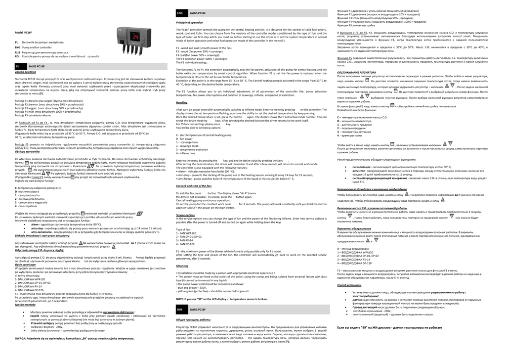 ENG SALUS PC16F Principle of operation Model PC16F PL Sterownik do pompy i wentylatora. ENG Pump and fan controller. RUS Регулятор для вентилятора и насоса RO Controle pentru pompa de reciruclare si ventilatorul cazanului PL The PC16F controller controls the pump for the central heating and fan. It is designed for the control of solid fuel boilers, wood, coal and Culm. You can choose from five versions of the controller modes conditioned by the type of fuel and the type of boiler. As first step which you must do before starting to use the driver is to set the system temperature in normal mode of boiler operation and select fuel operation mode of the controller in the menu (F). F1 - wood and coal (smooth power of the fan). F2 - wood (fan power 20% + scavenge). F3 coal (fan power 50% + scavenge). The F4 culm (fan power 100% + scavenge). The F5 individual settings. SALUS PC16F Zasada działania Sterownik PC16F steruje pompą C.O. oraz wentylatorem nadmuchowym. Przeznaczony jest do sterowania kotłami na paliwo stałe, drewno, węgiel, miał. Użytkownik ma do wyboru 5 wersji trybów pracy sterownika uwarunkowanych rodzajem opału oraz typem kotła. Pierwszą czynnośd jaką musi wykonad użytkownik przed rozpoczęciem eksploatacji sterownika jest ustawienie temperatury na wyjściu pieca, jaką ma utrzymywad sterownik podczas pracy kotła oraz wybrad tryb pracy sterownika w menu (F). Funkcja F1 drewno oraz węgiel (płynna moc dmuchawy) Funkcja F2 drewno (moc dmuchawy 20% + przedmuchy) Funkcja F3 węgiel (moc dmuchawy 50% + przedmuchy) Funkcja F4 miał (moc dmuchawy 100% + przedmuchy) Funkcja F5 ustawienia własne W funkcjach od F1 do F4 , tj. moc dmuchawy, temperaturę załączenia pompy C.O. oraz temperaturę wygasania pieca, sterownik dostosowuje automatycznie dzięki zastosowaniu algorytmu control smart. Moc dmuchawy jest zmniejszana w funkcji F1, kiedy temperatura kotła zbliża się do zadanej przez użytkownika temperatury pieca. Wygaszanie kotła mieści się w przedziale od 35 °C do 50 °C. Pompa C.O. jest załączana w przedziale od 30 °C do 40 °C, w zależności od zadanej temperatury pieca. Funkcja F5 pozwala na indywidualne regulowanie wszystkich parametrów pracy sterownika tj.: temperaturą załączenia pompy C.O, mocą wentylatora przerwami i czasem przedmuchu, temperaturą rozpalania oraz czasem wygaszania kotła. Obsługa sterownika Po włączeniu zasilania sterownik automatycznie przechodzi w tryb rozpalania. Do menu sterownika wchodzimy naciskając klawisz . Na wyświetlaczu pojawi się pulsująca temperatura zadana kotła, mamy wówczas możliwośd ustawienia żądanej temperatury jaką sterownik ma utrzymywad – klawiszami .Po ustawieniu żądanej temperatury ponownie wciskamy przycisk . . Na wyświetlaczu pojawi się F oraz wybrany aktualnie numer funkcji. Następnie wybieramy funkcję, która nas interesuje klawiszami . Po wybraniu żądanej funkcji sterownik sam wróci do pracy. W przypadku funkcji F5 należy wcisnąd klawisz aby przejśd do indywidualnych ustawieo użytkownika. Pojawią się nam kolejno funkcje: C -temperatura załączenia pompy C.O. D -moc wentylatora 1 -czas przedmuchu 2 -przerwa przedmuchu 3 -temperatura wygasania 4 -czas rozpalania Wejście do menu następuje po przyciśnięciu przycisku , natomiast wartości ustawiamy klawiszami . Po ustawieniu żądanych wartości sterownik zapamięta je i po kilku sekundach sam wróci do pracy. Sterownik dodatkowo wyposażony jest w następujące funkcje: alarm - sygnalizuje zbyt wysoką temperaturę kotła (90 °C), anty-stop - zapobiega zastaniu się pompy poza sezonem grzewczym uruchamiając ją co 14 dni na 15 sekund, anty-zamarzanie - załącza pompę C.O. w przypadku gdy temperatura cieczy w obiegu spadnie poniżej 5 °C. Blokada Dmuchawy i start pracy dmuchawy: Aby zablokowad wentylator należy wcisnąd przycisk . Na wyświetlaczu pojawi się komunikat do F (menu w tym czasie nie jest dostępne). Aby odblokowad dmuchawę należy ponownie wcisnąd przycisk . Załączenie pompy C.O. do pracy ciągłej: Aby załączyd pompę C.O. do pracy ciągłej należy wcisnąd i przytrzymad przez około 3 sek. klawisz Pompa będzie pracowad do chwili aż użytkownik ponownie przytrzyma klawisz lub do wyłączenia zasilania głównym wyłącznikiem. Opcje serwisowe W opcjach serwisowych można zmienid typ i moc dmuchawy podczas rozpalania. Wejście w opcje serwisowe jest możliwe po wyłączeniu zasilania i po ponownym włączeniu przy jednoczesnym przytrzymaniu klawiszy . d- to typ dmuchawy: 1- DMUCHAWA WPA120 2- DMUCHAWA DP-01, DP-02 3- DMUCHAWA RV-14 4- DMUCHAWA DP-120 F1 - maksymalna moc dmuchawy podczas rozpalania tylko dla funkcji F1 w menu. Po ustawieniu typu i mocy dmuchawy, sterownik automatycznie przejdzie do pracy na zadanych w opcjach serwisowych parametrach, po 5 sekundach. Sposób montażu Montażu powinna dokonad osoba posiadająca odpowiednie uprawnienia elektryczne! Czujnik należy umocowad na wyjściu z kotła przy pomocy opaski zaciskowej i odizolowad od czynników zewnętrznych za pomocą taśmy izolacyjnej (nie może byd zanurzony w żadnym płynie). Przewód zasilający pompę powinien byd podłączony w następujący sposób: niebieski i brązowy - 230V, żółto-zielony (ochronny) - powinien byd podłączony do masy UWAGA: Pojawienie się na wyświetlaczu komunikatu „99” oznacza awarię czujnika temperatury. The functions F1 to F4, the controller automatically sets the fan power, activation of the pump for central heating and the boiler extinction temperature by smart control algorithm. When function F1 is set the fan power is reduced when the temperature is close to the set by user boiler temperature. Extinction of the boiler is in the range from 35 ° C to 50 ° C. The Central heating pump is activated in the range from 30 ° C to 40 ° C, depending on the desired boiler temperature. The F5 function allows you to set individual adjustment of all parameter
