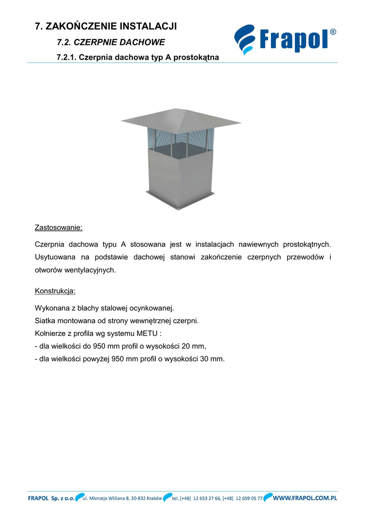 7. ZAKOŃCZENIE INSTALACJI 7.2. CZERPNIE DACHOWE 7.2.1. Czerpnia dachowa typ A prostokątna Zastosowanie: Czerpnia dachowa typu A stosowana jest w instalacjach nawiewnych prostokątnych. Usytuowana na podstawie dachowej stanowi zakończenie czerpnych przewodów i otworów wentylacyjnych. Konstrukcja: Wykonana z blachy stalowej ocynkowanej. Siatka montowana od strony wewnętrznej czerpni. Kołnierze z profila wg systemu METU : - dla wielkości do 950 mm profil o wysokości 20 mm, - dla wielkości powyżej 950 mm profil o wysokości 30 mm. 7. ZAKOŃCZENIE INSTALACJI 7.2. CZERPNIE DACHOWE 7.2.1. Czerpnia dachowa typ A prostokątna Główne wymiary czerpni dachowych typu A Wielkość a x b [mm] 300 x 300 400 x 400 500 x 500 600 x 600 800 x 800 1000 x 1000 1200 x 1200 c 540 720 900 1080 1280 1560 1840 d 540 720 900 1080 1280 1560 1840 e [mm] 180 240 300 360 480 600 720 h 570 660 750 840 1020 1200 1380 Ciężar [kg] 9,85 14,75 20,45 27,10 37,05 55,00 73,80 7. ZAKOŃCZENIE INSTALACJI 7.2. CZERPNIE DACHOWE 7.2.1. Czerpnia dachowa typ A prostokątna Przykład zamówienia: