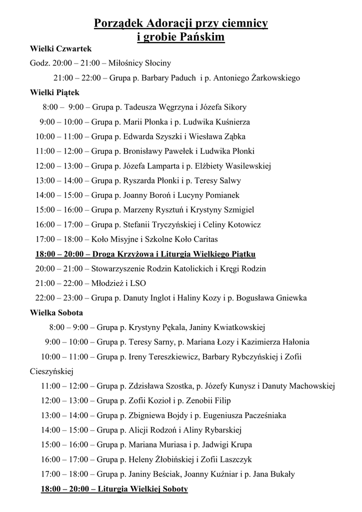 Porządek Adoracji przy ciemnicy i grobie Pańskim Wielki Czwartek Godz. 20:00 – 21:00 – Miłośnicy Słociny 21:00 – 22:00 – Grupa p. Barbary Paduch i p. Antoniego Żarkowskiego Wielki Piątek 8:00 – 9:00 – Grupa p. Tadeusza Węgrzyna i Józefa Sikory 9:00 – 10:00 – Grupa p. Marii Płonka i p. Ludwika Kuśnierza 10:00 – 11:00 – Grupa p. Edwarda Szyszki i Wiesława Ząbka 11:00 – 12:00 – Grupa p. Bronisławy Pawełek i Ludwika Płonki 12:00 – 13:00 – Grupa p. Józefa Lamparta i p. Elżbiety Wasilewskiej 13:00 – 14:00 – Grupa p. Ryszarda Płonki i p. Teresy Salwy 14:00 – 15:00 – Grupa p. Joanny Boroń i Lucyny Pomianek 15:00 – 16:00 – Grupa p. Marzeny Rysztuń i Krystyny Szmigiel 16:00 – 17:00 – Grupa p. Stefanii Tryczyńskiej i Celiny Kotowicz 17:00 – 18:00 – Koło Misyjne i Szkolne Koło Caritas 18:00 – 20:00 – Droga Krzyżowa i Liturgia Wielkiego Piątku 20:00 – 21:00 – Stowarzyszenie Rodzin Katolickich i Kręgi Rodzin 21:00 – 22:00 – Młodzież i LSO 22:00 – 23:00 – Grupa p. Danuty Inglot i Haliny Kozy i p. Bogusława Gniewka Wielka Sobota 8:00 – 9:00 – Grupa p. Krystyny Pękala, Janiny Kwiatkowskiej 9:00 – 10:00 – Grupa p. Teresy Sarny, p. Mariana Łozy i Kazimierza Hałonia 10:00 – 11:00 – Grupa p. Ireny Tereszkiewicz, Barbary Rybczyńskiej i Zofii Cieszyńskiej 11:00 – 12:00 – Grupa p. Zdzisława Szostka, p. Józefy Kunysz i Danuty Machowskiej 12:00 – 13:00 – Grupa p. Zofii Kozioł i p. Zenobii Filip 13:00 – 14:00 – Grupa p. Zbigniewa Bojdy i p. Eugeniusza Pacześniaka 14:00 – 15:00 – Grupa p. Alicji Rodzoń i Aliny Rybarskiej 15:00 – 16:00 – Grupa p. Mariana Muriasa i p. Jadwigi Krupa 16:00 – 17:00 – Grupa p. Heleny Żłobińskiej i Zofii Laszczyk 17:00 – 18:00 – Grupa p. Janiny Beściak, Joanny Kuźniar i p. Jana Bukały 18:00 – 20:00 – Liturgia Wielkiej Soboty
