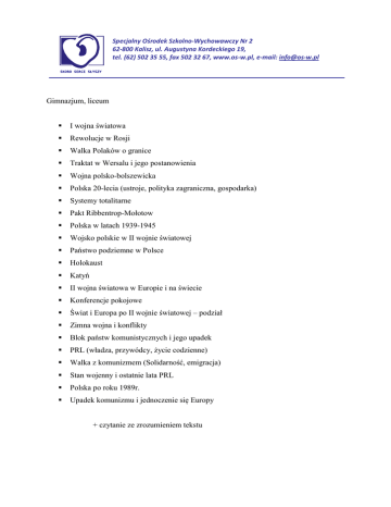 Specjalny Ośrodek Szkolno-Wychowawczy Nr 2 62-800 Kalisz, ul. Augustyna Kordeckiego 19, tel. (62) 502 35 55, fax 502 32 67, www.os-w.pl, e-mail: [email protected] SKORO SERCE SŁYSZY Gimnazjum, liceum I wojna światowa Rewolucje w Rosji Walka Polaków o granice Traktat w Wersalu i jego postanowienia Wojna polsko-bolszewicka Polska 20-lecia (ustroje, polityka zagraniczna, gospodarka) Systemy totalitarne Pakt Ribbentrop-Mołotow Polska w latach 1939-1945 Wojsko polskie w II wojnie światowej Państwo podziemne w Polsce Holokaust Katyń II wojna światowa w Europie i na świecie Konferencje pokojowe Świat i Europa po II wojnie światowej – podział Zimna wojna i konflikty Blok państw komunistycznych i jego upadek PRL (władza, przywódcy, życie codzienne) Walka z komunizmem (Solidarność, emigracja) Stan wojenny i ostatnie lata PRL Polska po roku 1989r. Upadek komunizmu i jednoczenie się Europy + czytanie ze zrozumieniem tekstu