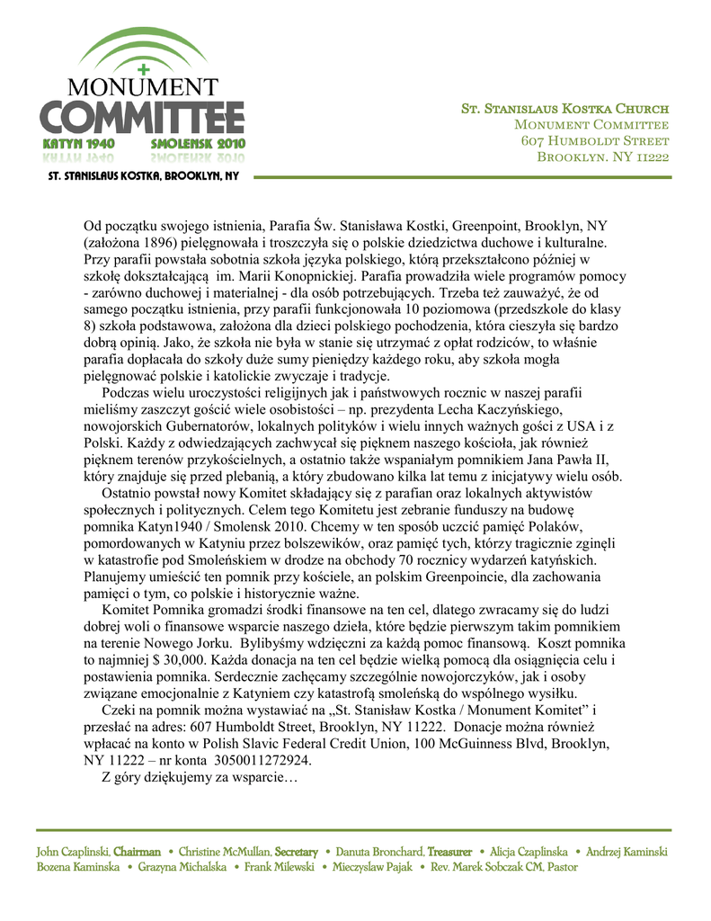 St. Stanislaus Kostka Church Monument Committee 607 Humboldt Street Brooklyn. NY 11222 Od początku swojego istnienia, Parafia Św. Stanisława Kostki, Greenpoint, Brooklyn, NY (założona 1896) pielęgnowała i troszczyła się o polskie dziedzictwa duchowe i kulturalne. Przy parafii powstała sobotnia szkoła języka polskiego, którą przekształcono później w szkołę dokształcającą im. Marii Konopnickiej. Parafia prowadziła wiele programów pomocy - zarówno duchowej i materialnej - dla osób potrzebujących. Trzeba też zauważyć, że od samego początku istnienia, przy parafii funkcjonowała 10 poziomowa (przedszkole do klasy 8) szkoła podstawowa, założona dla dzieci polskiego pochodzenia, która cieszyła się bardzo dobrą opinią. Jako, że szkoła nie była w stanie się utrzymać z opłat rodziców, to właśnie parafia dopłacała do szkoły duże sumy pieniędzy każdego roku, aby szkoła mogła pielęgnować polskie i katolickie zwyczaje i tradycje. Podczas wielu uroczystości religijnych jak i państwowych rocznic w naszej parafii mieliśmy zaszczyt gościć wiele osobistości – np. prezydenta Lecha Kaczyńskiego, nowojorskich Gubernatorów, lokalnych polityków i wielu innych ważnych gości z USA i z Polski. Każdy z odwiedzających zachwycał się pięknem naszego kościoła, jak również pięknem terenów przykościelnych, a ostatnio także wspaniałym pomnikiem Jana Pawła II, który znajduje się przed plebanią, a który zbudowano kilka lat temu z inicjatywy wielu osób. Ostatnio powstał nowy Komitet składający się z parafian oraz lokalnych aktywistów społecznych i politycznych. Celem tego Komitetu jest zebranie funduszy na budowę pomnika Katyn1940 / Smolensk 2010. Chcemy w ten sposób uczcić pamięć Polaków, pomordowanych w Katyniu przez bolszewików, oraz pamięć tych, którzy tragicznie zginęli w katastrofie pod Smoleńskiem w drodze na obchody 70 rocznicy wydarzeń katyńskich. Planujemy umieścić ten pomnik przy kościele, an polskim Greenpoincie, dla zachowania pamięci o tym, co polskie i historycznie ważne. Komitet Pomnika gromadzi środki finansowe na ten cel, dlatego zwracamy się do ludzi dobrej woli o finansowe wsparcie naszego dzieła, które będzie pierwszym takim pomnikiem na terenie Nowego Jorku. Bylibyśmy wdzięczni za każdą pomoc finansową. Koszt pomnika to najmniej $ 30,000. Każda donacja na ten cel będzie wielką pomocą dla osiągnięcia celu i postawienia pomnika. Serdecznie zachęcamy szczególnie nowojorczyków, jak i osoby związane emocjonalnie z Katyniem czy katastrofą smoleńską do wspólnego wysiłku. Czeki na pomnik można wystawiać na „St. Stanisław Kostka / Monument Komitet” i przesłać na adres: 607 Humboldt Street, Brooklyn, NY 11222. Donacje można również wpłacać na konto w Polish Slavic Federal Credit Union, 100 McGuinness Blvd, Brooklyn, NY 11222 – nr konta 3050011272924. Z góry dziękujemy za wsparcie… John Czaplinski, Chairman • Christine McMullan, Secretary • Danuta Bronchard, Treasurer • Alicja Czaplinska • Andrzej Kaminski Bozena Kaminska • Grazyna Michalska • Frank Milewski • Mieczyslaw Pajak • Rev. Marek Sobczak CM, Pastor