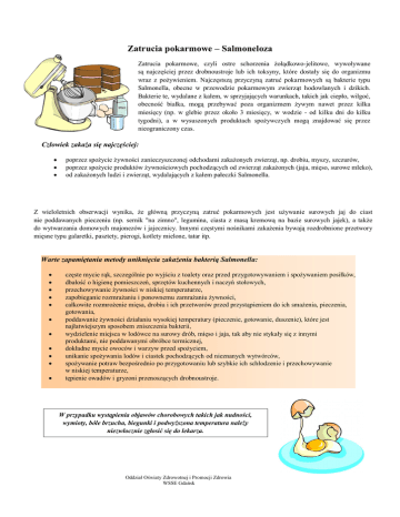 Zatrucia pokarmowe – Salmoneloza Zatrucia pokarmowe, czyli ostre schorzenia żołądkowo-jelitowe, wywoływane są najczęściej przez drobnoustroje lub ich toksyny, które dostały się do organizmu wraz z pożywieniem. Najczęstszą przyczyną zatruć pokarmowych są bakterie typu Salmonella, obecne w przewodzie pokarmowym zwierząt hodowlanych i dzikich. Bakterie te, wydalane z kałem, w sprzyjających warunkach, takich jak ciepło, wilgoć, obecność białka, mogą przebywać poza organizmem żywym nawet przez kilka miesięcy (np. w glebie przez około 3 miesięcy, w wodzie - od kilku dni do kilku tygodni), a w wysuszonych produktach spożywczych mogą znajdować się przez nieograniczony czas. Człowiek zakaża się najczęściej: poprzez spożycie żywności zanieczyszczonej odchodami zakażonych zwierząt, np. drobiu, myszy, szczurów, poprzez spożycie produktów żywnościowych pochodzących od zwierząt zakażonych (jaja, mięso, surowe mleko), od zakażonych ludzi i zwierząt, wydalających z kałem pałeczki Salmonella. Z wieloletnich obserwacji wynika, że główną przyczyną zatruć pokarmowych jest używanie surowych jaj do ciast nie poddawanych pieczeniu (np. sernik "na zimno", legumina, ciasta z masą kremową na bazie surowych jajek), a także do wytwarzania domowych majonezów i jajecznicy. Innymi częstymi nośnikami zakażenia bywają rozdrobnione przetwory mięsne typu galaretki, pasztety, pierogi, kotlety mielone, tatar itp. Warte zapamiętania metody uniknięcia zakażenia bakterią Salmonella: częste mycie rąk, szczególnie po wyjściu z toalety oraz przed przygotowywaniem i spożywaniem posiłków, dbałość o higienę pomieszczeń, sprzętów kuchennych i naczyń stołowych, przechowywanie żywności w niskiej temperaturze, zapobieganie rozmrażaniu i ponownemu zamrażaniu żywności, całkowite rozmrożenie mięsa, drobiu i ich przetworów przed przystąpieniem do ich smażenia, pieczenia, gotowania, poddawanie żywności działaniu wysokiej temperatury (pieczenie, gotowanie, duszenie), które jest najłatwiejszym sposobem zniszczenia bakterii, wydzielenie miejsca w lodówce na surowy drób, mięso i jaja, tak aby nie stykały się z innymi produktami, nie poddawanymi obróbce termicznej, dokładne mycie owoców i warzyw przed spożyciem, unikanie spożywania lodów i ciastek pochodzących od nieznanych wytwórców, spożywanie potraw bezpośrednio po przygotowaniu lub szybkie ich schłodzenie i przechowywanie w niskiej temperaturze, tępienie owadów i gryzoni przenoszących drobnoustroje. W przypadku wystąpienia objawów chorobowych takich jak nudności, wymioty, bóle brzucha, biegunki i podwyższona temperatura należy niezwłocznie zgłosić się do lekarza. Oddział Oświaty Zdrowotnej i Promocji Zdrowia WSSE Gdańsk