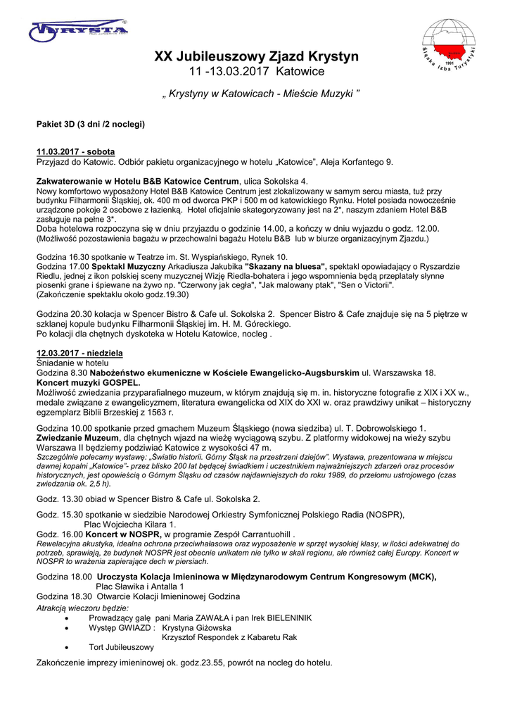 XX Jubileuszowy Zjazd Krystyn 11 -13.03.2017 Katowice „ Krystyny w Katowicach - Mieście Muzyki ” Pakiet 3D (3 dni /2 noclegi) 11.03.2017 - sobota Przyjazd do Katowic. Odbiór pakietu organizacyjnego w hotelu „Katowice”, Aleja Korfantego 9. Zakwaterowanie w Hotelu B&B Katowice Centrum, ulica Sokolska 4. Nowy komfortowo wyposażony Hotel B&B Katowice Centrum jest zlokalizowany w samym sercu miasta, tuż przy budynku Filharmonii Śląskiej, ok. 400 m od dworca PKP i 500 m od katowickiego Rynku. Hotel posiada nowocześnie urządzone pokoje 2 osobowe z łazienką. Hotel oficjalnie skategoryzowany jest na 2*, naszym zdaniem Hotel B&B zasługuje na pełne 3*. Doba hotelowa rozpoczyna się w dniu przyjazdu o godzinie 14.00, a kończy w dniu wyjazdu o godz. 12.00. (Możliwość pozostawienia bagażu w przechowalni bagażu Hotelu B&B lub w biurze organizacyjnym Zjazdu.) Godzina 16.30 spotkanie w Teatrze im. St. Wyspiańskiego, Rynek 10. Godzina 17.00 Spektakl Muzyczny Arkadiusza Jakubika "Skazany na bluesa", spektakl opowiadający o Ryszardzie Riedlu, jednej z ikon polskiej sceny muzycznej Wizję Riedla-bohatera i jego wspomnienia będą przeplatały słynne piosenki grane i śpiewane na żywo np. "Czerwony jak cegła", "Jak malowany ptak", "Sen o Victorii". (Zakończenie spektaklu około godz.19.30) Godzina 20.30 kolacja w Spencer Bistro & Cafe ul. Sokolska 2. Spencer Bistro & Cafe znajduje się na 5 piętrze w szklanej kopule budynku Filharmonii Śląskiej im. H. M. Góreckiego. Po kolacji dla chętnych dyskoteka w Hotelu Katowice, nocleg . 12.03.2017 - niedziela Śniadanie w hotelu Godzina 8.30 Nabożeństwo ekumeniczne w Kościele Ewangelicko-Augsburskim ul. Warszawska 18. Koncert muzyki GOSPEL. Możliwość zwiedzania przyparafialnego muzeum, w którym znajdują się m. in. historyczne fotografie z XIX i XX w., medale związane z ewangelicyzmem, literatura ewangelicka od XIX do XXI w. oraz prawdziwy unikat – historyczny egzemplarz Biblii Brzeskiej z 1563 r. Godzina 10.00 spotkanie przed gmachem Muzeum Śląskiego (nowa siedziba) ul. T. Dobrowolskiego 1. Zwiedzanie Muzeum, dla chętnych wjazd na wieżę wyciągową szybu. Z platformy widokowej na wieży szybu Warszawa II będziemy podziwiać Katowice z wysokości 47 m. Szczególnie polecamy wystawę: „Światło historii. Górny Śląsk na przestrzeni dziejów”. Wystawa, prezentowana w miejscu dawnej kopalni „Katowice”- przez blisko 200 lat będącej świadkiem i uczestnikiem najważniejszych zdarzeń oraz procesów historycznych, jest opowieścią o Górnym Śląsku od czasów najdawniejszych do roku 1989, do przełomu ustrojowego (czas zwiedzania ok. 2,5 h). Godz. 13.30 obiad w Spencer Bistro & Cafe ul. Sokolska 2. Godz. 15.30 spotkanie w siedzibie Narodowej Orkiestry Symfonicznej Polskiego Radia (NOSPR), Plac Wojciecha Kilara 1. Godz. 16.00 Koncert w NOSPR, w programie Zespół Carrantuohill . Rewelacyjna akustyka, idealna ochrona przeciwhałasowa oraz wyposażenie w sprzęt wysokiej klasy, w ilości adekwatnej do potrzeb, sprawiają, że budynek NOSPR jest obecnie unikatem nie tylko w skali regionu, ale również całej Europy. Koncert w NOSPR to wrażenia zapierające dech w piersiach. Godzina 18.00 Uroczysta Kolacja Imieninowa w Międzynarodowym Centrum Kongresowym (MCK), Plac Sławika i Antalla 1 Godzina 18.30 Otwarcie Kolacji Imieninowej Godzina Atrakcją wieczoru będzie: Prowadzący galę pani Maria ZAWAŁA i pan Irek BIELENINIK Występ GWIAZD : Krystyna Giżowska Krzysztof Respondek z Kabaretu Rak Tort Jubileuszowy Zakończenie imprezy imieninowej ok. godz.23.55, powrót na nocleg do hotelu. 13.03.2017 - poniedziałek Śniadanie w Hotelu Godz. 9.00 spotkanie w recepcji hotelowej z przewodnikiem miejskim, spacer po Katowicach. Zwiedzanie „Szlaku Katowickiej MODERNY” (czas zwiedzania ok. 3 godz.) Katowice - przeżywały w okresie międzywojennym okres szybkiego rozwoju. Powstały wówczas modernistyczne obiekty publiczne, kościół garnizonowy czy wybudowane w stylu funkcjonalizmu domy mieszkalne i wille. Na wytyczonym szlaku znajduje się m.in. monumentalny gmach Sejmu Śląskiego (dziś mieszczą się tam urzędy: wojewódzki i marszałkowski), dawne gmachy Urzędów Niezespolonych (dziś wydział filologiczny Uniwersytetu Śląskiego) i Banku Gospodarstwa Krajowego, kościół garnizonowy oraz awangardowe budynki mieszkalne, w tym 60-metrowy tzw. Drapacz Chmur. Godz. 12.30 zbiórka w centrum miasta, Plac Szewczyka (przed Galerią Katowicką) Przejście wszystkich uczestniczek w towarzystwie orkiestry na Rynek (pod Teatr Śląski) Godzina 13.00 Powitanie przez Władze Miasta, Regionu i zaproszonych Gości Godzina 13.13 Odegranie hejnału Krystyn Koncert orkiestry dętej Godz. 14.00 obiad w Spencer Bistro & Cafe, ulica Sokolska 2. Godz. 16.00 spotkanie w gmachu Filharmonii Śląskiej im. Henryka Mikołaja Góreckiego, ul. Sokolska 2 Godz. 16.15 „Chcesz mieć zdrowe serce?” rozmowa z wybitnym kardiochirurgiem Prof. Andrzejem Bochenkiem Godz. 17.00 Koncert Imieninowy w wykonaniu Gościa Specjalnego, pana Zbigniewa Wodeckiego. Zakończenie Zjazdu Pakiet 3D (3 dni/2 noce) Cena: 710,00 zł - noclegi w Hotelu B&B Katowice Centrum, zakwaterowanie w pokoju 2 os. Cena obejmuje: pakiet organizacyjny, kapelusz, 11.03 - sobota: kolację, Spektakl Muzyczny „Skazany na bluesa", nocleg. 12.03 - niedziela: śniadanie, zwiedzanie Muzeum Śląskiego, obiad, Koncert w NOSPR, Uroczystą Kolację w MCK, nocleg. 13.03 - poniedziałek: śniadanie, zwiedzanie miasta, udział w Imprezie Imieninowej na Rynku, obiad, Koncert Imieninowy w Filharmonii Śląskiej. Dla uczestniczek Zjazdu Krystyn przygotowaliśmy również pakiet: 2 i 3 dniowy. Istnieje możliwość skorzystania z pakietu 1 dniowego bez noclegu. PAKIET: 1D 13.03.2017 cena: 240,00 zł. Cena obejmuje: pakiet organizacyjny, kapelusz, 13.03 - poniedziałek: zwiedzanie miasta, udział w Imprezie Imieninowej na Rynku, obiad, Koncert Imieninowy w Filharmonii Śląskiej. Dodat