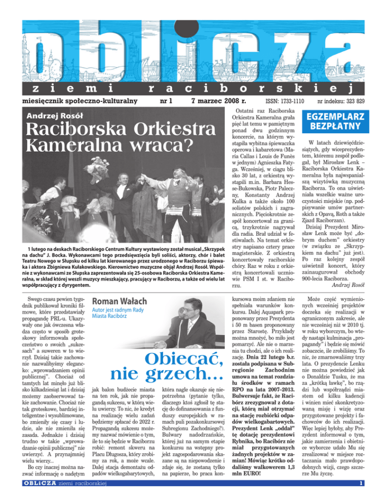 z i e m i r a c i b o r s k i e j miesięcznik społeczno-kulturalny nr 1 7 marzec 2008 r. Andrzej Rosół Raciborska Orkiestra Kameralna wraca? 1 lutego na deskach Raciborskiego Centrum Kultury wystawiony został musical „Skrzypek na dachu” J. Bocka. Wykonawcami tego przedsięwzięcia byli soliści, aktorzy, chór i balet Teatru Nowego w Słupsku od kilku lat kierowanego przez urodzonego w Raciborzu śpiewaka i aktora Zbigniewa Kułakowskiego. Kierownictwo muzyczne objął Andrzej Rosół. Wspólnie z wykonawcami ze Słupska zaprezentowała się 25-osobowa Raciborska Orkiestra Kameralna, w skład której weszli muzycy mieszkający, pracujący w Raciborzu, a także od wielu lat współpracujący z dyrygentem. Swego czasu pewien tygodnik publikował kroniki filmowe, które przedstawiały propagandę PRL-u. Ukazywały one jak ówczesna władza często w sposób groteskowy informowała społeczeństwo o swoich „sukcesach” a suweren w to wierzył. Dzisiaj takie zachowanie nazwalibyśmy elegancko: „wprowadzaniem opinii publicznej”. Chociaż od tamtych lat minęło już blisko kilkadziesiąt lat i dzisiaj możemy zaobserwować takie zachowanie. Chociaż nie tak groteskowe, bardziej inteligentne i wysublimowane, bo zmieniły się czasy i ludzie, ale nie zmieniła się zasada. Jednakże i dzisiaj trudno w takie „wprowadzanie opinii publicznej” nie uwierzyć. A przynajmniej wielu wierzy... Bo czy inaczej można nazwać informację o nadętym Roman Wałach Autor jest radnym Rady Miasta Racibórz Obiecać, nie grzech... jak balon budżecie miasta na ten rok, jak nie propagandą sukcesu, w którą wielu uwierzy. To nic, że kredyt na realizację wielu zadań będziemy spłacać do 2022 r. Propagandą sukcesu możemy nazwać mówienie o tym, ile to się będzie w Raciborzu robić: remont skweru na Placu Długosza, który zrobimy za rok, a może wcale. Dalej stacja demontażu odpadów wielkogabarytowych, O B L i C Z A ziemi raciborskiej która nagle okazuje się niepotrzebna (pytanie tylko, dlaczego ktoś zgłosił tę stację do dofinansowania z funduszy europejskich w ramach puli pozakonkursowej Subregionu Zachodniego?). Bulwary nadodrzańskie, której już na samym etapie konkursu na wstępny projekt zagospodarowania skazane są na niepowodzenie i zdaje się, że zostaną tylko na papierze, bo praca kon- ISSN: 1733-1110 nr indeksu: 323 829 Ostatni raz Raciborska Orkiestra Kameralna grała pięć lat temu w pamiętnym ponad dwu godzinnym koncercie, na którym wystąpiła wybitna śpiewaczka operowa i kabaretowa (Maria Callas i Louis de Funès w jednym) Agnieszka Fatyga. Wcześniej, w ciągu blisko 30 lat, z orkiestrą wystąpili m.in. Barbara Hesse-Bukowska, Piotr Paleczny, Konstanty Andrzej Kulka a także około 100 solistów polskich i zagranicznych. Pięciokrotnie zespół koncertował za granicą, trzykrotnie nagrywał dla radia. Brał udział w festiwalach. Na temat orkiestry napisano cztery prace magisterskie. Z orkiestrą koncertowały raciborskie chóry. Raz w roku z orkiestrą koncertowali uczniowie PSM I st. w Raciborzu. W latach dziewięćdziesiątych, gdy wiceprezydentem, któremu zespół podlegał, był Mirosław Lenk – Raciborska Orkiestra Kameralna była najwspanialszą wizytówką muzyczną Raciborza. To ona uświetniała wszelkie ważne uroczystości miejskie (np. podpisywanie umów partnerskich z Opavą, Roth a także Zjazd Raciborzan). Dzisiaj Prezydent Mirosław Lenk może być „dobrym duchem” orkiestry (w związku ze „Skrzypkiem na dachu” już jest). Po raz kolejny zespół uświetnił koncert, który zainaugurował obchody 900-lecia Raciborza. Andrzej Rosół kursowa moim zdaniem nie spełniała warunków konkursu. Dalej Aquapark proponowany przez Prezydenta i 50 m basen proponowany przez Starostę. Przykłady można mnożyć, bo miło jest pomarzyć. Ale nie o marzenia tu chodzi, ale o ich realizację. Dnia 22 lutego b.r. została podpisana w Subregionie Zachodnim umowa na temat rozdziału środków w ramach RPO na lata 2007–2013. Bulwersuje fakt, że Racibórz zrezygnował z dotacji, którą miał otrzymać na stację rozbiórki odpadów wielkogabartowych. Prezydent Lenk „oddał” tę dotację prezydentowi Rybnika, bo Racibórz nie miał przygotowanych żadnych projektów w zamian! Mówiąc krótko oddaliśmy walkowerem 1,3 mln EURO! Może część wymienionych wcześniej projektów doczeka się realizacji w ograniczonym zakresie, ale nie wcześniej niż w 2010 tj. w roku wyborczym, bo wtedy nastąpi kulminacja „propagandy” i będzie się mówić zobaczcie, ile zrobiliśmy. To nic, że zmarnowaliśmy trzy lata. O prezydencie Lenku nie można powiedzieć jak o Donaldzie Tusku, że ma za „krótką ławkę”, bo rządzi lub współrządzi miastem od kilku kadencji i winien mieć skonkretyzowaną misję i wizję oraz przygotowane projekty i fachowców do ich realizacji. Więc lepiej byłoby, aby Prezydent informował o tym, jakie zamierzenia i obietnice wyborcze udało Mu się zrealizować w miejsce roztaczania mało prawdopodobnych wizji, czego szczerze Mu życzę. EGZEMPLARZ BEZPŁATNY 1 Grzegorz Urbas Autor jest radnym Rady Miasta Racibórz Byłem przeciw... Jako jeden z niewielu radnych byłem przeciw zmianie planu zagospodarowania przestrzennego terenu przy kempingu, sąsiadującego z centrum handlowym pod Oborą. Otóż planuje się przeznaczyć ten teren na obiekty wielkopowierzchniowe, bo zainteresowanym jest nim jedna z fabryk mebli i chce tam urządzić salon meblowy. Bezpośrednie sąsiedztwo takiego obiektu z kempingiem, a dalej z basenem jest moim zdaniem nieporozumieniem. Nie mam nic przeciwko temu, aby miasto zarabiało w taki sposób na sprzedaży ziemi, ale w tym przypadku głosowałem przeciw, by wyrazić swój sprzeciw wobec braku wizji i strategii koalicji rządzącej w tym zakresie. Od lat brakuje spójnej polityki, gdzie w Raciborzu powinny się znaleźć tereny rekreacyjne, a gdzie zlokalizowany Plan bez planu Podczas 