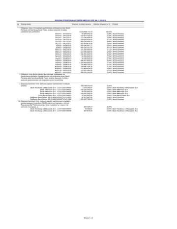 ROCZNA STRUKTURA AKTYWÓW AMPLICO OFE NA 31.12.2010 Lp Rodzaj lokaty 1 Obligacje, bony i inne papiery wartościowe emitowane przez Skarb Państwa lub Narodowy Bank Polski, a także pożyczki i kredyty udzielane tym podmiotom DS1013 - 24/10/2013 DS1015 - 24/10/2015 DS1017 - 25/10/2017 DS1019 - 25/10/2019 DS1020 - 25/10/2020 DZ1111 - 24/11/2011 IZ0816 - 24/08/2016 IZ0823 - 25/08/2023 OK0112 - 25/01/2012 OK0113 - 25/01/2013 OK0712 - 25/07/2012 OK1012 - 25/10/2012 PP1013 - 24/10/2013 PS0413 - 25/04/2013 PS0414 - 25/04/2014 PS0415 - 25/04/2015 PS0416 - 25/04/2016 WS0429 - 25/04/2029 WS0922 - 23/09/2022 WZ0118 - 25/01/2018 WZ0121 - 25/01/2021 2 Obligacje i inne dłużne papiery wartościowe, opiewające na świadczenia pieniężne, gwarantowane lub poręczane przez Skarb Państwa albo Narodowy Bank Polski, a także depozyty, kredyty i pożyczki gwarantowane lub poręczane przez te podmioty 3 Depozyty bankowe i inne bankowe papiery wartościowe w walucie polskiej Bank Handlowy w Warszawie S.A. - LO31122010N002 Bank Millennium S.A. - LO17122010N003 Bank Millennium S.A. - LO22122010N006 Bank Millennium S.A. - LO31122010N003 Fortis Bank Polska S.A. - LO23122010N003 Raiffeisen Bank Polska SA PL0000103305T101231003 Raiffeisen Bank Polska SA PL0000103305T101231004 3a Depozyty bankowe i inne bankowe papiery wartościowe w walutach państw będących członkami OECD oraz innych państw, z którymi Rzeczpospolita Polska zawarła umowy o popieraniu i wzajemnej ochronie inwestycji (...) Bank Handlowy w Warszawie S.A. - LO31122010N007 Bank Handlowy w Warszawie S.A. - LO31122010N008 Wartość na dzień wyceny Udział w aktywach w % 8 312 990 117,57 45 554 400,00 120 421 100,00 172 749 500,00 539 605 000,00 809 319 000,00 502 474 870,56 509 288 661,17 686 330 331,56 191 520 000,00 218 040 000,00 932 400 000,00 736 400 000,00 55 765 600,00 26 156 500,00 588 411 900,00 1 228 438 500,00 126 468 750,00 190 642 304,28 118 884 000,00 125 567 500,00 388 552 200,00 48,03% 0,26% 0,70% 1,00% 3,12% 4,68% 2,90% 2,94% 3,97% 1,11% 1,26% 5,39% 4,25% 0,32% 0,15% 3,40% 7,10% 0,73% 1,10% 0,69% 0,73% 2,24% 733 390 510,91 2 375 249,91 182 000 000,00 50 700 000,00 100 000 000,00 76 000 000,00 82 817 467,00 239 497 794,00 4,24% 0,01% 1,05% 0,29% 0,58% 0,44% 0,48% 1,38% 601 037,81 79 363,81 521 674,00 Strona 1 z 3 Emitent Skarb Państwa Skarb Państwa Skarb Państwa Skarb Państwa Skarb Państwa Skarb Państwa Skarb Państwa Skarb Państwa Skarb Państwa Skarb Państwa Skarb Państwa Skarb Państwa Skarb Państwa Skarb Państwa Skarb Państwa Skarb Państwa Skarb Państwa Skarb Państwa Skarb Państwa Skarb Państwa Skarb Państwa Bank Handlowy w Warszawie S.A. Bank Millennium S.A. Bank Millennium S.A. Bank Millennium S.A. Fortis Bank Polska S.A. Skarb Państwa Skarb Państwa 0,00% 0,00% Bank Handlowy w Warszawie S.A. 0,00% Bank Handlowy w Warszawie S.A. ROCZNA STRUKTURA AKTYWÓW AMPLICO OFE NA 31.12.2010 Lp Rodzaj lokaty Wartość na dzień wyceny Udział w aktywach w % 4 Akcje spółek notowanych na regulowanym rynku giełdowym, a także notowane na regulowanym rynku giełdowym prawa poboru, prawa do akcji oraz obligacje zamienne na akcje tych spółek 6 251 803 571,28 36,12% 6 655 638,00 0,04% AmRest Holdings N.V. 7 283 309,02 0,04% Arctic Paper S.A. 49 686 681,60 0,29% Asseco Business Solutions S.A. 149 760 574,02 0,87% Asseco Poland S.A. 18 076 064,94 0,10% Asseco South Eastern Europe S.A. 21 067 456,60 0,12% ATM Grupa S.A. 113 503 733,16 0,66% Bank Handlowy w Warszawie S.A. 1 596 351,40 0,01% Bank Millennium S.A. 482 397 835,45 2,79% Bank Pekao S.A. 40 042 777,50 0,23% Bank Rozwoju Eksportu S.A. 124 329 168,42 0,72% Bank Zachodni WBK S.A. 95 979 384,55 0,55% Budimex S.A. 30 109 461,12 0,17% CCC S.A. Central European Distribution Corporation 110 293 905,60 0,64% 19 776 181,95 0,11% Ceramika Nowa Gala S.A. 46 539 856,75 0,27% Cersanit S.A. 49 784 852,00 0,29% CEZ a.s. 13 023 453,93 0,08% Cinema City International N.V. 5 502 902,25 0,03% Comarch S.A. 50 535 833,94 0,29% Comp S.A. 31 628 756,25 0,18% Cyfrowy Polsat S.A. 8 429,61 0,00% Decora S.A. 22 855 601,32 0,13% Echo Investment S.A. 24 118 544,04 0,14% Eko Holding S.A. 44 703 260,37 0,26% Elektrobudowa S.A. 3 847 035,78 0,02% Elstar Oils S.A. 3 036 618,26 0,02% Emperia Holding S.A. 62 642 323,20 0,36% Enea S.A . 3 850 563,42 0,02% Energoinstal S.A. 3 082 589,28 0,02% Energomontaż Północ S.A. 17 281 273,65 0,10% ES-System S.A. 76 066 796,00 0,44% Eurocash S.A. 50 552 618,22 0,29% Fabryka Mebli Forte S.A. 49 962 880,00 0,29% Farmacol S.A. 55 132 751,00 0,32% FFiL "Śnieżka" S.A. 54 121 012,90 0,31% Getin Holding S.A. 104 603 839,56 0,60% Globe Trade Centre S.A. 28 280 766,24 0,16% Grupa Kęty S.A. 217 246 106,07 1,26% ING Bank Śląski S.A. 19 377 325,44 0,11% Interger.pl S.A. 65 040 984,00 0,38% Inter Cars S.A. 10 303 497,63 0,06% Introl S.A. 99 183 420,27 0,57% Kernel Grupa S.A. 382 024 661,07 2,21% KGHM Polska Miedź S.A. 29 282 427,58 0,17% LPP S.A. 209 674 688,40 1,21% Lubelski Węgiel Bogdanka S.A. 64 993 980,00 0,38% Mennica Państwowa S.A. 46 766 985,81 0,27% Milkiland N.V. MOL MAGYAR OLAJ- ES GAZIPARI RT. 15 248 451,54 0,09% 48 509 687,88 0,28% Mondi Packaging Paper Świecie S.A. 36 652 815,15 0,21% Mostostal Warszawa S.A. 53 496 483,05 0,31% Multimedia Polska S.A. 30 845 190,66 0,18% Netia S.A. 17 760 000,00 0,10% New World Resources N.V. 924 246,92 0,01% Noble Bank S.A. 10 483 921,25 0,06% Oponeo.pl S.A. 7 901 086,00 0,05% P.A. Nova S.A. 52 925 000,00 0,31% PBG S.A. 15 061 157,82 0,09% Pekaes S.A. 368 202 198,25 2,13% Polska Grupa Energetyczna S.A. 83 755 648,00 0,48% Polimex Mostostal S.A. 26 301 295,68 0,15% PEP S.A. 23 095 297,59 0,13% Polska Grupa Farmaceutyczna S.A. 362 925 661,40 2,10% Polski Koncern Naftowy Orlen S.A. Polskie Górnictwo Naftowe i Gazownictwo S.A. 85 610 345,73 0,49% 563 268 480,16 3,25% PKOBP S.A. 385 907 211,74 2,23% PZU S.A. 5 340 000,00 0,03% Robyg S.A. 27 881 488,80 0,16% Ronson Europe N.V. Sanockie Zakłady Przemysłu Gumowego Stomil
