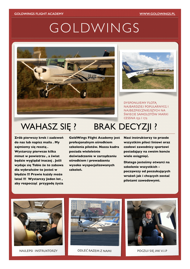 GOLDWINGS FLIGHT ACADEMY WWW.GOLDWINGS.PL G O L DW I N G S DYSPONUJEMY FLOTĄ NAJBARDZIEJ POPULARNYCG I NAJBEZPIECZNIEJSZYCH NA ŚWIECIE SAMOLOTÓW MARKI CESSNA 152 I 172 WAHASZ SIĘ ? Zrób pierwszy krok i zadzwoń do nas lub napisz maila . My zajmiemy się resztą . Wystarczy pierwsze kilka minut w powietrzu , a świat będzie wyglądał inaczej . Jeśli wydaje się Tobie że to zabawa dla wybrańców to jesteś w błędzie !!! Prawie każdy może latać !!! Wystarczy Jeden lot , aby rozpocząć przygodę życia NAJLEPSI INSTRUKTORZY BRAK DECYZJI ? GoldWings Flight Academy jest profesjonalnym ośrodkiem szkolenia pilotów. Nasza kadra posiada wieloletnie doświadczenie w zarządzaniu ośrodkiem i prowadzeniu wysoko wyspecjalizowanych szkoleń. ! ! ODLEĆ RAZEM Z NAMI Nasi instruktorzy to przede wszystkim piloci liniowi oraz czołowi zawodnicy sportowi posiadający na swoim koncie wiele osiągnięć. Dlatego jesteśmy otwarci na szkolenie wszystkich począwszy od poszukujących wrażeń jak i chcących zostać pilotami zawodowymi. POCZUJ SIĘ JAK V.I.P DOŁĄCZ DO NAS WYSZKOLILIŚMY JUŻ KILKUSET PILOTÓW DO RÓŻNYCH UPRAWNIEŃ LOTNICZYCH , MAMY NAJLEPSZĄ ZDAWALNOŚĆ EGZAMINÓW W WARSZAWIE OPRÓCZ SZKOLEŃ ORGANIZUJEMY RÓŻNE EVENTY ORAZ ZAWODY SZKOLIMY CAŁY ROK W RÓŻNYCH WARUNKACH POGODOWYCH BĘDZIESZ W DOBRYCH RĘKACH ! ! ! ! ! ! ! ! ! ! ! ! ! CZŁOWIEK MUSI SOBIE OD CZASU DO CZASU POLATAĆ JAN HIMILSBACH ! ! ! ! ! ! ! ! ! ! ! ! ! ! ! MAŁGORZATA G Ó R A L S K A ! WSPÓŁZAŁORZYCIEL GOLDWINGS FLIGHT ACADEMY . INSTRUKTOR , KIEROWNIK ODPOWIEDZIALNY AR K AD IU SZ JE S IO N E K WSPÓŁZAŁORZYCIEL GOLDWINGS FLIGHT ACADEMY PILOT SZYBOWCOWY ORAZ LINIOWY SZEF WYSZKOLENIA W GOLDWINGS FLIGHT ACADEMY ! IR E N E US Z JE S IO N E K ! 9-KROTNY VICE MISTRZ POLSKI W ARKOBACJI SAMOLOTOWEJ .SZEF SZKOLENIA NAZIEMNEGO W GOLDWINGS FLIGHT ACADEMY. SWOJĄ KARIERE LOTNICZĄ ROZPOCZĄŁ PONAD 30 LAT TEMU G O L DW I N G S Zawody na celność lądowania 2011 GOLDWINGS ORGANIZUJE WIELE IMPREZ . MIĘDZY INNYMI OD DWÓCH LAT ODBYWAJĄ SIĘ ZAWODY NA CELNOŚĆ LĄDOWANIA W Goldwings Flight Academy staramy się aby wszyscy nasi kursanci reprezentowali najwyższy poziom wyszkolenia . Dlatego każdy pilot szkolący się w Goldwings ma możliwość uczestnictwa w szkoleniu z sytuacji awaryjnych i korkociągowych na samolocie przystosowanym do akrobacji . Instruktorem podczas szkolenia będzie 9-krotny wicemistrz Polski w akrobacji samolotowej Ireneusz Jesionek . Po ukończeniu kursu praktycznego każdy pilot w Goldwings posiada umiejętności latania na dwóch samolotach Cessna 152, oraz czteroosobowa Cessna 172 którą będziecie mogli zabrać rodzinę lub przyjaciół na lot. Goldwings flight academy wiemy że Wiedza jest bardzo istotnym elementem szkolenia lotniczego. Zdobycie każdej licencji lotniczej bądź uprawnienia wiąże się z przyswojeniem zagadnień potrzebnych do realizacji szkolenia praktycznego. Zapraszamy Cię na nasze kursy, poznaj nas i stań się częścią środowiska lotniczego w naszym kraju. Goldwings Flight Academy sp z o.o. S.K.A. ul. Batystowa 4/1 02-835 Warsaw, Poland tel +48 883 677 787, 501 101 504 mail: [email protected] BZ WBK 18 1090 1753 0000 0001 1915 5539