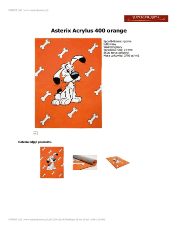 CARPET LAB (www.superdywany.pl) Asterix Acrylus 400 orange Sposób tkania: ręcznie tuftowany Wzór:dziecięcy Wysokość runa: 14 mm Skład runa: poliakryl Masa całkowita: 2700 gr/ m2 nowoÅÄ Galeria zdjęć produktu CARPET LAB (www.superdywany.pl),90-205 Łódź Kilińskiego 25 lok.16 tel.: 508-132-665