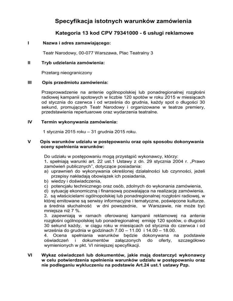 Specyfikacja istotnych warunków zamówienia Kategoria 13 kod CPV 79341000 - 6 usługi reklamowe I Nazwa i adres zamawiającego: Teatr Narodowy, 00-077 Warszawa, Plac Teatralny 3 II Tryb udzielania zamówienia: Przetarg nieograniczony III Opis przedmiotu zamówienia: Przeprowadzenie na antenie ogólnopolskiej lub ponadregionalnej rozgłośni radiowej kampanii spotowych w liczbie 120 spotów w roku 2015 w miesiącach od stycznia do czerwca i od września do grudnia, każdy spot o długości 30 sekund, promujących Teatr Narodowy i organizowane w teatrze premiery, przedstawienia repertuarowe oraz wydarzenia teatralne. IV Termin wykonywania zamówienia: 1 stycznia 2015 roku – 31 grudnia 2015 roku. V Opis warunków udziału w postępowaniu oraz opis sposobu dokonywania oceny spełnienia warunków: Do udziału w postępowaniu mogą przystąpić wykonawcy, którzy: 1. spełniają warunki art. 22 ust.1 Ustawy z dn. 29 stycznia 2004 r. „Prawo zamówień publicznych”, dotyczące posiadania: a) uprawnień do wykonywania określonej działalności lub czynności, jeżeli przepisy nakładają obowiązek ich posiadania, b) wiedzy i doświadczenia, c) potencjału technicznego oraz osób, zdolnych do wykonania zamówienia, d) sytuację ekonomiczną i finansową pozwalająca na realizację zamówienia. 2. są właścicielami ogólnopolskiej lub ponadregionalnej rozgłośni radiowej, w której emitowane są serwisy informacyjne i tematyczne, poświęcone kulturze. a średnia słuchalność w dni powszednie, w Warszawie, nie może być mniejsza niż 7 %. 3. zapewniają w ramach oferowanej kampanii reklamowej na antenie rozgłośni ogólnopolskiej lub ponadregionalnej emisję 120 spotów, o długości 30 sekund każdy, w ciągu roku w miesiącach od stycznia do czerwca i od września do grudnia w godzinach 7.00 – 11.00 i 14.00 – 18.00. 4. Ocena spełniania warunków będzie dokonywana na podstawie oświadczeń i dokumentów załączonych do oferty, szczegółowo wymienionych w pkt. VI niniejszej specyfikacji. VI Wykaz oświadczeń lub dokumentów, jakie mają dostarczyć wykonawcy w celu potwierdzenia spełnienia warunków udziału w postępowaniu oraz nie podleganiu wykluczeniu na podstawie Art.24 ust.1 ustawy Pzp. -11. Na potwierdzenie spełnienia warunków określonych w art. 22 ust. 1 pkt. od a) do d), Wykonawca złoży oświadczenie o spełnianiu warunków udziału w postępowaniu (pkt. V.1. SIWZ). 2. W zakresie potwierdzenia niepodlegania wykluczeniu na podstawie art.24 ust. 1 ustawy, należy przedłożyć: a) oświadczenie o braku podstaw do wykluczenia. b) aktualny odpis z właściwego rejestru lub z centralnej ewidencji i informacji o działalności gospodarczej, jeżeli odrębne przepisy wymagają wpisu do rejestru, w celu wykazania braku podstaw do wykluczenia w oparciu o art. 24 ust.1 pkt. 2 ustawy Pzp, wystawiony nie wcześniej niż 6 miesięcy przed upływem terminu składania ofert. c) oświadczenie Wykonawcy o nie zaleganiu z opłacaniem podatków, lub, że uzyskał przewidziane prawem zwolnienie, odroczenie lub rozłożenie na raty zaległych płatności lub wstrzymanie w całości wykonania decyzji właściwego organu. d) oświadczenie Wykonawcy o nie zaleganiu z opłacaniem składek na ubezpieczenie zdrowotne i społeczne lub, że uzyskał przewidziane prawem zwolnienie, odroczenie lub rozłożenie na raty zaległych płatności lub wstrzymanie w całości wykonania decyzji właściwego organu. 3. Inne dokumenty: 1) zobowiązanie do zawarcia umowy na warunkach określonych w niniejszej specyfikacji. 2) na potwierdzenie, że Wykonawca spełnia warunki wymienione w pkt. V.2 i V.3 SIWZ , należy załączyć do oferty: a) oświadczenie, że Wykonawca jest właścicielem ogólnopolskiej lub ponadregionalnej rozgłośni radiowej i dysponuje na jej antenie pasmem reklamowym, umożliwiającym prowadzenie kampanii spotowej poświęconej kulturze. b) aktualne (z ostatnich sześciu miesięcy) i wiarygodne badania rynkowe, przedstawiające średni poziom słuchalności w Warszawie. c) oświadczenie o dysponowaniu czasem antenowym, przeznaczonym na reklamę spotową poświęconą kulturze w godzinach 7.00 – 11.00 i 14.00 – 18.00. VII Informacja na temat wadium: nie dotyczy VIII Informacja o sposobie porozumiewania się zamawiającego z wykonawcami oraz przekazywania oświadczeń i dokumentów, a także wskazanie osób uprawnionych do porozumiewania się z wykonawcami 1. Wszystkie oświadczenia, wnioski, zawiadomienia, dokumenty oraz informacje Zamawiający i Wykonawca przekazują faksem na numer (0 22) 69 20 741 lub drogą elektroniczną z zachowaniem postanowień art. 27 ust. 2 ustawy Prawo zamówień publicznych. -22. Osobą upoważnioną ze strony Zamawiającego do porozumiewania się z Wykonawcami jest Hanna Zoll (tel: 22 69 20 663). Zapytania, dotyczące treści specyfikacji należy kierować pisemnie drogą elektroniczną do Hanny Zoll ([email protected]), wyłącznie w dni powszednie w godzinach od 9.00 do 16.00 lub faksem (nr faksu: 22 69 20 741). IX Termin związania ofertą: Przystępujący do przetargu związani będą ofertą przez okres 30 dni; bieg terminu rozpoczyna się wraz z upływem terminu składania ofert. X Opis sposobu przygotowywania ofert 1. Oferta musi być sporządzona zgodnie z zapisami niniejszej specyfikacji, w języku polskim, w formie pisemnej. 2. Do oferty należy dołączyć oświadczenia i dokumenty , o których mowa w pkt. VI niniejszej specyfikacji w formie oryginału lub kopii poświadczonej za zgodność z oryginałem przez Wykonawcę lub przez upełnomocnionego przedstawiciela Wykonawcy. 3. Pełnomocnictwo do czynności prawnych musi być dołączone do oferty w formie oryginału lub notarialnie poświadczonej kopii. 4. Wykonawca wraz z ofertą składa listę podmiotów należących do tej samej grupy kapitałowej w rozumieniu ustawy z dnia 16 lutego 2007 o ochronie konkurencji i konsumentów (Dz.U.50 poz. 331 z późniejszymi zmianami) albo infor