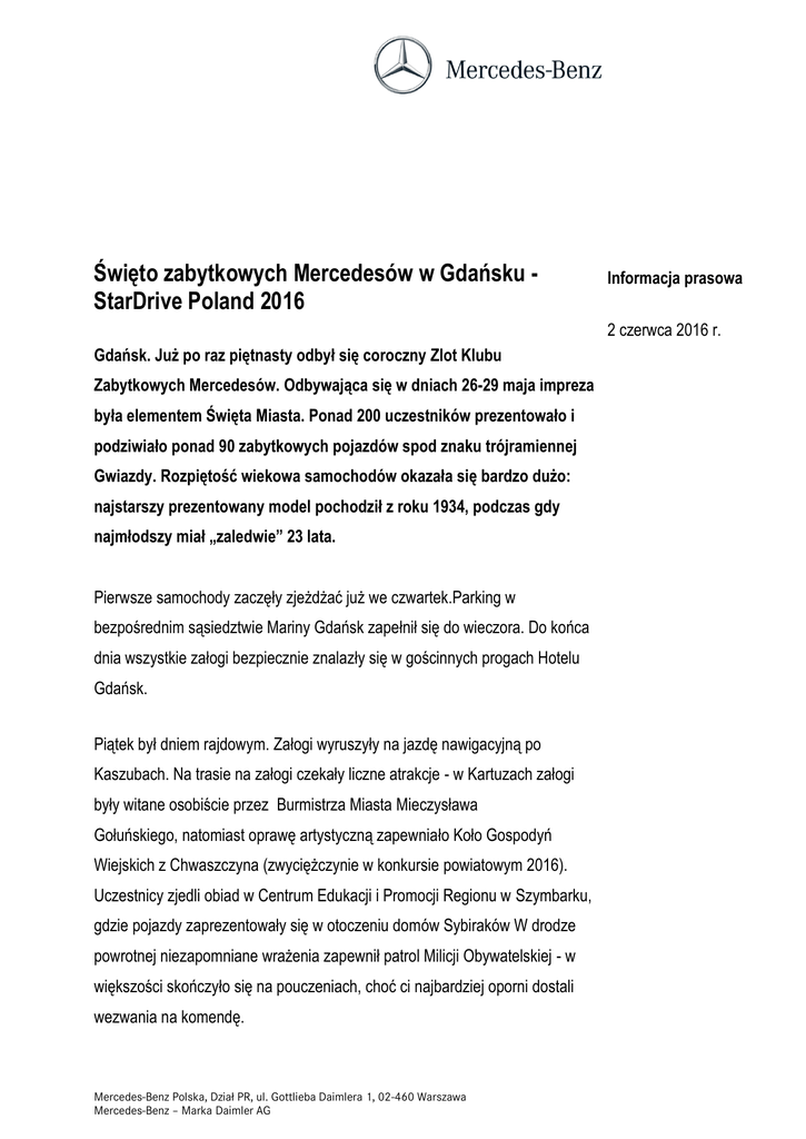 Święto zabytkowych Mercedesów w Gdańsku StarDrive Poland 2016 Informacja prasowa 2 czerwca 2016 r. Gdańsk. Już po raz piętnasty odbył się coroczny Zlot Klubu Zabytkowych Mercedesów. Odbywająca się w dniach 26-29 maja impreza była elementem Święta Miasta. Ponad 200 uczestników prezentowało i podziwiało ponad 90 zabytkowych pojazdów spod znaku trójramiennej Gwiazdy. Rozpiętość wiekowa samochodów okazała się bardzo dużo: najstarszy prezentowany model pochodził z roku 1934, podczas gdy najmłodszy miał „zaledwie” 23 lata. Pierwsze samochody zaczęły zjeżdżać już we czwartek.Parking w bezpośrednim sąsiedztwie Mariny Gdańsk zapełnił się do wieczora. Do końca dnia wszystkie załogi bezpiecznie znalazły się w gościnnych progach Hotelu Gdańsk. Piątek był dniem rajdowym. Załogi wyruszyły na jazdę nawigacyjną po Kaszubach. Na trasie na załogi czekały liczne atrakcje - w Kartuzach załogi były witane osobiście przez Burmistrza Miasta Mieczysława Gołuńskiego, natomiast oprawę artystyczną zapewniało Koło Gospodyń Wiejskich z Chwaszczyna (zwyciężczynie w konkursie powiatowym 2016). Uczestnicy zjedli obiad w Centrum Edukacji i Promocji Regionu w Szymbarku, gdzie pojazdy zaprezentowały się w otoczeniu domów Sybiraków W drodze powrotnej niezapomniane wrażenia zapewnił patrol Milicji Obywatelskiej - w większości skończyło się na pouczeniach, choć ci najbardziej oporni dostali wezwania na komendę. Mercedes-Benz Polska, Dział PR, ul. Gottlieba Daimlera 1, 02-460 Warszawa Mercedes-Benz – Marka Daimler AG Strona 2 Podczas całego trwania rajdu monitorowany był czas przejazdu, regularność jazdy oraz przestrzeganie przepisów. Na tej podstawie jury wytypowało zwycięzców w czterech kategoriach wiekowych: do 1953 roku: Państwo Mirosław i Marzena Oklesińscy, W143 230 Cabriolet A, rocznik 1938; 1954-1960: Państwo Paweł Góras i Joanna Karczmarek-Góras , W120 180D, rocznik 1958; 1961-1971: Pan Michał Ungurian i Pani Barbara Klassek, W113 280SL, rocznik 1971; po roku 1971: Panie Barbara Grzegorczyk i Joanna Jerzyńska, W107 560SL, rocznik 1989. W sobotę 28 maja kolumna samochodów, eskortowana przez gdańską Policję, wyruszyła na Targ Węglowy, gdzie odbył się tradycyjny Konkurs Elegancji. Każdy z samochodów prezentował się pod sceną, na której obradowało jury zebrane z wybitnych znawców klasycznej motoryzacji, wspieranych przez tłumy kibiców oklaskujących każde podjeżdżające auto. O zwycięstwie decydował nie tylko stan i wygląd samochodu, ale także dostosowane do niego stroje z danej epoki oraz choreografia czy inne efekty specjalne. Tu również zwycięzców wyłoniono w poszczególnych kategoriach: do 1953 r.: Panowie Paweł i Piotr Grzegorczyk, W143 230N Roadster, 1937; 1954-1960 r.: Państwo Maciej i Grażyna Chachulscy, W187 220A Cabrio, 1954 Mercedes-Benz Polska, Dział PR, ul. Gottlieba Daimlera 1, 02-460 Warszawa Mercedes-Benz – Marka Daimler AG Strona 3 1961-1971 r.: Państwo Krzysztof, Ewa i Ignacy Masztalerz, W109 300SEL, 1970 od 1972 r.: Panie Małgorzata Przebindowska i Anca Andrei, W107 300SL, 1987 Wśród dodatkowych atrakcji, nie zabrakło zabytkowych samochodów ciężarowych – takich jak pochodzący z 1963 roku Unimog, a także wóz straży pożarnej z 1974 roku: CF16. Ten ostatni przyjechał z pełną załogą strażacką, która… korzysta z niego na co dzień, ponieważ świetnie zachowany pojazd cały czas pełni swoją służbę! XV Zlot StarDrive Poland objęty został honorowym patronatem Prezydenta Miasta Gdańska, Pana Pawła Adamowicza, Marszałka Województwa Pomorskiego, Pana Mieczysława Struka, oraz Konsul Generalnej Republiki Federalnej Niemiec w Gdańsku, Pani Cornelii Pieper. Więcej informacji na temat XV StarDrive Poland znajduje się na klubowym facebooku: https://www.facebook.com/KZMPolska oraz na stronie: http://polska.mercedes-benz-clubs.com/. Kontakt: Aleksander Rzepecki Mail: [email protected] Tel. 698-697-222 Mercedes-Benz Polska, Dział PR, ul. Gottlieba Daimlera 1, 02-460 Warszawa Mercedes-Benz – Marka Daimler AG