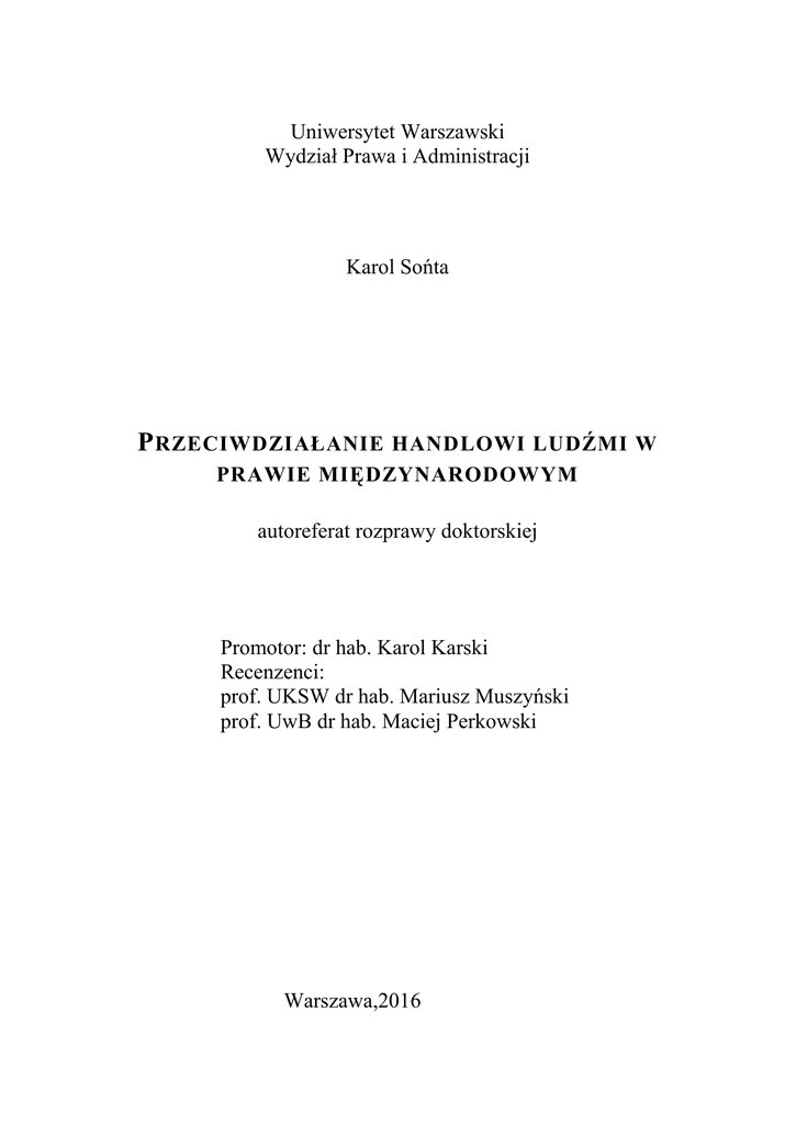 Uniwersytet Warszawski Wydział Prawa i Administracji Karol Sońta P RZECIWDZIAŁANIE HANDLOWI LUDŹMI W PRAWIE MIĘDZYNARODOWYM autoreferat rozprawy doktorskiej Promotor: dr hab. Karol Karski Recenzenci: prof. UKSW dr hab. Mariusz Muszyński prof. UwB dr hab. Maciej Perkowski Warszawa,2016 I. Przedmiot pracy Handel ludźmi jest przestępstwem międzynarodowym (delicta iuris gentium), jak i transnarodowym, które jednocześnie stanowi poważne naruszenie praw człowieka . W doktrynie coraz częściej można spotkać się z opinią, że zakaz handlu ludźmi stanowi już normę ius cogens . Przeciwdziałanie zjawisku handlu ludźmi na poziomie międzynarodowym, jest jednym z tych obszarów międzynarodowej współpracy w sprawach rozwiązań systemowych, którym państwa i powołane przez nie instytucje międzynarodowe poświęcają w ostatnim czasie stosunkowo wiele uwagi. W przeciwdziałaniu handlowi ludźmi należy podkreślić prewencyjny charakter działań podmiotów prawa międzynarodowego w zakresie: analizy stanu faktycznego, tworzenia międzynarodowych rozwiązań prawnych oraz koordynacji systemu monitorowania implementacji umów międzynarodowych. II. Uzasadnienie wyboru tematu pracy Przyczyną wyboru tematu pracy jest narastające zjawisko handlu ludźmi oraz brak ujednoliconego opracowania w zakresie zarówno zwalczania tego procederu, jak i działań prewencyjnych w rozwiązaniach prawnych jakie od wieków udało się wypracować społeczności przyjmowane międzynarodowej w poprzez poszczególnych wspólne państwach, działanie, zarówno jak i rozwiązania posiadających prawne doświadczenie w tym zakresie, jak i dopiero wypracowujących prawne instrumenty w sferze walki z handlem ludźmi. Ponadto analizie poddana została implementacja międzynarodowych zobowiązań prawnych do polskiego systemu prawnego. Handel ludźmi, a szczególnie handel kobietami i dziećmi, to poważny i wciąż narastający proceder o charakterze kryminalnym w niemalże wszystkich systemach prawnych. Przez wiele wieków handel ludźmi traktowano jako coś naturalnego, wynikającego z kultury i obyczajów poszczególnych grup etnicznych. Człowiek był przedmiotem traktowanym jak towar. Obecnie niewolnictwo nie jest ogólnym standardem. Jednak handel ludźmi nie do końca został wyeliminowany. Konferencja Praw Człowieka ONZ w Wiedniu z 1993 r. w przyjętej Deklaracji Wiedeńskiej uznaje handel ludźmi za współczesną formę niewolnictwa. Powszechnie przyjętą definicję „handlu ludźmi” sformułowano dopiero 15 XI 2000 r. Zgromadzenie Ogólne ONZ przyjęło protokół o zapobieganiu, zwalczaniu oraz karaniu za handel ludźmi, w szczególności kobietami i dziećmi, uzupełniającego Konwencję NZ przeciwko międzynarodowej przestępczości zorganizowanej. 1 Handel ludźmi przybiera różne formy: od zorganizowanego żebractwa, przez nielegalną adopcję do handlu ludzkimi organami. Badanie tego zjawiska jest niezwykle skomplikowane. W rocznikach statystycznych nie są ujęte osoby które uciekły, ale nie chcą zgłaszać przestępstwa policji, czasem ofiary popełniają samobójstwo, brak w statystykach osób które zaginęły lub zniknęły w niewyjaśnionych okolicznościach, czy osób które pogodziły się ze swoim losem i w sposób wymuszony uprawiają prostytucję. Dane odnośnie do handlu ludźmi są w większości nieoficjalne, maja charakter jedynie szacunkowy. Zróżnicowanie w statystykach wynika ze specyficznego charakteru przestępstwa. Ofiary są zastraszane, boją się ujawnić prawdę. Dodatkowo, w dużej liczbie przypadków dostały się nielegalnie na teren państwa pobytu. Dane organizacji pozarządowych są zwykle wyższe od danych organów władzy państwowej. Organizacje pozarządowe mają lepsze rozpoznanie oraz analizują zjawisko na bieżąco. Praca przedstawia stopień skomplikowania problemu, ze zwróceniem szczególnego zainteresowania na te działania, które podejmowane są w celu zapobiegania handlowi ludźmi, które wiążą się z wykorzystaniem instrumentów prawnych podejmowanych na forum międzynarodowym. Głównym zadaniem jest próba odpowiedzi na pytanie, czy podejmowane przedsięwzięcia stanowią skuteczne i wystarczające działania zwalczające to zjawisko. III. Cel i przedmiot rozprawy doktorskiej Celem pracy jest próba odpowiedzi na pytanie, czy obowiązujące obecne na arenie międzynarodowej instrumenty prawne, wraz z działaniami podejmowanymi w ramach Organizacji Narodów Zjednoczonych, Rady Europy oraz Unii Europejskiej, a także przepisy prawa krajowego, w tym w szczególności przepisy polskiego kodeksu karnego, umożliwiają skuteczne przeciwdziałanie handlowi ludźmi. Handel ludźmi w licznych opracowaniach nazywany jest współczesną formą niewolnictwa. Określenie to, nie wyczerpuje jednak całej treści zjawiska. Handel ludźmi to ciężkie przestępstwo, które w wielu państwach zagrożone jest najsurowszymi karami. Handel ludźmi to także naruszenie podstawowych praw człowieka. Ma to miejsce zarówno w odniesieniu do ofiary handlu ludźmi w celu wyzysku seksualnego, jak i osób poddanych pracy przymusowej. Mimo, że zjawisko handlu ludźmi stało się przedmiotem zainteresowania międzynarodowej opinii publicznej oraz regulacji prawnych przyjmowanych w ramach 2 organizacji międzynarodowych, nadal pozostaje zjawiskiem mało znanym. Głównym powodem braku wiedzy na temat tego przestępstwa jest niewystarczające zainteresowanie ze strony poszczególnych państw. Nawet państwa, które spełniają minimalny standard wynikający ze zobowiązań międzynarodowych, zwalczanie handlu ludźmi nie traktują jako priorytetu swych działań. Prekursorem w zwalczaniu zjawiska handlu ludźmi staje się Unia Europejska, która kieruje wyzwania dla ustawodawców wszystkich państw członkowskich dla ujednolicenia prawa. Proces ten jest jednak bardzo powolny, zwłaszcza w państwach należących do byłego bloku socjalistycznego, w tym 