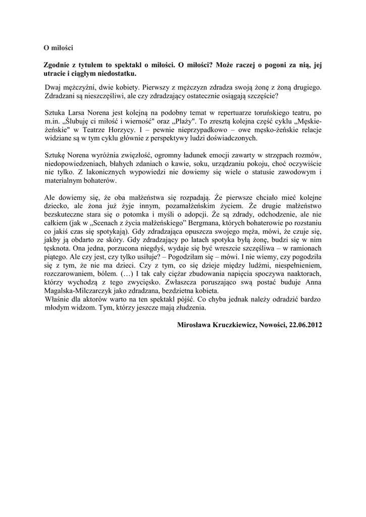 O miłości Zgodnie z tytułem to spektakl o miłości. O miłości? Może raczej o pogoni za nią, jej utracie i ciągłym niedostatku. Dwaj mężczyźni, dwie kobiety. Pierwszy z mężczyzn zdradza swoją żonę z żoną drugiego. Zdradzani są nieszczęśliwi, ale czy zdradzający ostatecznie osiągają szczęście? Sztuka Larsa Norena jest kolejną na podobny temat w repertuarze toruńskiego teatru, po m.in. „Ślubuję ci miłość i wierność" oraz „Plaży". To zresztą kolejna część cyklu „Męskieżeńskie" w Teatrze Horzycy. I – pewnie nieprzypadkowo – owe męsko-żeńskie relacje widziane są w tym cyklu głównie z perspektywy ludzi doświadczonych. Sztukę Norena wyróżnia zwięzłość, ogromny ładunek emocji zawarty w strzępach rozmów, niedopowiedzeniach, błahych zdaniach o kawie, soku, urządzaniu pokoju, choć oczywiście nie tylko. Z lakonicznych wypowiedzi nie dowiemy się wiele o statusie zawodowym i materialnym bohaterów. Ale dowiemy się, że oba małżeństwa się rozpadają. Że pierwsze chciało mieć kolejne dziecko, ale żona już żyje innym, pozamałżeńskim życiem. Że drugie małżeństwo bezskuteczne stara się o potomka i myśli o adopcji. Że są zdrady, odchodzenie, ale nie całkiem (jak w „Scenach z życia małżeńskiego” Bergmana, których bohaterowie po rozstaniu co jakiś czas się spotykają). Gdy zdradzająca opuszcza swojego męża, mówi, że czuje się, jakby ją obdarto ze skóry. Gdy zdradzający po latach spotyka byłą żonę, budzi się w nim tęsknota. Ona jedna, porzucona niegdyś, wydaje się być wreszcie szczęśliwa – w ramionach piątego. Ale czy jest, czy tylko usiłuje? – Pogodziłam się – mówi. I nie wiemy, czy pogodziła się z tym, że nie ma dzieci. Czy z tym, co się dzieje między ludźmi, niespełnieniem, rozczarowaniem, bólem. (…) I tak cały ciężar zbudowania napięcia spoczywa naaktorach, którzy wychodzą z tego zwycięsko. Zwłaszcza poruszająco swą postać buduje Anna Magalska-Milczarczyk jako zdradzana, bezdzietna kobieta. Właśnie dla aktorów warto na ten spektakl pójść. Co chyba jednak należy odradzić bardzo młodym widzom. Tym, którzy jeszcze mają złudzenia. Mirosława Kruczkiewicz, Nowości, 22.06.2012