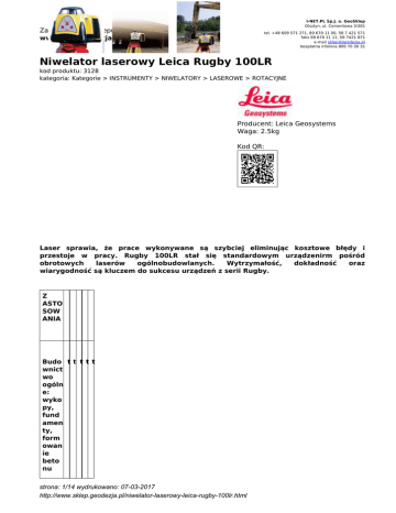 I-NET.PL Sp.J. o. GeoSklep Olsztyn, ul. Cementowa 3/301 Zapraszamy do sklepu www.sklep.geoezja.pl tel. +48 609 571 271, 89 670 11 00, 58 7 421 571 faks 89 670 11 11, 58 7421 871 e-mail [email protected] bezpłatna infolinia 800 70 30 31 Niwelator laserowy Leica Rugby 100LR kod produktu: 3128 kategoria: Kategorie > INSTRUMENTY > NIWELATORY > LASEROWE > ROTACYJNE Producent: Leica Geosystems Waga: 2.5kg Kod QR: Laser sprawia, że prace wykonywane są szybciej eliminując kosztowe błędy i przestoje w pracy. Rugby 100LR stał się standardowym urządzenirm pośród obrotowych laserów ogólnobudowlanych. Wytrzymałość, dokładność oraz wiarygodność są kluczem do sukcesu urządzeń z serii Rugby. Z ASTO SOW ANIA Budo t t t t t wnict wo ogóln e: wyko py, fund amen ty, form owan ie beto nu strona: 1/14 wydrukowano: 07-03-2017 http://www.sklep.geodezja.pl/niwelator-laserowy-leica-rugby-100lr.html Inżyn - - t - ieria lądo wa: parki ngi, boisk a Prace - - - t t konst rukcy jne we wnęt rzach Zakła - - - t t danie ruszt ów sufit u Prze - - - t t nosz enie punk tów z podło gi na sufit Kontr t t t - ola pracy kopa rek, równi arek, spyc hare ki innyc h masz yn budo wlan ych strona: 2/14 wydrukowano: 07-03-2017 http://www.sklep.geodezja.pl/niwelator-laserowy-leica-rugby-100lr.html Zasto - - t - sowa nia rolnic ze, takie jak niwel acja grunt u CHA RAKT ERYT YKA Odpo I I I I I rność na wodę i pył Zinte - t grow ane gum owe osłon y Alar m prze wyżs zenia - t Zasię - g robo czy o śred nicy do 750 m - - strona: 3/14 wydrukowano: 07-03-2017 http://www.sklep.geodezja.pl/niwelator-laserowy-leica-rugby-100lr.html Tryb - - y skan owan ia Zdal - - ne stero wani e Wpro - - - - wadz anie spad ków z wyśw ietle niem Ręcz - t ne usta wiani e spad ków 2 - t lata gwar ancji + gwar ancja w razie upad ku instr ume ntu - Specyfikacja techniczna: strona: 4/14 wydrukowano: 07-03-2017 http://www.sklep.geodezja.pl/niwelator-laserowy-leica-rugby-100lr.html Prze Rug Rug gląd by by lase 50 100 rów Rug by 100 LR Zasi 300 300 750 ęg m m m robo czy (śre dnic a) Dokł ± ± ± adn 2,6 1,5 1,5 ość mm mm mm na na na 30 30 30 m m m Zakr ± 5° ± 5° ± 5° es sam opo zio mo wan ia Ręc zne usta wie nie nac hyle nia - Prę 10 dko obr/ ść sek obro tu Do Ręc 10% zne, z usta wie nie m osi pros topa dłyc h do 10% Dwi e prę dko ści: 5i 10 Dwi e prę dko ści: 5i 10 strona: 5/14 wydrukowano: 07-03-2017 http://www.sklep.geodezja.pl/niwelator-laserowy-leica-rugby-100lr.html obr. obr. /s /s Wią zka lase ra 780 635 780 nm nm nm (pod (wid (pod czer oczn czer wie a) wie ń) ń) Zakr es tem pera tur prac y od -20 do +50 stop ni C Żyw otno ść bate rii bate bate bate rie rie rie alka alka alka liczn liczn liczn e e e (cza (cza (cza s s s prac prac prac y 60 y 60 y 60 god god god z.) z.) z.) lub lub lub aku aku aku mul mul mul ator ator ator y y y NiM NiM NiM H H H (cza (cza (cza s s s prac prac prac y 35 y 35 y 35 god god god z.) z.) z.) od -20 do +50 stop ni C od -20 do +50 stop ni C Wag 1,85 2,50 2,50 a kg kg kg Wy 158 miar x 163 x 166 mm 197 x 248 x 175 mm 197 x 248 x 175 mm strona: 6/14 wydrukowano: 07-03-2017 http://www.sklep.geodezja.pl/niwelator-laserowy-leica-rugby-100lr.html Wod IP55 IP56 IP56 ood por ność Dostępnę do wyboru są trzy rodzaje detektorów: Dan e tech nicz ne Rod Rod Rod Eye Eye Eye Digi Plus Basi tal c Zasi 450 450 150 ęg m m m prac y (śre dnic a) Wys 127 50 36 oko mm mm mm ść okn a dete ktor a Pas mo wyk ryw ane go świa tła 610 610 610 nm nm nm do do do 780 780 780 nm nm nm Dokł Ultr Dob Dob adn a ra ra ości 0.5 ± 1 ± 1 strona: 7/14 wydrukowano: 07-03-2017 http://www.sklep.geodezja.pl/niwelator-laserowy-leica-rugby-100lr.html wyk mm ryw ania wiąz ki Sup er 1.0 mm mm mm Śre Zgr dnia ubn ±2 a± mm 3 mm Dob Zgr ra ubn 1.0 a ± mm 3 mm Śre dnia 5.0 mm Zgr ubn a 10.0 mm Syg Trzy Dwa Dwa nały dźwi ęko we Bat 60 + 70 + 50 erie god god god zin, zin, zin (typ 1x 9V) (2x (2x 1.5V 1.5V AA) „AA ”) Wyś 21 9 5 wiet kan kan kan lacz ałó ałó ałó strz w w w ałko wy strona: 8/14 wydrukowano: 07-03-2017 http://www.sklep.geodezja.pl/niwelator-laserowy-leica-rugby-100lr.html Diod Tak, Tak, Nie y pięć pięć LED kan kan ałó ałó w w Gwa 3 2 1 ranc lata lata rok ja Zestaw zawiera: Niwelator Laserowy Leica Rugby 100LR. Wybrany jeden z trzech dostępnych detektorów. Do wyboru: zasobnik baterii z bateriami alkalicznymi lub akumulator NIMH z ładowarką. Walizka Instrukcja obsługi Zechcą Państwo złożyć zapytanie o cenę. Postaramy się sprostać Państwa oczekiwaniom. Na stronie WWW wielkość rabatów jest ograniczana ze względu na politykę cenową i wgląd konkurencji. Jeśli są Państwo zdecydowani na zakup, mogą Państwo zakupić w różnych wariantach wsparcia i z wybranym zestawem akcesoriów. Wszystko to wpływa na końcową cenę produktu. Do pobrania: Broszura Leica Rugby 100LR [EN] Instrukcja obsługi Leica Rugby 100LR [PL] Katalog Leica Geosystems - Instrument na każdy plac budowy [PL] B t t t t t u a a a a a d k k k k k o w n ic strona: 9/14 wydrukowano: 07-03-2017 http://www.sklep.geodezja.pl/niwelator-laserowy-leica-rugby-100lr.html t w o o g ó l n e : w y k o p y , f u n d a I - - t - n a ż k y n i e ri a l ą d o w a : p a r k i n g i, b o is k a strona: 10/14 wydrukowano: 07-03-2017 http://www.sklep.geodezja.pl/niwelator-laserowy-leica-rugby-100lr.html P - - - t t r a a a k k c e k o n s t r u k c y j n e w e w n ę t r z a c h Z - - - t t a a a k k k ł a d a n i e r u s z t ó w s u fi t u P - - - t t r a a z k k e strona: 11/14 wydrukowano: 07-03-2017 http://www.sklep.geodezja.pl/niwelator-laserowy-leica-rugby-100lr.html n o s z e n i e p u n k t ó w z p o d ł o g i n a s u fi t K t t t - o a a a n k k k t r o l a p r a c y k o p a r e k , r ó w n i a r strona: 12/14 wydrukowano: 07-03-2017 http://www.sklep.geodezja.pl/niwelator-laserowy-leica-rugby-100lr.html e k , s p y c h a r e k i i n n y c h Z - - t - a a s k t o s o w a n i a r o