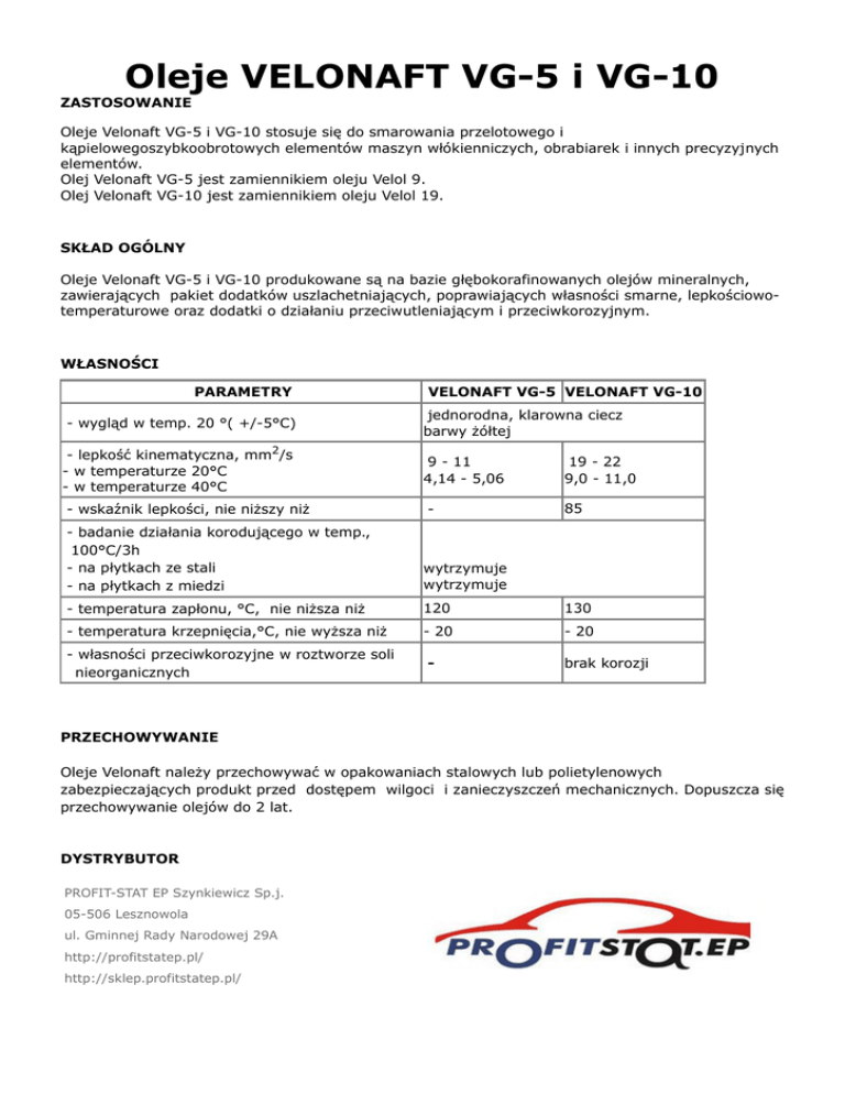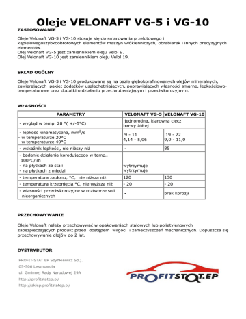 Oleje VELONAFT VG-5 i VG-10 ZASTOSOWANIE Oleje Velonaft VG-5 i VG-10 stosuje się do smarowania przelotowego i kąpielowegoszybkoobrotowych elementów maszyn włókienniczych, obrabiarek i innych precyzyjnych elementów. Olej Velonaft VG-5 jest zamiennikiem oleju Velol 9. Olej Velonaft VG-10 jest zamiennikiem oleju Velol 19. SKŁAD OGÓLNY Oleje Velonaft VG-5 i VG-10 produkowane są na bazie głębokorafinowanych olejów mineralnych, zawierających pakiet dodatków uszlachetniających, poprawiających własności smarne, lepkościowotemperaturowe oraz dodatki o działaniu przeciwutleniającym i przeciwkorozyjnym. WŁASNOŚCI PARAMETRY VELONAFT VG-5 VELONAFT VG-10 - wygląd w temp. 20 °( +/-5°C) jednorodna, klarowna ciecz barwy żółtej - lepkość kinematyczna, mm2/s - w temperaturze 20°C - w temperaturze 40°C 9 - 11 4,14 - 5,06 19 - 22 9,0 - 11,0 - wskaźnik lepkości, nie niższy niż - 85 - badanie działania korodującego w temp., 100°C/3h - na płytkach ze stali - na płytkach z miedzi wytrzymuje wytrzymuje - temperatura zapłonu, °C, nie niższa niż 120 130 - temperatura krzepnięcia,°C, nie wyższa niż - 20 - 20 - własności przeciwkorozyjne w roztworze soli nieorganicznych - brak korozji PRZECHOWYWANIE Oleje Velonaft należy przechowywać w opakowaniach stalowych lub polietylenowych zabezpieczających produkt przed dostępem wilgoci i zanieczyszczeń mechanicznych. Dopuszcza się przechowywanie olejów do 2 lat. DYSTRYBUTOR PROFIT-STAT EP Szynkiewicz Sp.j. 05-506 Lesznowola ul. Gminnej Rady Narodowej 29A http://profitstatep.pl/ http://sklep.profitstatep.pl/