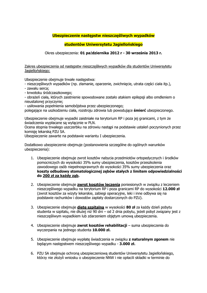 Ubezpieczenie następstw nieszczęśliwych wypadków studentów Uniwersytetu Jagiellońskiego Okres ubezpieczenia: 01 października 2012 r - 30 września 2013 r. Zakres ubezpieczenia od następstw nieszczęśliwych wypadków dla studentów Uniwersytetu Jagiellońskiego: Ubezpieczenie obejmuje trwałe następstwa: - nieszczęśliwych wypadków (np. złamanie, oparzenie, zwichnięcie, utrata części ciała itp.), - zawału serca; - krwotoku śródczaszkowego; - obraŜeń ciała, których zaistnienie spowodowane zostało atakiem epilepsji albo omdleniem o nieustalonej przyczynie; - usiłowania popełnienia samobójstwa przez ubezpieczonego; polegające na uszkodzeniu ciała, rozstroju zdrowia lub powodujące śmierć ubezpieczonego. Ubezpieczenie obejmuje wypadki zaistniałe na terytorium RP i poza jej granicami, z tym Ŝe świadczenia wypłacane są wyłącznie w PLN. Ocena stopnia trwałego uszczerbku na zdrowiu nastąpi na podstawie ustaleń poczynionych przez komisję lekarską PZU SA. Ubezpieczenie zawarte na podstawie wariantu I ubezpieczenia. Dodatkowo ubezpieczenie obejmuje (postanowienia szczególne do ogólnych warunków ubezpieczenia): 1. Ubezpieczenie obejmuje zwrot kosztów nabycia przedmiotów ortopedycznych i środków pomocniczych do wysokości 35% sumy ubezpieczenia, kosztów przeszkolenia zawodowego osób niepełnosprawnych do wysokości 35% sumy ubezpieczenia oraz koszty odbudowy stomatologicznej zębów stałych z limitem odpowiedzialności do 200 zł za kaŜdy ząb. 2. Ubezpieczenie obejmuje zwrot kosztów leczenia poniesionych w związku z leczeniem nieszczęśliwego wypadku na terytorium RP i poza granicami RP do wysokości 12.000 zł (zwrot kosztów za wizyty lekarskie, zabiegi operacyjne, leki i inne odbywa się na podstawie rachunków i dowodów zapłaty dostarczonych do PZU). 3. Ubezpieczenie obejmuje dietę szpitalną w wysokości 80 zł za kaŜdy dzień pobytu studenta w szpitalu, nie dłuŜej niŜ 90 dni – od 2 dnia pobytu, jeŜeli pobyt związany jest z nieszczęśliwym wypadkiem lub zdarzeniem objętym umową ubezpieczenia. 4. Ubezpieczenie obejmuje zwrot kosztów rehabilitacji – suma ubezpieczenia do wyczerpania na jednego studenta 10.000 zł. 5. Ubezpieczenie obejmuje wypłatę świadczenia w związku z naturalnym zgonem nie będącym następstwem nieszczęśliwego wypadku - 3.000 zł. 6. PZU SA obejmuje ochroną ubezpieczeniową studentów Uniwersytetu Jagiellońskiego, którzy nie złoŜyli wniosku o ubezpieczenie NNW i nie opłacili składki w terminie do 15.12.2012 r. z tym, Ŝe odpowiedzialność PZU SA rozpoczyna się od dnia następnego po dniu, w którym została opłacona przez studenta składka za ubezpieczenie. 7. Dla studentów Uniwersytetu Jagiellońskiego uprawiających sport wyczynowo – ubezpieczenie jest zawierane bez zwyŜki składki. 8. Ochroną ubezpieczeniową objęte są zgłoszone dzieci studentów Uniwersytetu Jagiellońskiego, z tym Ŝe suma ubezpieczenia w ubezpieczeniu NNW dzieci studentów Uniwersytetu Jagiellońskiego wynosi 10.000 zł na jedno dziecko. Przedmiotowym ubezpieczeniem mogą zostać objęte tylko i wyłącznie dzieci studentów Uniwersytetu Jagiellońskiego, którzy zawarli ubezpieczenie NNW i opłacili składkę za ubezpieczenie. 9. Ryczałt za okres czasowej, całkowitej niezdolności do nauki lub pracy z tytułu następstw nieszczęśliwych wypadków lub zdarzenia objętego umową ubezpieczenia: a) 600 zł na wypadek trwałego uszczerbku na zdrowiu, płatny za okres niezdolności trwającej dłuŜej niŜ 14 do 30 dni od daty wypadku; b) 800 zł na wypadek trwałego uszczerbku na zdrowiu płatny za kaŜdy następny pełny 30-dniowy okres nieprzerwanego leczenia, najdłuŜej za okres 180 dni. (na podstawie zaświadczenia lekarza prowadzącego leczenie). 10. Jednorazowe świadczenie w przypadku zgonu ubezpieczonego spowodowanego sepsą – 40.000 zł 11. Jednorazowe świadczenie w przypadku zgonu przedstawiciela ustawowego studenta do ukończenia 25 roku Ŝycia i pobierania nauki do tego czasu – 2.000 zł. Zgon nastąpił w następstwie nieszczęśliwego wypadku bądź zawału serca lub udaru mózgu. 12. Jednorazowe świadczenie w przypadku zgonu ubezpieczonego spowodowanego nowotworem złośliwym – w wysokości 1.000 zł. 13. Jednorazowe świadczenie w przypadku zgonu studenta w wieku do 25 lat z powodu wrodzonej wady serca – w wysokości 1.000 zł. 14. Zwrot opłaconego czesnego – do wysokości określonej w umowie, maksymalnie do wysokości 5.000 zł, składka dodatkowa 0,10 zł za kaŜdy 1.000 sumy ubezpieczenia. 15. Jednorazowe świadczenie w przypadku śmierci przedstawiciela ustawowego - w wysokości 1.000 zł. ŚWIADCZENIA TYPU ASSISTANCE NA TERYTORIUM RP w ramach Ubezpieczenia Obsługa usług assistance – CENTRUM ALARMOWE PZU SA. Rodzaje świadczonych usług: 1. Pomoc medyczna i psychologiczna (np. wizyta lekarza lub pielęgniarki u ubezpieczonego) 2. Pomoc rehabilitacyjna i pielęgniarska 3. Usługi informacyjne ] Ubezpieczenie odpowiedzialności cywilnej w Ŝyciu prywatnym studentów Uniwersytetu Jagiellońskiego Ubezpieczenie OC w Ŝyciu prywatnym na terenie RP obejmuje odpowiedzialność cywilną studenta, gdy w związku z wykonywaniem czynności Ŝycia prywatnego w następstwie czynu niedozwolonego jest on zobowiązany do naprawienia szkody na osobie lub szkody rzeczowej wyrządzonej osobie trzeciej. Dodatkowo obejmuje odpowiedzialność za szkody w mieniu wynajmowanym (np. w mieszkaniu wynajmowanym) oraz odpowiedzialność cywilną związaną z uprawianiem sportów (np. za szkody podczas jazdy na nartach, snowboardzie, rowerze). Wypłata świadczenia w PZU (odszkodowanie) odbywa się na podstawie: • telefonicznego zgłoszenia szkody poprzez całodobowe Telecentrum – infolinia 801102102 • za pomocą strony www.pzu.pl (poprzez formularz „Zgłoś szkodę lub roszczenie”) • osobiście w placówce PZU SA