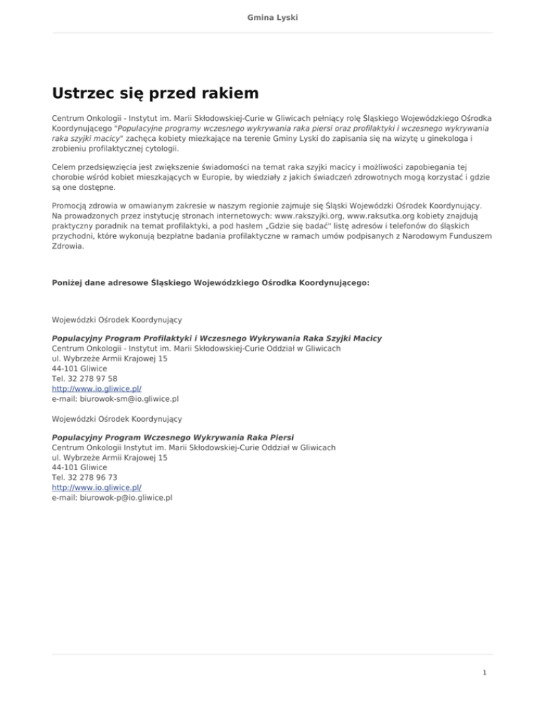 Gmina Lyski Ustrzec się przed rakiem Centrum Onkologii - Instytut im. Marii Skłodowskiej-Curie w Gliwicach pełniący rolę Śląskiego Wojewódzkiego Ośrodka Koordynującego "Populacyjne programy wczesnego wykrywania raka piersi oraz profilaktyki i wczesnego wykrywania raka szyjki macicy" zachęca kobiety miezkające na terenie Gminy Lyski do zapisania się na wizytę u ginekologa i zrobieniu profilaktycznej cytologii. Celem przedsięwzięcia jest zwiększenie świadomości na temat raka szyjki macicy i możliwości zapobiegania tej chorobie wśród kobiet mieszkających w Europie, by wiedziały z jakich świadczeń zdrowotnych mogą korzystać i gdzie są one dostępne. Promocją zdrowia w omawianym zakresie w naszym regionie zajmuje się Śląski Wojewódzki Ośrodek Koordynujący. Na prowadzonych przez instytucję stronach internetowych: www.rakszyjki.org, www.raksutka.org kobiety znajdują praktyczny poradnik na temat profilaktyki, a pod hasłem „Gdzie się badać" listę adresów i telefonów do śląskich przychodni, które wykonują bezpłatne badania profilaktyczne w ramach umów podpisanych z Narodowym Funduszem Zdrowia. Poniżej dane adresowe Śląskiego Wojewódzkiego Ośrodka Koordynującego: Wojewódzki Ośrodek Koordynujący Populacyjny Program Profilaktyki i Wczesnego Wykrywania Raka Szyjki Macicy Centrum Onkologii - Instytut im. Marii Skłodowskiej-Curie Oddział w Gliwicach ul. Wybrzeże Armii Krajowej 15 44-101 Gliwice Tel. 32 278 97 58 http://www.io.gliwice.pl/ e-mail: [email protected] Wojewódzki Ośrodek Koordynujący Populacyjny Program Wczesnego Wykrywania Raka Piersi Centrum Onkologii Instytut im. Marii Skłodowskiej-Curie Oddział w Gliwicach ul. Wybrzeże Armii Krajowej 15 44-101 Gliwice Tel. 32 278 96 73 http://www.io.gliwice.pl/ e-mail: [email protected] 1