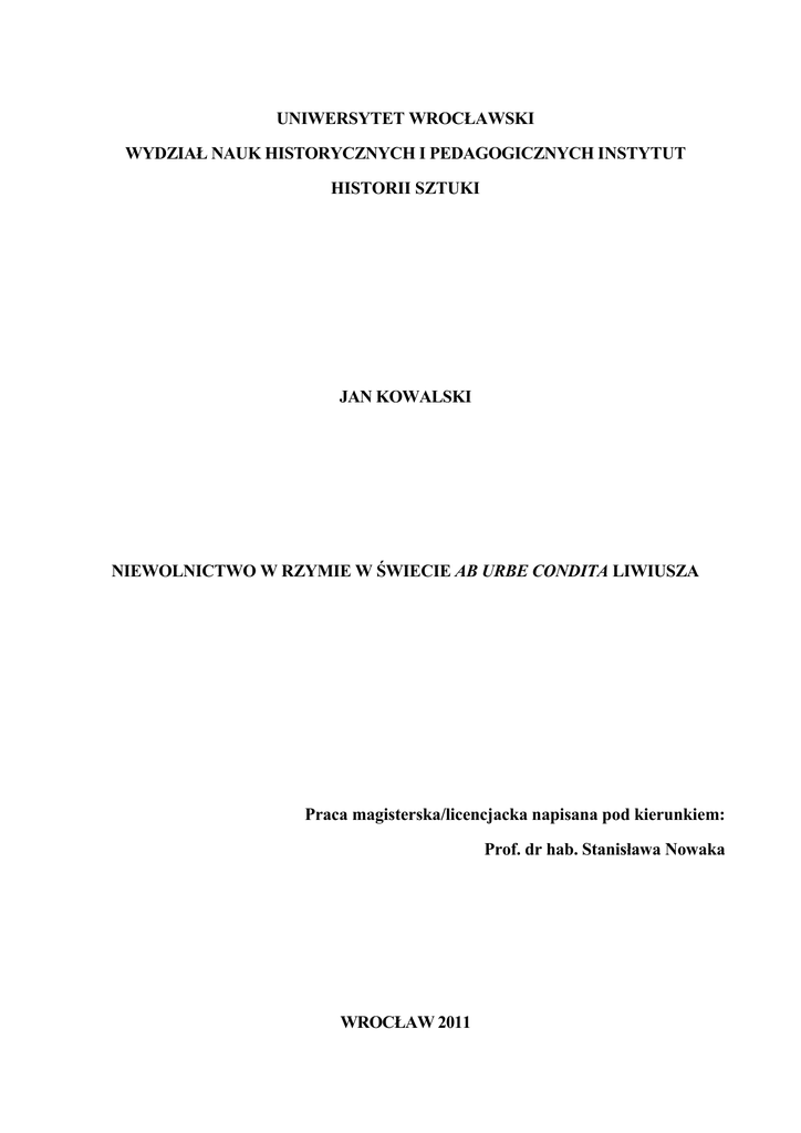 UNIWERSYTET WROCŁAWSKI WYDZIAŁ NAUK HISTORYCZNYCH I PEDAGOGICZNYCH INSTYTUT HISTORII SZTUKI JAN KOWALSKI NIEWOLNICTWO W RZYMIE W ŚWIECIE AB URBE CONDITA LIWIUSZA Praca magisterska/licencjacka napisana pod kierunkiem: Prof. dr hab. Stanisława Nowaka WROCŁAW 2011