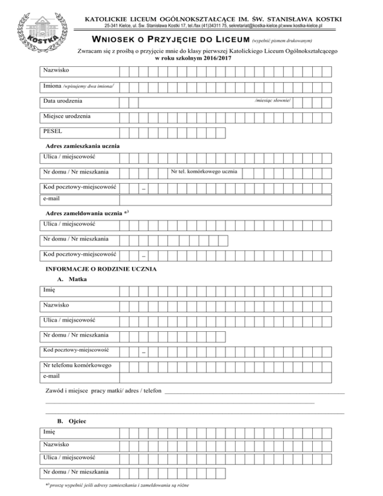 KATOLICKIE LICEUM OGÓLNOKSZTAŁCĄCE IM. ŚW. STANISŁAWA KOSTKI 25-341 Kielce, ul. Św. Stanisława Kostki 17, tel./fax (41)34311 75, [email protected];www.kostka-kielce.pl W NIOSEK O P RZYJĘCIE DO L ICEUM (wypełnić pismem drukowanym) Zwracam się z prośbą o przyjęcie mnie do klasy pierwszej Katolickiego Liceum Ogólnokształcącego w roku szkolnym 2016/2017 Nazwisko Imiona /wpisujemy dwa imiona/ /miesiąc słownie/ Data urodzenia Miejsce urodzenia PESEL Adres zamieszkania ucznia Ulica / miejscowość Nr tel. komórkowego ucznia Nr domu / Nr mieszkania Kod pocztowy-miejscowość – e-mail Adres zameldowania ucznia *) Ulica / miejscowość Nr domu / Nr mieszkania Kod pocztowy-miejscowość – INFORMACJE O RODZINIE UCZNIA A. Matka Imię Nazwisko Ulica / miejscowość Nr domu / Nr mieszkania Kod pocztowy-miejscowość – Nr telefonu komórkowego e-mail Zawód i miejsce pracy matki/ adres / telefon ________________________________________________________ _____________________________________________________________________________________________ _____________________________________________________________________________________________ B. Ojciec Imię Nazwisko Ulica / miejscowość Nr domu / Nr mieszkania *) proszę wypełnić jeśli adresy zamieszkania i zameldowania są różne Kod pocztowy-miejscowość – Nr telefonu komórkowego e-mail Zawód i miejsce pracy ojca/ adres / telefon _______________________________________________________ _____________________________________________________________________________________________ _____________________________________________________________________________________________ Dodatkowe uwagi ______________________________________________________________________________ Liczba dzieci w rodzinie ______________, w tym na utrzymaniu rodziców ________________________________ Nazwa i adres Przychodni Rodzinnej _______________________________________________________________ Czy kandydat posiada orzeczenie lub opinię z poradni psychologiczno-pedagogicznej ________________________ Czy kandydat posiada orzeczenie o niepełnosprawności ____________________________________________ Nazwa, numer, adres gimnazjum do którego uczęszcza kandydat ________________________________________ _____________________________________________________________________________________________ Wybieram kierunek kształcenia: □ PRAWNICZY – dlarozszerzenie: z j. polskiego; do wyboru z historii lub geografii lub wiedzy o społeczeństwie, chętnych również z j. angielskiego; przedmioty dodatkowe: edukacja prawna, dla chętnych j. łaciński z terminologią prawniczą; □ KULTUROZNAWCZY – orozszerzenie: z j. polskiego; do wyboru z historii lub geografii lub wiedzy społeczeństwie; dla chętnych również z j. angielskiego; przedmioty dodatkowe: wiedza o filmie i mediach; □ MEDYCZNY – dlarozszerzenie: z biologii i chemii; dla chętnych również z j. angielskiego; chętnych dodatkowo j. łaciński z terminologią medyczną; □ POLITECHNICZNY – rozszerzenie z matematyki; do wyboru: z geografii lub fizyki; dla chętnych również z j. angielskiego; Drugi język obcy (poza j. angielskim), którego chcę się uczyć: j. niemiecki j. francuski dla kontynuujących dla początkujących dla kontynuujących Zainteresowania pozaszkolne oraz udział w ruchach i grupach duszpasterskich: _____________________________________________________________________________________________ _____________________________________________________________________________________________ Motywacja wyboru szkoły: ______________________________________________________________________ _____________________________________________________________________________________________ _____________________________________________________________________________________________ Deklarujmy udział naszej córki /naszego syna w lekcjach religii: TAK □ NIE □ Wyrażam zgodę na przetwarzanie danych osobowych zawartych w kwestionariuszu dla potrzeb rekrutacji oraz niezbędnych do procesu kształcenia w szkole (zgodnie z Ustawą o ochronie danych osobowych z dnia 29.08.1997. Dz. U. nr 133, poz. 883). Miejscowość, data __________________________________________ Podpis kandydata ___________________________________________ Podpis rodziców/opiekunów prawnych ____________________________________________________________ Załączniki: 1. Opinia Ks. Proboszcza 2. Opinia katechety lub wychowawcy 3. Zdjęcia legitymacyjne (3 szt.)