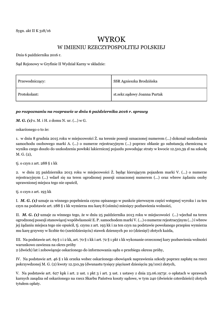 Sygn. akt II K 318/16 WYROK W IMIENIU RZECZYPOSPOLITEJ POLSKIEJ Dnia 6 października 2016 r. Sąd Rejonowy w Gryfinie II Wydział Karny w składzie: Przewodniczący: SSR Agnieszka Brodzińska Protokolant: st.sekr.sądowy Joanna Purtak po rozpoznaniu na rozprawie w dniu 6 października 2016 r. sprawy M. G. (1) s. M. i H. z domu N. ur. (...) w G. oskarżonego o to że: 1. w dniu 8 grudnia 2015 roku w miejscowości Ż. na terenie posesji oznaczonej numerem (...) dokonał uszkodzenia samochodu osobowego marki A. (...) o numerze rejestracyjnym (...) poprzez oblanie go substancją chemiczną w wyniku czego doszło do uszkodzenia powłoki lakierniczej pojazdu powodując straty w kwocie 12.510,39 zł na szkodę M. G. (2), tj. o czyn z art. 288 § 1 kk 2. w dniu 25 października 2013 roku w miejscowości Ż. będąc kierującym pojazdem marki V. (...) o numerze rejestracyjnym (...) wdarł się na teren ogrodzonej posesji oznaczonej numerem (...) oraz wbrew żądaniu osoby uprawnionej miejsca tego nie opuścił, tj. o czyn z art. 193 kk I. M. G. (1) uznaje za winnego popełnienia czynu opisanego w punkcie pierwszym części wstępnej wyroku i za ten czyn na podstawie art. 288 § 1 kk wymierza mu karę 8 (ośmiu) miesięcy pozbawienia wolności, II. M. G. (1) uznaje za winnego tego, że w dniu 25 października 2013 roku w miejscowości (...) wjechał na teren ogrodzonej posesji stanowiącej współwłasność E. P. samochodem marki V. (...) o numerze rejestracyjnym (...) i wbrew jej żądaniu miejsca tego nie opuścił, tj. czynu z art. 193 kk i za ten czyn na podstawie powołanego przepisu wymierza mu karę grzywny w liczbie 60 (sześćdziesięciu) stawek dziennych po 10 (dziesięć) złotych każda, III. Na podstawie art. 69 § 1 i 2 kk, art. 70 § 1 kk i art. 72 § 1 pkt 1 kk wykonanie orzeczonej kary pozbawienia wolności warunkowo zawiesza na okres próby 2 (dwóch) lat i zobowiązuje oskarżonego do informowania sądu o przebiegu okresu próby, IV. Na podstawie art. 46 § 1 kk orzeka wobec oskarżonego obowiązek naprawienia szkody poprzez zapłatę na rzecz pokrzywdzonej M. G. (2) kwoty 12.510,39 (dwunastu tysięcy pięciuset dziesięciu 39/100) złotych, V. Na podstawie art. 627 kpk i art. 2 ust. 1 pkt 3 i art. 3 ust. 1 ustawy z dnia 23.06.1973r. o opłatach w sprawach karnych zasądza od oskarżonego na rzecz Skarbu Państwa koszty sądowe, w tym 240 (dwieście czterdzieści) złotych tytułem opłaty. Sygn. akt II K 318/16 UZASADNIENIE E. P. i M. G. (1) byli parą. Rozstali się w 2013 r. i E. P. związała się z P. G.. W dniu 25 października 2013 roku w godzinach wieczornych E. P. i P. G. samochodem wrócili do miejsca zamieszkania E. P. w miejscowości Ż. nr 13. Gdy wjechali na teren posesji, kiedy brama była jeszcze otwarta, bezpośrednio za nimi wjechał M. G. (1) poruszający się pojazdem marki V. (...) o nr rej. (...). W samochodzie oprócz niego znajdowały się jeszcze trzy osoby. M. G. (1) wysiadł z pojazdu i oświadczył, że chce rozmawiać z P. G.. E. P. odpowiedziała, że nie będzie żadnej rozmowy, gdyż nie przyjechał sam i zażądała, aby opuścił jej posesję. M. G. (1) nie zareagował na jej polecenie i w dalszym ciągu nalegając na rozmowę zaczął zbliżać się w ich kierunku. Wówczas E. P. ponownie wyprosiła go z posesji i wraz z P. G. w obawie przed dalszym rozwojem wydarzeń, udali się do domu, zamykając drzwi na klucz. Gdy byli już wewnątrz, M. G. (1) zaczął dzwonić na jej telefon komórkowy i stacjonarny, domagając się rozmowy z P. G., a gdy odmawiała, używał obraźliwych słów. W tym czasie w domu przebywali także rodzice E. P.. W. P. (1) usłyszała, że na podjeździe ich posesji znajduje się także inny pojazd i E. P. opowiedziała matce o incydencie sprzed domu, a także o telefonach od M. G. (1). Wówczas W. P. (2) postanowiła porozmawiać z M. G. (1) i po tej rozmowie M. G. (1) opuścił posesję. Bezpośrednio po zdarzeniu P. G. powiadomił Policję o groźbach wypowiadanych wobec niego przez M. G. (1). Na miejsce zostali skierowani funkcjonariusze Policji. P. G. nie złożył jednak zawiadomienia o przestępstwie, w związku z czym nie toczyło się postepowanie w powyższej sprawie. Dowód: zeznania E. P. k. 28-29 akt w zw. z k. 36v-37 zbioru A zeznania P. G. k. 29-29v. zeznania W. P. (2) k. 30 w zw. z k. 52v zbioru A notatnik służbowy k. 60-62 zbioru A W dniu 7 grudnia 2015 roku, pomiędzy godz. 7.00 a godz. 9.00 rano, P. G., jadąc samochodem, zauważył na drodze pomiędzy miejscowością Ż. a G. M. G. (1), kierującego pojazdem o nr rej. (...) 75. P. G. miał wiedzę, iż M. G. (1) nie posiada uprawnień do kierowania pojazdami. M. G. (1) również zauważył P. G. i wówczas zaczął zachowywać się agresywnie na jezdni, wyprzedzać w miejscach niedozwolonych, gwałtownie hamować, przekraczać dopuszczalną prędkość. Z uwagi na zachowanie M. G. (1), P. G. zawiadomił policję. M. G. (1) został zatrzymany prze patrol Policji w G., a przejeżdżający P. G. zatrzymał się przy interweniujących funkcjonariuszach i poinformował ich, że na kamerach znajdujących się przy szkole podstawowej w K. widać, jak M. G. (1) łamie przepisy drogowe. M. G. (1) za jazdę bez uprawnień został ukarany mandatem w wysokości 500 zł. Dowód: zeznania P. G. k. 29-29v. W tym samym dniu, około południa P. G. wraz z matką M. G. (2) udali się do E. S. prowadzącej sklep i biuro rachunkowe przy ul. (...) w G.. W garażu znajdującym się naprzeciwko posesji E. S. w tym czasie przebywał również M. G. (1). Gdy P. G. z E. S. wyszli z biura, usłyszeli z naprzeciwka „G., będzie cię bolało”. P. G. nic nie odpowiedział na tę zaczepkę, zaś E. S. wyjaśnił, że to były chłopak jego dziewczyny. Tego dnia, z uwagi na zachowanie M. G. (1), P. G. wraz z E. P. postanowili spędzić noc u rodziców mężczyzny. Dowód: zeznania P. G. k.29-29v. akt zeznania M. G. (2) k. 27v-28 akt zeznania E. S. 30v akt W dniu 8 grudnia 2