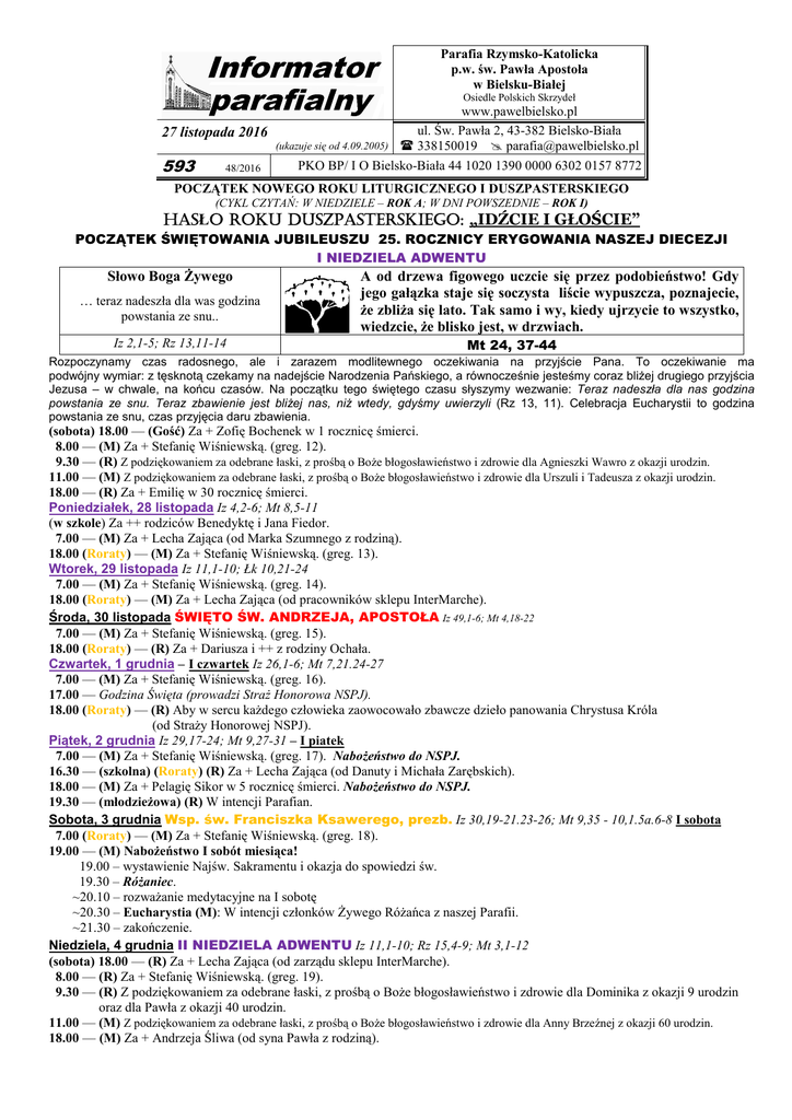 Parafia Rzymsko-Katolicka p.w. św. Pawła Apostoła w Bielsku-Białej Osiedle Polskich Skrzydeł www.pawelbielsko.pl ul. Św. Pawła 2, 43-382 Bielsko-Biała 27 listopada 2016 (ukazuje się od 4.09.2005) 338150019 [email protected] PKO BP/ I O Bielsko-Biała 44 1020 1390 0000 6302 0157 8772 593 48/2016 POCZĄTEK NOWEGO ROKU LITURGICZNEGO I DUSZPASTERSKIEGO (CYKL CZYTAŃ: W NIEDZIELE – ROK A; W DNI POWSZEDNIE – ROK I) HASŁO ROKU DUSZPASTERSKIEGO: „IDŹCIE I GŁOŚCIE” POCZĄTEK ŚWIĘTOWANIA JUBILEUSZU 25. ROCZNICY ERYGOWANIA NASZEJ DIECEZJI I NIEDZIELA ADWENTU Słowo Boga Żywego … teraz nadeszła dla was godzina powstania ze snu.. Iz 2,1-5; Rz 13,11-14 A od drzewa figowego uczcie się przez podobieństwo! Gdy jego gałązka staje się soczysta liście wypuszcza, poznajecie, że zbliża się lato. Tak samo i wy, kiedy ujrzycie to wszystko, wiedzcie, że blisko jest, w drzwiach. Mt 24, 37-44 Rozpoczynamy czas radosnego, ale i zarazem modlitewnego oczekiwania na przyjście Pana. To oczekiwanie ma podwójny wymiar: z tęsknotą czekamy na nadejście Narodzenia Pańskiego, a równocześnie jesteśmy coraz bliżej drugiego przyjścia Jezusa – w chwale, na końcu czasów. Na początku tego świętego czasu słyszymy wezwanie: Teraz nadeszła dla nas godzina powstania ze snu. Teraz zbawienie jest bliżej nas, niż wtedy, gdyśmy uwierzyli (Rz 13, 11). Celebracja Eucharystii to godzina powstania ze snu, czas przyjęcia daru zbawienia. (sobota) 18.00 — (Gość) Za + Zofię Bochenek w 1 rocznicę śmierci. 8.00 — (M) Za + Stefanię Wiśniewską. (greg. 12). 9.30 — (R) Z podziękowaniem za odebrane łaski, z prośbą o Boże błogosławieństwo i zdrowie dla Agnieszki Wawro z okazji urodzin. 11.00 — (M) Z podziękowaniem za odebrane łaski, z prośbą o Boże błogosławieństwo i zdrowie dla Urszuli i Tadeusza z okazji urodzin. 18.00 — (R) Za + Emilię w 30 rocznicę śmierci. Poniedziałek, 28 listopada Iz 4,2-6; Mt 8,5-11 (w szkole) Za ++ rodziców Benedyktę i Jana Fiedor. 7.00 — (M) Za + Lecha Zająca (od Marka Szumnego z rodziną). 18.00 (Roraty) — (M) Za + Stefanię Wiśniewską. (greg. 13). Wtorek, 29 listopada Iz 11,1-10; Łk 10,21-24 7.00 — (M) Za + Stefanię Wiśniewską. (greg. 14). 18.00 (Roraty) — (M) Za + Lecha Zająca (od pracowników sklepu InterMarche). Środa, 30 listopada ŚWIĘTO ŚW. ANDRZEJA, APOSTOŁA Iz 49,1-6; Mt 4,18-22 7.00 — (M) Za + Stefanię Wiśniewską. (greg. 15). 18.00 (Roraty) — (R) Za + Dariusza i ++ z rodziny Ochała. Czwartek, 1 grudnia – I czwartek Iz 26,1-6; Mt 7,21.24-27 7.00 — (M) Za + Stefanię Wiśniewską. (greg. 16). 17.00 — Godzina Święta (prowadzi Straż Honorowa NSPJ). 18.00 (Roraty) — (R) Aby w sercu każdego człowieka zaowocowało zbawcze dzieło panowania Chrystusa Króla (od Straży Honorowej NSPJ). Piątek, 2 grudnia Iz 29,17-24; Mt 9,27-31 – I piatek 7.00 — (M) Za + Stefanię Wiśniewską. (greg. 17). Nabożeństwo do NSPJ. 16.30 — (szkolna) (Roraty) (R) Za + Lecha Zająca (od Danuty i Michała Zarębskich). 18.00 — (M) Za + Pelagię Sikor w 5 rocznicę śmierci. Nabożeństwo do NSPJ. 19.30 — (młodzieżowa) (R) W intencji Parafian. Sobota, 3 grudnia Wsp. św. Franciszka Ksawerego, prezb. Iz 30,19-21.23-26; Mt 9,35 - 10,1.5a.6-8 I sobota 7.00 (Roraty) — (M) Za + Stefanię Wiśniewską. (greg. 18). 19.00 — (M) Nabożeństwo I sobót miesiąca! 19.00 – wystawienie Najśw. Sakramentu i okazja do spowiedzi św. 19.30 – Różaniec. ~20.10 – rozważanie medytacyjne na I sobotę ~20.30 – Eucharystia (M): W intencji członków Żywego Różańca z naszej Parafii. ~21.30 – zakończenie. Niedziela, 4 grudnia II NIEDZIELA ADWENTU Iz 11,1-10; Rz 15,4-9; Mt 3,1-12 (sobota) 18.00 — (R) Za + Lecha Zająca (od zarządu sklepu InterMarche). 8.00 — (R) Za + Stefanię Wiśniewską. (greg. 19). 9.30 — (R) Z podziękowaniem za odebrane łaski, z prośbą o Boże błogosławieństwo i zdrowie dla Dominika z okazji 9 urodzin oraz dla Pawła z okazji 40 urodzin. 11.00 — (M) Z podziękowaniem za odebrane łaski, z prośbą o Boże błogosławieństwo i zdrowie dla Anny Brzeźnej z okazji 60 urodzin. 18.00 — (M) Za + Andrzeja Śliwa (od syna Pawła z rodziną). DIAKONIA SPRZĄTANIA Dziękujemy mieszkańcom z ul. Trzech Diamentów 34 za posprzątanie kościoła, i ofiarę na kościół. Msza św. w ich intencji będzie sprawowana 22 stycznia o godz. 1100. W najbliższą sobotę o posługę czystości prosimy mieszkańców z ul. Trzech Diamentów 36. OGŁOSZENIA DUSZPASTERSKIE Od dzisiaj można się zaopatrywać w opłatki, świece Wigilijnego Dzieła Pomocy Dzieciom i kartki świąteczne oraz lampiony dla dzieci na Roraty. 2. W kaplicy cały czas jest dostępna woda pobłogosławiona (święcona). 3. Roraty w naszym kościele od poniedziałku do piątku o godz. 1800, a w soboty o godz. 700 (wyjątkiem jest I piątek miesiąca – 1630!). Serdecznie zapraszamy nie tylko dzieci! 4. W tym tygodniu przypadają: I czwartek, I piątek i I sobota miesiąca: - w I czwartek od godz. 1700 Godzina Święta prowadzona przez Straż Honorową NSPJ; podczas Mszy św. Komunia św. pod obiema postaciami(!); zachęcamy do korzystania ze spowiedzi św. także w czasie Godziny Świętej(!); na Mszę św. wieczorną zapraszamy dzieci przygotowujące się do I Komunii św. wraz z rodzinami; - w I piątek po Mszy św. porannej i wieczornej nabożeństwo do NSPJ; o godz. 1630 Msza św. szkolna (Roraty) (od 1600 okazja do spowiedzi św.); o 1930 Msza Św. młodzieżowa (wcześniej okazja do spowiedzi św.). - odwiedziny chorych z Komunią św. (prosimy o indywidualny kontakt z Ks. Wikariuszem!); - w I sobotę od godz. 1900 nabożeństwo ku czci Niepokalanego Serca NMP. 5. W przyszłą niedzielę obchodzimy Dzień Modlitwy za Kościół na Wschodzie. Przy drzwiach kościoła będzie zbierana ofiara na pomoc katolikom na Wschodzie. PLAN ODWIEDZIN DUSZPASTERSKICH W NAJBLIŻSZYM CZASIE • Od 26.11. rozpoczynamy odwie