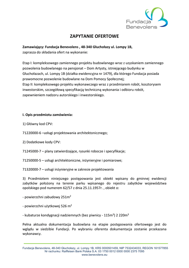 ZAPYTANIE OFERTOWE Zamawiający: Fundacja Benevolens , 48-340 Głuchołazy ul. Lompy 1B, zaprasza do składania ofert na wykonanie: Etap I: kompleksowego zamiennego projektu budowlanego wraz z uzyskaniem zamiennego pozwolenia budowlanego na pensjonat – Dom Artysty, istniejącego budynku w Głuchołazach, ul. Lompy 1B (działka ewidencyjna nr 1479), dla którego Fundacja posiada prawomocne pozwolenie budowlane na Dom Pomocy Społecznej; Etap II: kompleksowego projektu wykonawczego wraz z przedmiarem robót, kosztorysem inwestorskim, szczegółową specyfikacją techniczną wykonania i odbioru robót, zapewnieniem nadzoru autorskiego i inwestorskiego. I. Opis przedmiotu zamówienia: 1) Główny kod CPV: 71220000-6 –usługi projektowania architektonicznego; 2) Dodatkowe kody CPV: 71245000-7 – plany zatwierdzające, rysunki robocze i specyfikacje; 71250000-5 – usługi architektoniczne, inżynieryjne i pomiarowe; 71320000-7 – usługi inżynieryjne w zakresie projektowania 3) Przedmiotem niniejszego postępowania jest obiekt wpisany do gminnej ewidencji zabytków położony na terenie parku wpisanego do rejestru zabytków województwa opolskiego pod numerem 62/57 z dnia 25.11.1957r. , obiekt o: - powierzchni zabudowy 251m2 - powierzchni użytkowej 526 m2 - kubaturze kondygnacji nadziemnych (bez piwnicy - 115m3) 2 220m3 Pełna aktualna dokumentacja budowlana na etapie postępowania ofertowego jest do wglądu w siedzibie Fundacji. Po wybraniu oferenta dokumentacja zostanie przekazana wykonawcy. Fundacja Benevolens, 48-340 Głuchołazy, ul. Lompy 1B, KRS 0000501459, NIP 7532434033, REGON 161577855 Nr rachunku: Raiffeisen Bank Polska S.A. 03 1750 0012 0000 0000 2375 7095 www.benevolens.eu 4) Projekt zamienny budowlany wykonany w I etapie musi być wykonany na podstawie zatwierdzonego projektu budowlanego w zakresie i stopniu dokładności niezbędnym do kompleksowej realizacji robót budowlanych, w wyniku których powstanie obiekt gotowy do użytkowania z zastosowaniem najlepszych dostępnych technologii w zakresie oddziaływania na środowisko, spełniający normy współczynnika przenikania ciepła obowiązujące od 1.01.2021r., uwzględniający pełną rekuperację przy zastosowaniu pomp ciepła (chłodzenie latem), oszczędną instalację elektryczną z elementami inteligentnego sterowania, zmianę części konstrukcyjnej szybu windowego (urządzeń windowych) na konstrukcję „lekką” np. stalową z przeszkleniami, należy rozważyć również zastosowanie stropów sprężonych. 5) Projekt wykonawczy opracowany w ramach II etapu musi być uzupełnieniem i uszczegółowieniem projektu budowlanego w zakresie i stopniu dokładności niezbędnym do sporządzenia przedmiaru robót, kosztorysu inwestorskiego, przygotowania oferty przez wykonawcę i realizacji robót budowlanych z uwzględnieniem opracowania projektu instalacji TV, internetu i systemu przywoławczego, a po zmianach poprawiających energochłonność budynku należy określić parametry pompy ciepła i koniecznych do wykonania ilości gruntowych odwiertów pionowych. W cenie etapu II należy uwzględnić w osobnych pozycjach koszt nadzoru autorskiego i inwestorskiego. 6) Zarówno zamienny projekt budowlany jak i projekt wykonawczy musi spełniać warunki określone w Rozporządzeniu Ministra Infrastruktury z dnia 2 września 2004r. wraz z późniejszymi zmianami (tekst jednolity Dz. U. z 2013 r., poz. 1129) II. Warunki udziału w postępowaniu. Zamawiający wymaga, aby Wykonawca: 1. Posiadał uprawnienie do wykonywania działalności gospodarczej. 2. Posiadał uprawnienia do projektowania w specjalności: • • • • • architektonicznej konstrukcyjno-budowlanej instalacyjnej w zakresie sieci, instalacji i urządzeń cieplnych, wentylacyjnych, gazowych, wodociągowych i kanalizacyjnych instalacyjnej w zakresie sieci, instalacji i urządzeń elektrycznych i elektroenergetycznych, telekomunikacyjnej Fundacja Benevolens, 48-340 Głuchołazy, ul. Lompy 1B, KRS 0000501459, NIP 7532434033, REGON 161577855 Nr rachunku: Raiffeisen Bank Polska S.A. 03 1750 0012 0000 0000 2375 7095 www.benevolens.eu 3. Wykazał, że w okresie ostatnich 3 lat przed upływem składania ofert wykonał należycie oraz zgodnie z wiedzą techniczną i normami technicznymi co najmniej 2 usługi dotyczące wykonania dokumentacji projektowej obejmującej zakresem roboty ogólnobudowlane, elektryczne i sanitarne. 4. Wykazał ilość osób uczestniczących w pracach projektowych dotyczących niniejszego zapytania ofertowego w podziale na osoby zatrudnione na umowę o pracę oraz pozostałe osoby niezatrudnione u Wykonawcy na umowę o pracę. 5. Powinien być wpisany na listę członków izby samorządu zawodowego. III. Warunki wykluczenia Zamówienie nie może być udzielone Wykonawcy powiązanym osobowo lub kapitałowo z Zamawiającym. IV. Wymagania dotyczące przekazania wykonanych prac: 1. Wykonawca przy podpisywaniu umowy na prace projektowe musi zobowiązać się do wyrażenia zgody na wykonywanie dowolnych zmian w dokumentacji przez osoby trzecie posiadające odpowiednie kwalifikacje i uprawnienia. 2. Zamienny projekt budowlany oraz projekt wykonawczy przedłożony zostanie zamawiającemu w postaci: - zamienny projekt budowlany w 5 egzemplarzach drukowanych oraz na płycie CD/DVD w postaci plików źródłowych w wersji edytowalnej oraz w formacie .pdf; - projekt wykonawczy w 3 egzemplarzach drukowanych oraz na płycie CD/DVD w postaci plików źródłowych w wersji edytowalne oraz w formacie .pdf; - przedmiar robót w 3 egzemplarzach drukowanych oraz na płycie CD/DVD w postaci pliku w formacie .pdf; - kosztorys inwestorski w 3 egzemplarzach drukowanych oraz na płycie CD/DVD w postaci pliku w formacie .pdf; - szczegółowa specyfikacja techniczna wykonania i odbioru robót w 3 egzemplarzach drukowanych oraz na płycie CD/DVD w postaci pliku w formacie .pdf; V. Termin realizacji zamówienia: Etap I – nie później niż do dnia 15.11.2016 Etap I