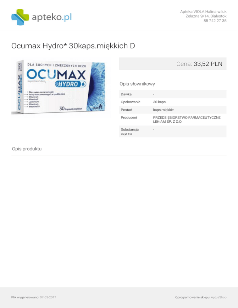 Apteka VIOLA Halina wiluk Żelazna 9/14, Białystok 85 742 27 35 Ocumax Hydro* 30kaps.miękkich D Cena: 33,52 PLN Opis słownikowy Dawka - Opakowanie 30 kaps. Postać kaps.miękkie Producent PRZEDSIĘBIORSTWO FARMACEUTYCZNE LEK-AM SP. Z O.O. Substancja czynna - Opis produktu Plik wygenerowano: 07-03-2017 Powered by TCPDF (www.tcpdf.org) Oprogramowanie sklepu: AptusShop