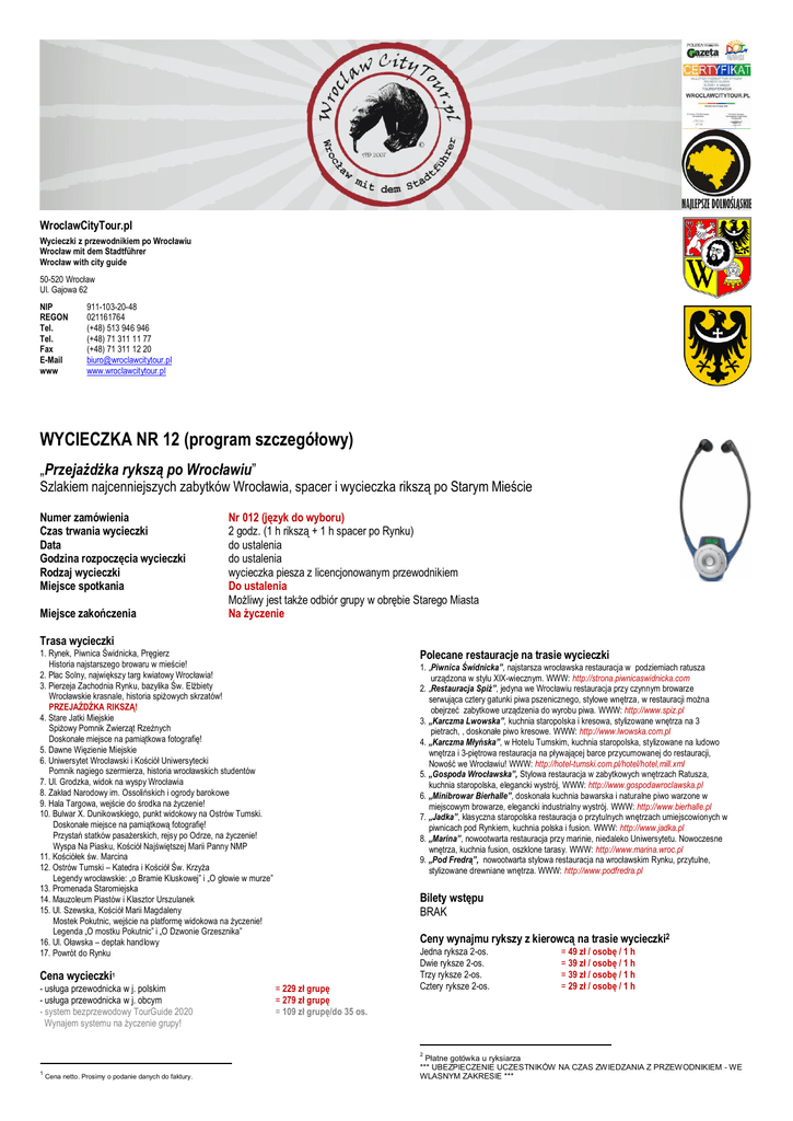 WroclawCityTour.pl Wycieczki z przewodnikiem po Wrocławiu Wrocław mit dem Stadtführer Wrocław with city guide 50-520 Wrocław Ul. Gajowa 62 NIP REGON Tel. Tel. Fax E-Mail www 911-103-20-48 021161764 (+48) 513 946 946 (+48) 71 311 11 77 (+48) 71 311 12 20 [email protected] www.wroclawcitytour.pl WYCIECZKA NR 12 (program szczegółowy) „Przejażdżka rykszą po Wrocławiu” Szlakiem najcenniejszych zabytków Wrocławia, spacer i wycieczka rikszą po Starym Mieście Numer zamówienia Czas trwania wycieczki Data Godzina rozpoczęcia wycieczki Rodzaj wycieczki Miejsce spotkania Miejsce zakończenia Nr 012 (język do wyboru) 2 godz. (1 h rikszą + 1 h spacer po Rynku) do ustalenia do ustalenia wycieczka piesza z licencjonowanym przewodnikiem Do ustalenia Możliwy jest także odbiór grupy w obrębie Starego Miasta Na życzenie Trasa wycieczki Polecane restauracje na trasie wycieczki 1. Rynek, Piwnica Świdnicka, Pręgierz Historia najstarszego browaru w mieście! 2. Plac Solny, największy targ kwiatowy Wrocławia! 3. Pierzeja Zachodnia Rynku, bazylika Św. Elżbiety Wrocławskie krasnale, historia spiżowych skrzatów! PRZEJAŻDŻKA RIKSZĄ! 4. Stare Jatki Miejskie Spiżowy Pomnik Zwierząt Rzeźnych Doskonałe miejsce na pamiątkowa fotografię! 5. Dawne Więzienie Miejskie 6. Uniwersytet Wrocławski i Kościół Uniwersytecki Pomnik nagiego szermierza, historia wrocławskich studentów 7. Ul. Grodzka, widok na wyspy Wrocławia 8. Zakład Narodowy im. Ossolińskich i ogrody barokowe 9. Hala Targowa, wejście do środka na życzenie! 10. Bulwar X. Dunikowskiego, punkt widokowy na Ostrów Tumski. Doskonałe miejsce na pamiątkową fotografię! Przystań statków pasażerskich, rejsy po Odrze, na życzenie! Wyspa Na Piasku, Kościół Najświętszej Marii Panny NMP 11. Kościółek św. Marcina 12. Ostrów Tumski – Katedra i Kościół Św. Krzyża Legendy wrocławskie: „o Bramie Kluskowej” i „O głowie w murze” 13. Promenada Staromiejska 14. Mauzoleum Piastów i Klasztor Urszulanek 15. Ul. Szewska, Kościół Marii Magdaleny Mostek Pokutnic, wejście na platformę widokowa na życzenie! Legenda „O mostku Pokutnic” i „O Dzwonie Grzesznika” 16. Ul. Oławska – deptak handlowy 17. Powrót do Rynku 1. „Piwnica Świdnicka”, najstarsza wrocławska restauracja w podziemiach ratusza urządzona w stylu XIX-wiecznym. WWW: http://strona.piwnicaswidnicka.com 2. „Restauracja Spiż”, jedyna we Wrocławiu restauracja przy czynnym browarze serwująca cztery gatunki piwa pszenicznego, stylowe wnętrza, w restauracji można obejrzeć zabytkowe urządzenia do wyrobu piwa. WWW: http://www.spiz.pl 3. „Karczma Lwowska”, kuchnia staropolska i kresowa, stylizowane wnętrza na 3 pietrach, , doskonałe piwo kresowe. WWW: http://www.lwowska.com.pl 4. „Karczma Młyńska”, w Hotelu Tumskim, kuchnia staropolska, stylizowane na ludowo wnętrza i 3-piętrowa restauracja na pływającej barce przycumowanej do restauracji, Nowość we Wrocławiu! WWW: http://hotel-tumski.com.pl/hotel/hotel,mill.xml 5. „Gospoda Wrocławska”, Stylowa restauracja w zabytkowych wnętrzach Ratusza, kuchnia staropolska, elegancki wystrój, WWW: http://www.gospodawroclawska.pl 6. „Minibrowar Bierhalle”, doskonała kuchnia bawarska i naturalne piwo warzone w miejscowym browarze, elegancki industrialny wystrój. WWW: http://www.bierhalle.pl 7. „Jadka”, klasyczna staropolska restauracja o przytulnych wnętrzach umiejscowionych w piwnicach pod Rynkiem, kuchnia polska i fusion. WWW: http://www.jadka.pl 8. „Marina”, nowootwarta restauracja przy marinie, niedaleko Uniwersytetu. Nowoczesne wnętrza, kuchnia fusion, oszklone tarasy. WWW: http://www.marina.wroc.pl 9. „Pod Fredrą”, nowootwarta stylowa restauracja na wrocławskim Rynku, przytulne, stylizowane drewniane wnętrza. WWW: http://www.podfredra.pl Bilety wstępu BRAK Ceny wynajmu rykszy z kierowcą na trasie wycieczki2 Cena wycieczki1 - usługa przewodnicka w j. polskim - usługa przewodnicka w j. obcym - system bezprzewodowy TourGuide 2020 Wynajem systemu na życzenie grupy! = 229 zł grupę = 279 zł grupę = 109 zł grupę/do 35 os. Jedna ryksza 2-os. Dwie ryksze 2-os. Trzy ryksze 2-os. Cztery ryksze 2-os. 2 1 Cena netto. Prosimy o podanie danych do faktury. = 49 zł / osobę / 1 h = 39 zł / osobę / 1 h = 39 zł / osobę / 1 h = 29 zł / osobę / 1 h Płatne gotówka u ryksiarza *** UBEZPIECZENIE UCZESTNIKÓW NA CZAS ZWIEDZANIA Z PRZEWODNIKIEM - WE WLASNYM ZAKRESIE *** Zdjęcia z wycieczki Nr 012 WroclawCityTour.pl Zwiedzanie miasta z systemem nagłaśnajacym TourGuide 2020-D (do 35 os.) ©