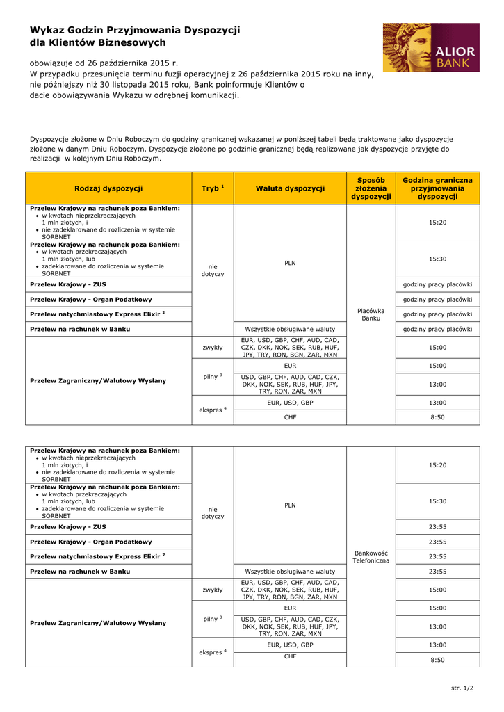 Wykaz Godzin Przyjmowania Dyspozycji dla Klientów Biznesowych obowiązuje od 26 października 2015 r. W przypadku przesunięcia terminu fuzji operacyjnej z 26 października 2015 roku na inny, nie późniejszy niż 30 listopada 2015 roku, Bank poinformuje Klientów o dacie obowiązywania Wykazu w odrębnej komunikacji. Dyspozycje złożone w Dniu Roboczym do godziny granicznej wskazanej w poniższej tabeli będą traktowane jako dyspozycje złożone w danym Dniu Roboczym. Dyspozycje złożone po godzinie granicznej będą realizowane jak dyspozycje przyjęte do realizacji w kolejnym Dniu Roboczym. Rodzaj dyspozycji Tryb Przelew Krajowy na rachunek poza Bankiem: w kwotach nieprzekraczających 1 mln złotych, i nie zadeklarowane do rozliczenia w systemie SORBNET Przelew Krajowy na rachunek poza Bankiem: w kwotach przekraczających 1 mln złotych, lub zadeklarowane do rozliczenia w systemie SORBNET 1 Waluta dyspozycji Sposób złożenia dyspozycji 15:20 nie dotyczy 15:30 PLN Przelew Krajowy - ZUS godziny pracy placówki Przelew Krajowy - Organ Podatkowy Przelew natychmiastowy Express Elixir Godzina graniczna przyjmowania dyspozycji godziny pracy placówki Placówka Banku 2 Przelew na rachunek w Banku zwykły Przelew Zagraniczny/Walutowy Wysłany pilny 3 ekspres Przelew Krajowy na rachunek poza Bankiem: w kwotach nieprzekraczających 1 mln złotych, i nie zadeklarowane do rozliczenia w systemie SORBNET Przelew Krajowy na rachunek poza Bankiem: w kwotach przekraczających 1 mln złotych, lub zadeklarowane do rozliczenia w systemie SORBNET 4 godziny pracy placówki Wszystkie obsługiwane waluty godziny pracy placówki EUR, USD, GBP, CHF, AUD, CAD, CZK, DKK, NOK, SEK, RUB, HUF, JPY, TRY, RON, BGN, ZAR, MXN 15:00 EUR 15:00 USD, GBP, CHF, AUD, CAD, CZK, DKK, NOK, SEK, RUB, HUF, JPY, TRY, RON, ZAR, MXN 13:00 EUR, USD, GBP 13:00 CHF 8:50 15:20 nie dotyczy 15:30 PLN Przelew Krajowy - ZUS 23:55 Przelew Krajowy - Organ Podatkowy 23:55 Przelew natychmiastowy Express Elixir Bankowość Telefoniczna 2 Przelew na rachunek w Banku zwykły Przelew Zagraniczny/Walutowy Wysłany pilny 3 ekspres 4 23:55 Wszystkie obsługiwane waluty 23:55 EUR, USD, GBP, CHF, AUD, CAD, CZK, DKK, NOK, SEK, RUB, HUF, JPY, TRY, RON, BGN, ZAR, MXN 15:00 EUR 15:00 USD, GBP, CHF, AUD, CAD, CZK, DKK, NOK, SEK, RUB, HUF, JPY, TRY, RON, ZAR, MXN 13:00 EUR, USD, GBP 13:00 CHF 8:50 str. 1/2 Rodzaj dyspozycji Tryb Przelew Krajowy na rachunek poza Bankiem: w kwotach nieprzekraczających 1 mln złotych, i nie zadeklarowane do rozliczenia w systemie SORBNET Przelew Krajowy na rachunek poza Bankiem: w kwotach przekraczających 1 mln złotych, lub zadeklarowane do rozliczenia w systemie SORBNET Przelew Krajowy - ZUS 1 Waluta dyspozycji Sposób złożenia dyspozycji 15:205 15:305 nie dotyczy PLN 23:55 5 23:55 5 23:55 5 23:55 5 Wszystkie obsługiwane waluty 23:55 5 EUR, USD, GBP, CHF, AUD, CAD, CZK, DKK, NOK, SEK, RUB, HUF, JPY, TRY, RON, BGN, ZAR, MXN 15:00 5 EUR 15:00 5 USD, GBP, CHF, AUD, CAD, CZK, DKK, NOK, SEK, RUB, HUF, JPY, TRY, RON, ZAR, MXN 13:00 5 EUR, USD, GBP 13:00 5 CHF 8:50 Przelew Krajowy - Organ Podatkowy Przelew natychmiastowy Express Elixir Przelew natychmiastowy BlueCash 2 Bankowość Internetowa 2 Przelew na rachunek w Banku zwykły Przelew Zagraniczny/Walutowy Wysłany Godzina graniczna przyjmowania dyspozycji pilny 3 ekspres 4 5 Przelewy Zagraniczne/Walutowe Otrzymane zaksięgowane na rachunku Banku w Dniu Roboczym przed godziną graniczną wskazaną poniżej zostaną zaksięgowane na rachunku Klienta w tym samym Dniu Roboczym. Przelewy zaksięgowane na rachunku Banku po godzinie granicznej zostaną zaksięgowane na rachunku Klienta w kolejnym Dniu Roboczym. W przypadku przelewów spełniających warunki Ustawy o Usługach Płatniczych księgowanie nastąpi z datą waluty odpowiadającą dacie uznania rachunku Banku. Godzina graniczna Przelew krajowy i Przelew Zagraniczny/Walutowy Otrzymany spełniający warunki Ustawy o Usługach Płatniczych 6 Przelew krajowy i Przelew Zagraniczny/Walutowy Otrzymany nie spełniający warunków Ustawy o Usługach Płatniczych 17:20 15:00 1 Dotyczy Przelewów Zagranicznych/Walutowych Wysłanych. 2 Możliwość realizacji przelewu uzależniona jest od dostępności systemu banku, w którym prowadzony jest rachunek odbiorcy przelewu i jest weryfikowana każdorazowo przy próbie realizacji przelewu. Klient otrzymuje informację o możliwości realizacji operacji lub jej braku. 3 Przelewy Zagraniczne/Walutowe Wysłane w walucie BGN, nie będą realizowane w trybie pilnym. 4 Przelewy Zagraniczne/Walutowe Wysłane w walutach AUD, CAD, CZK, DKK, SEK, NOK, RUB, HUF, JPY, TRY, RON, BGN, ZAR, MXN nie będą realizowane w trybie ekspresowym. 5 Przelewy zlecone za pomocą Paczką Zleceń lub Paczki Płacowej muszą zostać złożone 60 minut przed godziną graniczną danego rodzaju transakcji, aby zostały uznane za złożone w danym Dniu Roboczym. Przelewu Express Elixir nie można zlecić za pomocą Paczki Płacowej. Przelewu BlueCash nie można zlecić za pomocą Paczki Zleceń ani Paczki Płacowej. 6 Przelew w walutach EUR, CZK, DKK, SEK, HUF, GBP, PLN, NOK ,CHF, RON, BGN realizowany z jednego z krajów wymienionych w UUP. str. 2/2