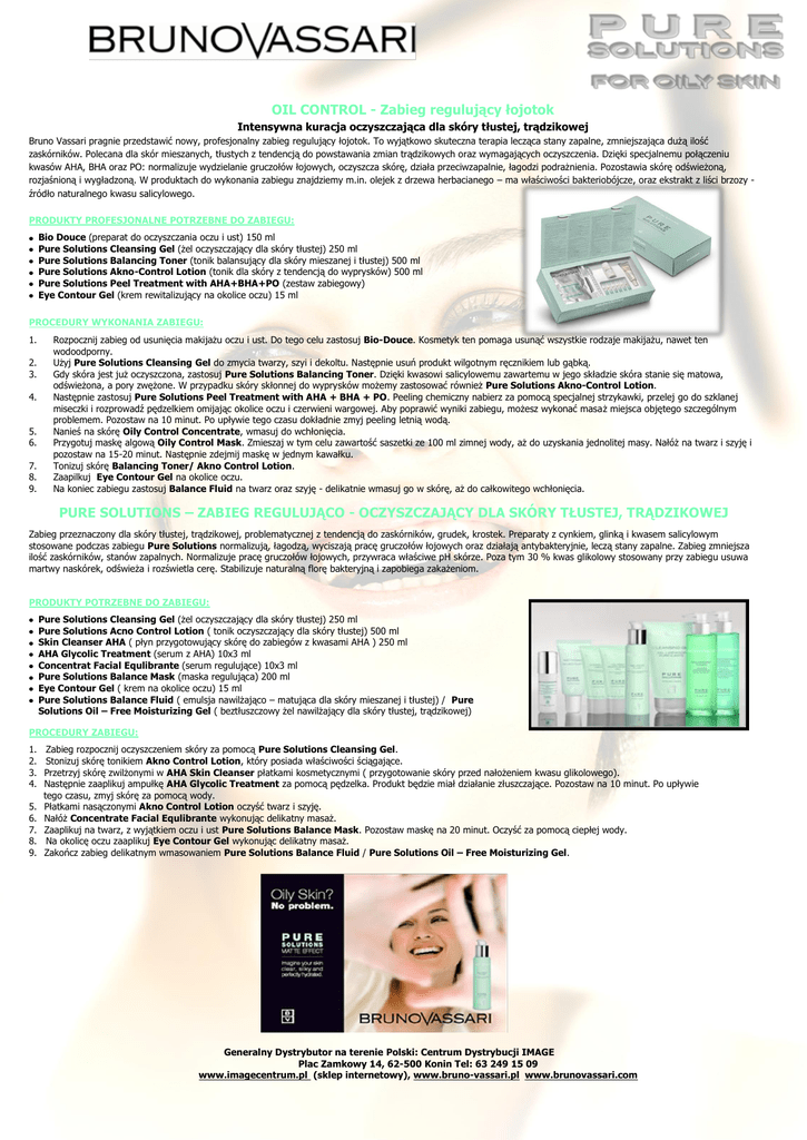 OIL CONTROL - Zabieg regulujący łojotok Intensywna kuracja oczyszczająca dla skóry tłustej, trądzikowej Bruno Vassari pragnie przedstawić nowy, profesjonalny zabieg regulujący łojotok. To wyjątkowo skuteczna terapia lecząca stany zapalne, zmniejszająca dużą ilość zaskórników. Polecana dla skór mieszanych, tłustych z tendencją do powstawania zmian trądzikowych oraz wymagających oczyszczenia. Dzięki specjalnemu połączeniu kwasów AHA, BHA oraz PO: normalizuje wydzielanie gruczołów łojowych, oczyszcza skórę, działa przeciwzapalnie, łagodzi podrażnienia. Pozostawia skórę odświeżoną, rozjaśnioną i wygładzoną. W produktach do wykonania zabiegu znajdziemy m.in. olejek z drzewa herbacianego – ma właściwości bakteriobójcze, oraz ekstrakt z liści brzozy źródło naturalnego kwasu salicylowego. PRODUKTY PROFESJONALNE POTRZEBNE DO ZABIEGU: Bio Douce (preparat do oczyszczania oczu i ust) 150 ml Pure Solutions Cleansing Gel (żel oczyszczający dla skóry tłustej) 250 ml Pure Solutions Balancing Toner (tonik balansujący dla skóry mieszanej i tłustej) 500 ml Pure Solutions Akno-Control Lotion (tonik dla skóry z tendencją do wyprysków) 500 ml Pure Solutions Peel Treatment with AHA+BHA+PO (zestaw zabiegowy) Eye Contour Gel (krem rewitalizujący na okolice oczu) 15 ml PROCEDURY WYKONANIA ZABIEGU: 1. 2. 3. 4. 5. 6. 7. 8. 9. Rozpocznij zabieg od usunięcia makijażu oczu i ust. Do tego celu zastosuj Bio-Douce. Kosmetyk ten pomaga usunąć wszystkie rodzaje makijażu, nawet ten wodoodporny. Użyj Pure Solutions Cleansing Gel do zmycia twarzy, szyi i dekoltu. Następnie usuń produkt wilgotnym ręcznikiem lub gąbką. Gdy skóra jest już oczyszczona, zastosuj Pure Solutions Balancing Toner. Dzięki kwasowi salicylowemu zawartemu w jego składzie skóra stanie się matowa, odświeżona, a pory zwężone. W przypadku skóry skłonnej do wyprysków możemy zastosować również Pure Solutions Akno-Control Lotion. Następnie zastosuj Pure Solutions Peel Treatment with AHA + BHA + PO. Peeling chemiczny nabierz za pomocą specjalnej strzykawki, przelej go do szklanej miseczki i rozprowadź pędzelkiem omijając okolice oczu i czerwieni wargowej. Aby poprawić wyniki zabiegu, możesz wykonać masaż miejsca objętego szczególnym problemem. Pozostaw na 10 minut. Po upływie tego czasu dokładnie zmyj peeling letnią wodą. Nanieś na skórę Oily Control Concentrate, wmasuj do wchłonięcia. Przygotuj maskę algową Oily Control Mask. Zmieszaj w tym celu zawartość saszetki ze 100 ml zimnej wody, aż do uzyskania jednolitej masy. Nałóż na twarz i szyję i pozostaw na 15-20 minut. Następnie zdejmij maskę w jednym kawałku. Tonizuj skórę Balancing Toner/ Akno Control Lotion. Zaapilkuj Eye Contour Gel na okolice oczu. Na koniec zabiegu zastosuj Balance Fluid na twarz oraz szyję - delikatnie wmasuj go w skórę, aż do całkowitego wchłonięcia. PURE SOLUTIONS – ZABIEG REGULUJĄCO - OCZYSZCZAJĄCY DLA SKÓRY TŁUSTEJ, TRĄDZIKOWEJ Zabieg przeznaczony dla skóry tłustej, trądzikowej, problematycznej z tendencją do zaskórników, grudek, krostek. Preparaty z cynkiem, glinką i kwasem salicylowym stosowane podczas zabiegu Pure Solutions normalizują, łagodzą, wyciszają pracę gruczołów łojowych oraz działają antybakteryjnie, leczą stany zapalne. Zabieg zmniejsza ilość zaskórników, stanów zapalnych. Normalizuje pracę gruczołów łojowych, przywraca właściwe pH skórze. Poza tym 30 % kwas glikolowy stosowany przy zabiegu usuwa martwy naskórek, odświeża i rozświetla cerę. Stabilizuje naturalną florę bakteryjną i zapobiega zakażeniom. PRODUKTY POTRZEBNE DO ZABIEGU: Pure Solutions Cleansing Gel (żel oczyszczający dla skóry tłustej) 250 ml Pure Solutions Acno Control Lotion ( tonik oczyszczający dla skóry tłustej) 500 ml Skin Cleanser AHA ( płyn przygotowujący skórę do zabiegów z kwasami AHA ) 250 ml AHA Glycolic Treatment (serum z AHA) 10x3 ml Concentrat Facial Equlibrante (serum regulujące) 10x3 ml Pure Solutions Balance Mask (maska regulująca) 200 ml Eye Contour Gel ( krem na okolice oczu) 15 ml Pure Solutions Balance Fluid ( emulsja nawilżająco – matująca dla skóry mieszanej i tłustej) / Pure Solutions Oil – Free Moisturizing Gel ( beztłuszczowy żel nawilżający dla skóry tłustej, trądzikowej) PROCEDURY ZABIEGU: 1. 2. 3. 4. 5. 6. 7. 8. 9. Zabieg rozpocznij oczyszczeniem skóry za pomocą Pure Solutions Cleansing Gel. Stonizuj skórę tonikiem Akno Control Lotion, który posiada właściwości ściągające. Przetrzyj skórę zwilżonymi w AHA Skin Cleanser płatkami kosmetycznymi ( przygotowanie skóry przed nałożeniem kwasu glikolowego). Następnie zaaplikuj ampułkę AHA Glycolic Treatment za pomocą pędzelka. Produkt będzie miał działanie złuszczające. Pozostaw na 10 minut. Po upływie tego czasu, zmyj skórę za pomocą wody. Płatkami nasączonymi Akno Control Lotion oczyść twarz i szyję. Nałóż Concentrate Facial Equlibrante wykonując delikatny masaż. Zaaplikuj na twarz, z wyjątkiem oczu i ust Pure Solutions Balance Mask. Pozostaw maskę na 20 minut. Oczyść za pomocą ciepłej wody. Na okolicę oczu zaaplikuj Eye Contour Gel wykonując delikatny masaż. Zakończ zabieg delikatnym wmasowaniem Pure Solutions Balance Fluid / Pure Solutions Oil – Free Moisturizing Gel. Generalny Dystrybutor na terenie Polski: Centrum Dystrybucji IMAGE Plac Zamkowy 14, 62-500 Konin Tel: 63 249 15 09 www.imagecentrum.pl (sklep internetowy), www.bruno-vassari.pl www.brunovassari.com PURE SOLUTIONS – Zabieg oczyszczający dla skóry mieszanej i tłustej Zabieg oczyszczająco – normalizujący polecany dla skóry mieszanej, tłustej, zanieczyszczonej. Dzięki zawartości ekstraktu z kwiatu Irysa, cynku, kwasu salicylowego, witamin z grupy B, zabieg Pure Solutions powoduje, ze skóra staje się oczyszczona z nadmiaru serum, zmatowiona i jednocześnie odświeżona na długi czas. Podczas zabiegu 