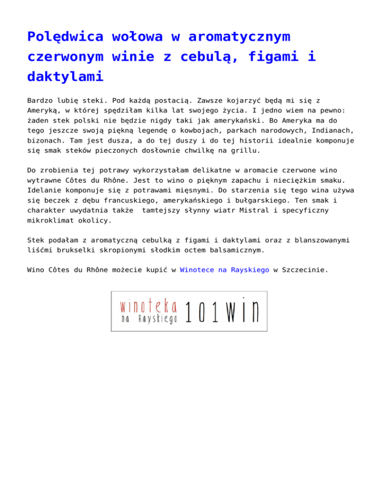 Polędwica wołowa w aromatycznym czerwonym winie z cebulą, figami i daktylami Bardzo lubię steki. Pod każdą postacią. Zawsze kojarzyć będą mi się z Ameryką, w której spędziłam kilka lat swojego życia. I jedno wiem na pewno: żaden stek polski nie będzie nigdy taki jak amerykański. Bo Ameryka ma do tego jeszcze swoją piękną legendę o kowbojach, parkach narodowych, Indianach, bizonach. Tam jest dusza, a do tej duszy i do tej historii idealnie komponuje się smak steków pieczonych dosłownie chwilkę na grillu. Do zrobienia tej potrawy wykorzystałam delikatne w aromacie czerwone wino wytrawne Côtes du Rhône. Jest to wino o pięknym zapachu i nieciężkim smaku. Idelanie komponuje się z potrawami mięsnymi. Do starzenia się tego wina używa się beczek z dębu francuskiego, amerykańskiego i bułgarskiego. Ten smak i charakter uwydatnia także tamtejszy słynny wiatr Mistral i specyficzny mikroklimat okolicy. Stek podałam z aromatyczną cebulką z figami i daktylami oraz z blanszowanymi liśćmi brukselki skropionymi słodkim octem balsamicznym. Wino Côtes du Rhône możecie kupić w Winotece na Rayskiego w Szczecinie. Potrzebujesz: 2 polędwice wołowe, 1 cebula, 8 fig, 8 daktyli, 3-4 łyżeczki ksylitolu, odrobina masła klarowanego, 250 ml bulionu warzywnego, 250 ml wina Côtes du Rhône, 300 g brukselki, ocet balsamiczny i ksylitol Przygotuj bulion warzywny: w 500 ml wody zagotuj i na małym ogniu trzymaj pietruszkę, marchewkę, seler i por z dwoma ziarenkami ziela angielskiego i listkami laurowymi. Dopraw solą i pieprzem. Na patelni na maśle klarowanym zeszklij cebulkę pokrojoną w drobną kostkę. Dodaj ksylitol, pokrojone w drobne paseczki figi i daktyle. Podsmaż na małym ogniu około 10 minut do połączenia smaków. Zalej winem i bulionem warzywnym. Trzymaj na małym gazie przez dwie godziny do odparowania wody. Na koniec sprawdź czy nie potrzeba soli i pieprzu. Steki usmaż na maśle klarowanym na patelni grillowej. Stek o grubości 2 cm smaż 4 minuty z każdej strony. Dopraw solą dopiero na sam koniec, już po usmażeniu mięsa. Brukselkę obierz z listków. Zagotuj wodę w garnku z odrobiną octu i ksylitolu. Wrzuć listki brukselki na 3 minutki. Wyjmij, odcedź i dokładnie osusz. W małym garnuszku na wolnym ogniu przygotujesz teraz słodki ocet balsamiczny. Wlej odpowiednią ilość octu i dopraw ksylitolem wedle uznania. Trzymaj na wolnym gazie do zgęstnienia sosu i dokładnego połączenia składników. Ostygniętym sosem skrop liście brukselki. Stek podawaj z winną cebulką, obok ułóż liście brukselki. Smacznego!