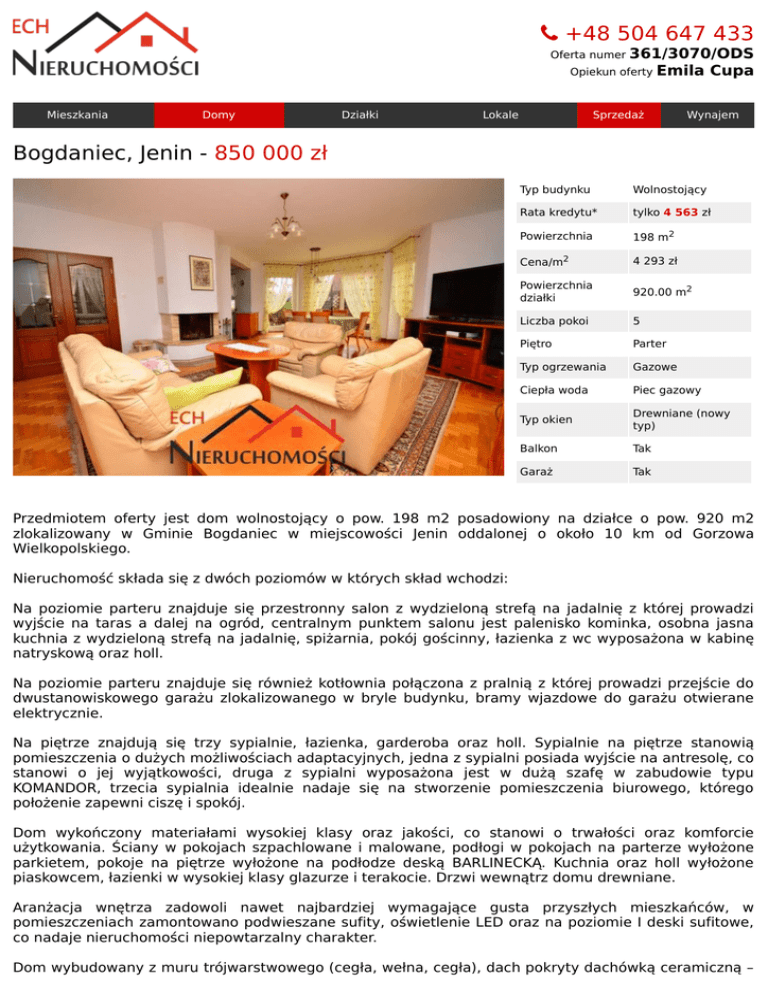 +48504647433 Ofertanumer361/3070/ODS OpiekunofertyEmilaCupa Mieszkania Domy Działki Lokale Sprzedaż Wynajem Bogdaniec,Jenin-850000zł Typbudynku Wolnostojący Ratakredytu* tylko4563zł Powierzchnia 198m2 Cena/m2 4293zł Powierzchnia działki 920.00m2 Liczbapokoi 5 Piętro Parter Typogrzewania Gazowe Ciepławoda Piecgazowy Typokien Drewniane(nowy typ) Balkon Tak Garaż Tak Przedmiotem oferty jest dom wolnostojący o pow. 198 m2 posadowiony na działce o pow. 920 m2 zlokalizowany w Gminie Bogdaniec w miejscowości Jenin oddalonej o około 10 km od Gorzowa Wielkopolskiego. Nieruchomośćskładasięzdwóchpoziomówwktórychskładwchodzi: Na poziomie parteru znajduje się przestronny salon z wydzieloną strefą na jadalnię z której prowadzi wyjście na taras a dalej na ogród, centralnym punktem salonu jest palenisko kominka, osobna jasna kuchniazwydzielonąstrefąnajadalnię,spiżarnia,pokójgościnny,łazienkazwcwyposażonawkabinę natryskowąorazholl. Na poziomie parteru znajduje się również kotłownia połączona z pralnią z której prowadzi przejście do dwustanowiskowego garażu zlokalizowanego w bryle budynku, bramy wjazdowe do garażu otwierane elektrycznie. Na piętrze znajdują się trzy sypialnie, łazienka, garderoba oraz holl. Sypialnie na piętrze stanowią pomieszczeniaodużychmożliwościachadaptacyjnych,jednazsypialniposiadawyjścienaantresolę,co stanowi o jej wyjątkowości, druga z sypialni wyposażona jest w dużą szafę w zabudowie typu KOMANDOR, trzecia sypialnia idealnie nadaje się na stworzenie pomieszczenia biurowego, którego położeniezapewniciszęispokój. Dom wykończony materiałami wysokiej klasy oraz jakości, co stanowi o trwałości oraz komforcie użytkowania. Ściany w pokojach szpachlowane i malowane, podłogi w pokojach na parterze wyłożone parkietem, pokoje na piętrze wyłożone na podłodze deską BARLINECKĄ. Kuchnia oraz holl wyłożone piaskowcem,łazienkiwwysokiejklasyglazurzeiterakocie.Drzwiwewnątrzdomudrewniane. Aranżacja wnętrza zadowoli nawet najbardziej wymagające gusta przyszłych mieszkańców, w pomieszczeniachzamontowanopodwieszanesufity,oświetlenieLEDoraznapoziomieIdeskisufitowe, conadajenieruchomościniepowtarzalnycharakter. Domwybudowanyzmurutrójwarstwowego(cegła,wełna,cegła),dachpokrytydachówkąceramiczną– KARPIÓWKĄ.Ogrzewanienieruchomościzapomocąpiecagazowegodwufunkcyjnego.Oknadrewniane, nowegotypu. Drzwi wejściowe antywłamaniowe typu GERDA. Dla zwiększenia bezpieczeństwa domowników oraz zabezpieczenia mienia zamontowane zostały również rolety zewnętrzne antywłamaniowe oraz rozprowadzonosystemalarmowy. Posesja wokół nieruchomości w pełni zagospodarowana i zadbana, co stanowi niewątpliwie wizytówkę domu. Ogród z licznymi nasadzeniami, zadbany, dla zwiększenia komfortu właścicieli rozprowadzony został systemsamonawadniający.Naposesjiposadowionajesttakżedrewutnia. Licznaroślinnośćzapewnimieszkańcomidealnemiejscenaodpoczynekorazrekreacjewokresieletnim. Działka w pełni ogrodzona, brama na posesje otwierana automatycznie. Wjazd do garażu oraz teren wokółdomuwyłożonykostkągranitową. Dbałość o szczegóły oraz precyzja z jaką wykonany został dom zapewniają niewątpliwie atrakcyjną ofertę,którazadowolikażdegokoneserakomfortuorazpiękna. Dodatkowymatutemnieruchomościjestjejlokalizacja,zapewniającaciszęispokójwotoczeniuzieleni, sąsiedztwo stanowi zabudowa domów jednorodzinnych. Jenin jest również bardzo dobrze skomunikowanyzGorzowemWielkopolskim. Media:prąd,kanalizacja,gaz,woda. ZAPRASZAMYNAPREZENTACJĘNIERUCHOMOŚCI!!! BEZPŁATNIEPORÓWNAMYKREDYTYHIPOTECZNE25BANKÓW!!! ul.MieszkaI-go2/3,66-400GorzówWlkp.,telefon:+48504647443,e-mail:[email protected]
