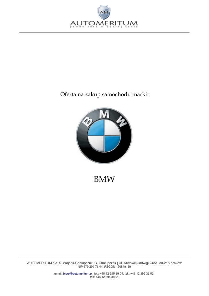 Oferta na zakup samochodu marki: BMW AUTOMERITUM s.c. S. Wojdak-Chałupczak, C. Chałupczak | Ul. Królowej Jadwigi 243A, 30-218 Kraków NIP 679 299 78 44, REGON 120849159 email: [email protected], tel.: +48 12 395 39 04, tel.: +48 12 395 39 02, fax: +48 12 395 39 01 Załącznik do Umowy z dnia __ __ _____ Informacje podstawowe: Marka: BMW Model: F30 320d Luxury Line Rodzaj nadwozia: Sedan Numer VIN: WBA3D310X0J264111 Pierwsza rejestracja/produkcja: 25.04.2012 / 02.04.2012 Przebieg: 138 047 km Rodzaj silnika: 2.0 diesel Moc silnika: 135 kW / 184 KM Rodzaj skrzyni biegów: Automatyczna 8-stopniowa Sportautomatic Kolor nadwozia: Black Sapphire Metallic (475) Historia pojazdu: Pisemna gwarancja bezwypadkowości oraz oryginalnego przebiegu samochodu. Brak możliwości wykluczenia usuniętej szkody parkingowej. Wyposażenie m.in.: Pakiet Luxury Line Automatyczne światła System nawigacji Professional Fotochromatyczne lusterko wsteczne Skrzynia biegów Sportautomatic Pakiet schowków Łopatki do zmiany biegów Pakiet oświetlenia Wyświetlacz HAED UP Lakier metalizowany Tempomat z funkcją hamowania Servotronic Reflektory ksenonowe Kierunkowskazy w lusterkach Skórzana tapicerka VENETOBEIGE EXKLUSIVNA Układ zmywania reflektorów Światła do jazdy dziennej LED Szyberdach elektryczny BMW Teleservices Sportowe fotele Elektrycznie sterowane lusterka Podgrzewane fotele z podparciem lędźwi Elektryczne szyby przód / tył Dwustrefowa klimatyzacja automatyczna Dzielona tylna kanapa Skórzana kierownica Podłokietnik środkowy Multifunckyjna kierownica Dodatkowe gniazdo 12V System alarmowy Reflektory przeciwmgłowe System Audio CD/Mp3/AUX/USB Komputer pokładowy System iDrive Centralny zamek Czujniki parkowania przód / tył Immobiliser Czujnik deszczu AIRBAG Pakiet chrom ABS Aluminiowe felgi Komplet kluczyków AUTOMERITUM s.c. S. Wojdak-Chałupczak, C. Chałupczak | Ul. Królowej Jadwigi 243A, 30-218 Kraków NIP 679 299 78 44, REGON 120849159 email: [email protected], tel.: +48 12 395 39 04, tel.: +48 12 395 39 02, fax: +48 12 395 39 01 Załącznik do Umowy z dnia __ __ _____ AUTOMERITUM s.c. S. Wojdak-Chałupczak, C. Chałupczak | Ul. Królowej Jadwigi 243A, 30-218 Kraków NIP 679 299 78 44, REGON 120849159 email: [email protected], tel.: +48 12 395 39 04, tel.: +48 12 395 39 02, fax: +48 12 395 39 01 Załącznik do Umowy z dnia __ __ _____ AUTOMERITUM s.c. S. Wojdak-Chałupczak, C. Chałupczak | Ul. Królowej Jadwigi 243A, 30-218 Kraków NIP 679 299 78 44, REGON 120849159 email: [email protected], tel.: +48 12 395 39 04, tel.: +48 12 395 39 02, fax: +48 12 395 39 01 Załącznik do Umowy z dnia __ __ _____ AUTOMERITUM s.c. S. Wojdak-Chałupczak, C. Chałupczak | Ul. Królowej Jadwigi 243A, 30-218 Kraków NIP 679 299 78 44, REGON 120849159 email: [email protected], tel.: +48 12 395 39 04, tel.: +48 12 395 39 02, fax: +48 12 395 39 01 Załącznik do Umowy z dnia __ __ _____ AUTOMERITUM s.c. S. Wojdak-Chałupczak, C. Chałupczak | Ul. Królowej Jadwigi 243A, 30-218 Kraków NIP 679 299 78 44, REGON 120849159 email: [email protected], tel.: +48 12 395 39 04, tel.: +48 12 395 39 02, fax: +48 12 395 39 01 Załącznik do Umowy z dnia __ __ _____ AUTOMERITUM s.c. S. Wojdak-Chałupczak, C. Chałupczak | Ul. Królowej Jadwigi 243A, 30-218 Kraków NIP 679 299 78 44, REGON 120849159 email: [email protected], tel.: +48 12 395 39 04, tel.: +48 12 395 39 02, fax: +48 12 395 39 01 Załącznik do Umowy z dnia __ __ _____ AUTOMERITUM s.c. S. Wojdak-Chałupczak, C. Chałupczak | Ul. Królowej Jadwigi 243A, 30-218 Kraków NIP 679 299 78 44, REGON 120849159 email: [email protected], tel.: +48 12 395 39 04, tel.: +48 12 395 39 02, fax: +48 12 395 39 01 Załącznik do Umowy z dnia __ __ _____ AUTOMERITUM s.c. S. Wojdak-Chałupczak, C. Chałupczak | Ul. Królowej Jadwigi 243A, 30-218 Kraków NIP 679 299 78 44, REGON 120849159 email: [email protected], tel.: +48 12 395 39 04, tel.: +48 12 395 39 02, fax: +48 12 395 39 01 Załącznik do Umowy z dnia __ __ _____ www.automeritum.pl Nasi partnerzy: AUTOMERITUM s.c. S. Wojdak-Chałupczak, C. Chałupczak | Ul. Królowej Jadwigi 243A, 30-218 Kraków NIP 679 299 78 44, REGON 120849159 email: [email protected], tel.: +48 12 395 39 04, tel.: +48 12 395 39 02, fax: +48 12 395 39 01