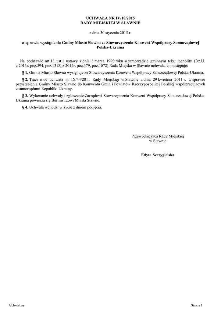 UCHWAŁA NR IV/18/2015 RADY MIEJSKIEJ W SŁAWNIE z dnia 30 stycznia 2015 r. w sprawie wystąpienia Gminy Miasto Sławno ze Stowarzyszenia Konwent Współpracy Samorządowej Polska-Ukraina Na podstawie art.18 ust.1 ustawy z dnia 8 marca 1990 roku o samorządzie gminnym tekst jednolity (Dz.U. z 2013r. poz.594, poz.1318; z 2014r. poz.379, poz.1072) Rada Miejska w Sławnie uchwala, co następuje: § 1. Gmina Miasto Sławno występuje ze Stowarzyszenia Konwent Współpracy Samorządowej Polska-Ukraina. § 2. Traci moc uchwała nr IX/44/2011 Rady Miejskiej w Sławnie z dnia 29 kwietnia 2011 r. w sprawie przystąpienia Gminy Miasto Sławno do Konwentu Gmin i Powiatów Rzeczypospolitej Polskiej współpracujących z samorządami Republiki Ukrainy. § 3. Wykonanie uchwały i zgłoszenie Zarządowi Stowarzyszenia Konwent Współpracy Samorządowej PolskaUkraina powierza się Burmistrzowi Miasta Sławno. § 4. Uchwała wchodzi w życie z dniem podjęcia. Przewodnicząca Rady Miejskiej w Sławnie Edyta Szczygielska Uchwalony Strona 1 Uzasadnienie Gmina Miast Sławno, Uchwałą Nr IX/44/2011 Rady Miejskiej w Sławnie z dnia 29 kwietnia 2011 roku, przystąpiła do stowarzyszenia „Konwent Gmin i Powiatów Rzeczypospolitej Polskiej współpracujących z samorządami Republiki Ukrainy”. W tym samym roku stowarzyszenie zmieniło nazwę na „Konwent Współpracy Samorządowej Polska-Ukraina”. Jednym z działań statutowych stowarzyszenia jest inicjowanie i realizacja projektów służących współpracy z samorządami Republiki Ukrainy. Dzięki działaniom KWSPU Gmina Miasto Sławno podpisała list intencyjny, dotyczący współpracy międzynarodowej, z przedstawicielami miasta Krasnopieriekopsk położonego na terenie Autonomicznej Republiki Krymu. Efektem podpisanego listu intencyjnego była wizyta delegacji miasta Krasnopieriekopsk w Sławnie w 2011 roku. Jednak kontynuowanie działań, zmierzających do podpisania umowy partnerskiej pomiędzy miastem Sławno i miastem Krasnopieriekopsk zostało zaniechane ze strony partnera ukraińskiego. Corocznie, Urząd Miejski w Sławnie, wysyłał pisma do władz miasta Krasnopieriekopsk, deklarujące chęć podpisania umowy o współpracy. Nie otrzymano odpowiedzi na żadne z pism. O tych utrudnieniach Urząd Miejski w Sławnie informował Biuro Konwentu Współpracy Samorządowej Polska-Ukraina z siedzibą w Szczecinie. Również z tej instytucji nie otrzymaliśmy wsparcia. Zgodnie z Uchwałą Nr 4/2010 Walnego Zebrania Członków Stowarzyszenia Konwent Gmin i Powiatów Rzeczypospolitej Polskiej współpracujących z samorządami Republiki Ukrainy z dnia 7 września 2010 roku w sprawie wysokości i terminu zapłaty składek członkowskich przez członków Stowarzyszenia, gminy miejskie o liczbie mieszkańców od 5 tys. do 50 tys. wpłacają roczną składkę w wysokości 6.000,00 zł. Gmina Miasto Sławno corocznie opłaca składkę w podanej wysokości. W obecnym stanie (również geopolitycznym), udział Gminy Miasto Sławno w stowarzyszeniu „Konwent Współpracy Samorządowej Polska-Ukraina”, polegający jedynie na opłacaniu rocznej składki, obciążającej budżet miasta, bez efektów na wzmocnienie kontaktów z partnerem ukraińskim, jest bezcelowy. Uchwalony Strona 1