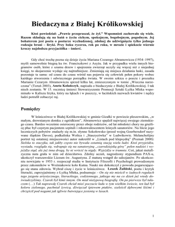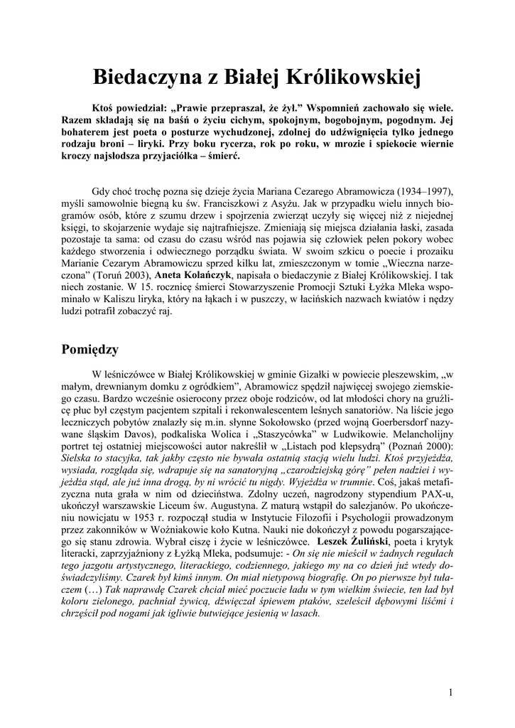 Biedaczyna z Białej Królikowskiej Ktoś powiedział: „Prawie przepraszał, że żył.” Wspomnień zachowało się wiele. Razem składają się na baśń o życiu cichym, spokojnym, bogobojnym, pogodnym. Jej bohaterem jest poeta o posturze wychudzonej, zdolnej do udźwignięcia tylko jednego rodzaju broni – liryki. Przy boku rycerza, rok po roku, w mrozie i spiekocie wiernie kroczy najsłodsza przyjaciółka – śmierć. Gdy choć trochę pozna się dzieje życia Mariana Cezarego Abramowicza (1934–1997), myśli samowolnie biegną ku św. Franciszkowi z Asyżu. Jak w przypadku wielu innych biogramów osób, które z szumu drzew i spojrzenia zwierząt uczyły się więcej niż z niejednej księgi, to skojarzenie wydaje się najtrafniejsze. Zmieniają się miejsca działania łaski, zasada pozostaje ta sama: od czasu do czasu wśród nas pojawia się człowiek pełen pokory wobec każdego stworzenia i odwiecznego porządku świata. W swoim szkicu o poecie i prozaiku Marianie Cezarym Abramowiczu sprzed kilku lat, zmieszczonym w tomie „Wieczna narzeczona” (Toruń 2003), Aneta Kolańczyk, napisała o biedaczynie z Białej Królikowskiej. I tak niech zostanie. W 15. rocznicę śmierci Stowarzyszenie Promocji Sztuki Łyżka Mleka wspominało w Kaliszu liryka, który na łąkach i w puszczy, w łacińskich nazwach kwiatów i nędzy ludzi potrafił zobaczyć raj. Pomiędzy W leśniczówce w Białej Królikowskiej w gminie Gizałki w powiecie pleszewskim, „w małym, drewnianym domku z ogródkiem”, Abramowicz spędził najwięcej swojego ziemskiego czasu. Bardzo wcześnie osierocony przez oboje rodziców, od lat młodości chory na gruźlicę płuc był częstym pacjentem szpitali i rekonwalescentem leśnych sanatoriów. Na liście jego leczniczych pobytów znalazły się m.in. słynne Sokołowsko (przed wojną Goerbersdorf nazywane śląskim Davos), podkaliska Wolica i „Staszycówka” w Ludwikowie. Melancholijny portret tej ostatniej miejscowości autor nakreślił w „Listach pod klepsydrą” (Poznań 2000): Sielska to stacyjka, tak jakby często nie bywała ostatnią stacją wielu ludzi. Ktoś przyjeżdża, wysiada, rozgląda się, wdrapuje się na sanatoryjną „czarodziejską górę” pełen nadziei i wyjeżdża stąd, ale już inna drogą, by ni wrócić tu nigdy. Wyjeżdża w trumnie. Coś, jakaś metafizyczna nuta grała w nim od dzieciństwa. Zdolny uczeń, nagrodzony stypendium PAX-u, ukończył warszawskie Liceum św. Augustyna. Z maturą wstąpił do salezjanów. Po ukończeniu nowicjatu w 1953 r. rozpoczął studia w Instytucie Filozofii i Psychologii prowadzonym przez zakonników w Woźniakowie koło Kutna. Nauki nie dokończył z powodu pogarszającego się stanu zdrowia. Wybrał ciszę i życie w leśniczówce. Leszek Żuliński, poeta i krytyk literacki, zaprzyjaźniony z Łyżką Mleka, podsumuje: - On się nie mieścił w żadnych regułach tego jazgotu artystycznego, literackiego, codziennego, jakiego my na co dzień już wtedy doświadczyliśmy. Czarek był kimś innym. On miał nietypową biografię. On po pierwsze był tułaczem (…) Tak naprawdę Czarek chciał mieć poczucie ładu w tym wielkim świecie, ten ład był koloru zielonego, pachniał żywicą, dźwięczał śpiewem ptaków, szeleścił dębowymi liśćmi i chrzęścił pod nogami jak igliwie butwiejące jesienią w lasach. 1 fot. D. Szukalska Głosy Żuliński poznał Abramowicza w ostatniej dekadzie ubiegłego wieku. Zdążyli porozmawiać zaledwie dwa, trzy razy, ale w czasach kiedy ludzie pisali jeszcze do siebie listy, poeci nawiązali korespondencję. - W latach 90. Cezary mówił mi i pisał, że słabnie, że tak dalej się nie da, ale w tym nie było żadnej skargi, żadnej paniki, tromtadracji. On nie był poetą śmierci, nie było w jego życiu histerii umierania, on umierał pogodnie, on rozumiał nadrzędny porządek takiego losu, takiego przeznaczenia. On wiedział, że śmierć nie jest przeciwniczką życia, że jest jej integralną częścią. Z zapisanych wspomnień różnych osób: „Cezary jest taki niedzisiejszy, on jest łagodny, liryczny i nienachalny”, „Miał dobre serca, cenił sobie czas mierzony w chwilach, powtarzał: Trzeba cieszyć się nim, nie patrząc na zgrzebność dni”, „Zawsze kojarzył mi się z pięknem, dobrem, wrażliwością na ludzkie sprawy. Potrafił także uważnie słuchać, słuchać sercem”. Pytanie, które warto postawić piętnaście lat po śmierci poety: czy dzisiaj jeszcze potrafimy go słuchać, czy potrafimy go usłyszeć? Żuliński: - Nie mam wątpliwości, że jest to dobra poezja, poezja z charakterem i dyktowana przez taką osobowość, wobec której możemy znaleźć wiele aplauzu i podziwu (…) Ambramowicz jest jednym z tym poetów, który mówili głosem cichym, którzy byli eremitami poezji i własnego żywota. Abramowicz nie przestaje do komercji, do wszystkich tych zmian, które w kulturze się dokonały (…) Marian Cezary Abramowicz już się w postmodernizmie nie przebije. Ale to nie oznacza, że wygłaszam tę opinię z pewnym żalem czy smutkiem. Dlatego, że istnieje coś takiego jak zielnik. Marian Cezary Abramowicz przetrwa w zielniku poetyckim. Przetrwa w naszej pamięci (…) Dla mnie Abramowicz jest bardzo ważny w zielniku mojej poezji, bardzo ważny. A poza tym, kto to wie, kto to wie… Nikt nie może przewidzieć, jaki los czeka spuściznę po dzisiaj zapominanych poetach. Czy twórczość Mariana Cezarego Abramowicza przetrwa, czy może doczekać się czytelniczego renesansu? Głośno postawione pytanie w kręgu członków i przyjaciół Łyżki Mleka narzucało odpowiedź. Rzeczy oryginalne pozostają, mimo zmieniających się mód i konfigu2 racji chmur na niebie; odkrywają swoją wartość wraz z osobami, które jakoś niepraktycznie lubią oglądać się za siebie i chodzić po obrzeżach. Wieczni maruderzy szczęścia z urodzenia i wyboru. Tacy lubią zaglądać do zielników. Wierszaria 