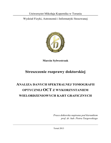 Uniwersytet Mikołaja Kopernika w Toruniu Wydział Fizyki, Astronomii i Informatyki Stosowanej Marcin Sylwestrzak Streszczenie rozprawy doktorskiej ANALIZA DANYCH SPEKTRALNEJ TOMOGRAFII OPTYCZNEJ OCT Z WYKORZYSTANIEM WIELORDZENIOWYCH KART GRAFICZNYCH Praca doktorska napisana pod kierunkiem prof. dr. hab. Piotra Targowskiego Toruń 2013 Wstęp Tomografia optyczna z użyciem światła częściowo spójnego (ang. Optical Coherence Tomgraphy) to nieinwazyjna technika pozwalająca na obrazowanie struktury wewnętrznej obiektów częściowo przeźroczystych dla światła. W wyniku pomiaru w sposób bezkontaktowy otrzymywane są dwuwymiarowe przekroje w głąb obiektu wzdłuż linii skanowania wiązką analizującą. Tak uzyskane tomogramy obrazują wszystkie nieciągłości struktury, które wiązka napotkała na swojej drodze. Dzięki nieinwazyjności metody tomografia optyczna jest obecnie powszechnie wykorzystywana w diagnostyce medycznej jako narzędzie do obrazowania struktur wewnętrznych tkanek i organów – przede wszystkim w okulistyce [1, 2], ale także w dermatologii [3, 4], gastrologii [5, 6] i innych [7, 8]. Poza zastosowaniami medycznymi tomografia optyczna wykorzystywana jest w badaniach materiałowych [9], w szczególności obiektów zabytkowych, takich jak obrazy olejne [10, 11] czy szkła witrażowe [12], w których ze względu na wartość zabytkową badanych obiektów metody inwazyjne są niedopuszczalne. Badania te pozwalają właściwie ocenić stan zachowania zabytków oraz zaplanować, a także monitorować w czasie rzeczywistym niektóre zabiegi konserwatorskie [13, 14]. Jednym z ograniczeń tomografii OCT jest czasochłonna analiza numeryczna danych, która wraz z wizualizacją przekrojów na ekranie zwykle zajmuje więcej czasu niż akwizycja. Obrazowanie w czasie rzeczywistym jest niezbędną funkcją oprogramowania sterującego tomografem. Pozwala ono na właściwe ustawienie pacjenta i przygotowanie go do pomiaru, a w przypadku badań materiałowych – odpowiednie umieszczenie badanego obiektu. Realizacja tego zadania wymaga przede wszystkim szybkiego obrazowania badanego obszaru. W chwili obecnej na dobrze zoptymalizowanym oprogramowaniu pracującym wielowątkowo na procesorze głównym (CPU) uzyskuje się wydajność obrazowania wynoszącą ok. 10 klatek na sekundę dla dwóch przekrojów w rozdzielczości 500 × 1024 piksele. Jakość takiego podglądu ze względu na liczbę zarejestrowanych i przetwarzanych widm nie jest zbyt wysoka i pozwala jedynie na przybliżone ustawienie pacjenta przed wykonaniem właściwego pomiaru. W tej sytuacji uzyskanie obrazu drobnych zmian, 2 istotnych dla diagnozowania, wymaga wykonania wielu pomiarów i jest w pewnym stopniu kwestią przypadku. Od kilku lat bardzo dynamicznie rozwija się technologia przetwarzania danych na procesorach graficznych. Już w 2010 roku NVIDIA deklarowała wydajność wykonywania obliczeń zmiennoprzecinkowych wyższą o rząd wielkości niż osiągalna przez najszybsze procesory główne [15]. Zastosowanie równoległego przetwarzania danych na wielordzeniowych procesorach graficznych otwiera wiele nowych możliwości w technice spektralnej tomografii optycznej, przede wszystkim zaś usuwa główne ograniczenie blokujące obrazowanie w czasie rzeczywistym – czasochłonną analizę danych. Rozprawa liczy 152 strony i podzielona została na sześć rozdziałów. W pierwszym rozdziale przedstawiona została ogólnie metoda spektralnej tomografii optycznej wraz z jej opisem matematycznym i fizycznym. Opisane zostały również metody analizy danych oraz ich wpływ na jakość otrzymywanego tomogramu. W drugim rozdziale została omówiona budowa tomografu, opisane podstawowe elementy i podzespoły wchodzące w jego skład oraz połączenia i zależności pomiędzy nimi. Rozdział ten zawiera również zwięzły opis całego oprogramowania przygotowanego przez autora w celu realizacji tego projektu w języku C/C++ oraz C#. W rozdziale trzecim znajduje się opis wykorzystywanej architektury sprzętowej i technologii równoległego przetwarzania danych na procesorach graficznych. Czwarty rozdział, objętościowo największy i jednocześnie najistotniejszy, przedstawia opis zastosowanych rozwiązań implementacyjnych oraz optymalizacyjnych wprowadzonych w rozwijanych algorytmach przetwarzania danych spektralnej tomografii optycznej. W piątym rozdziale przedstawiono rezultaty bazujące na szybkim przetwarzaniu danych za pomocą zaimplementowanych metod, a więc szybkie obrazowanie tomogramów dwuwymiarowych, wizualizacje trójwymiarowe uzyskane w czasie rzeczywistym oraz algorytmy automatycznej adaptacji protokołów skanowania. Szósty rozdział stanowi podsumowanie rozprawy. Cele projektu i teza rozprawy Zamiarem podjętego projektu reformułowania algorytmów obliczeniowych spektralnej tomografii OCT w celu równoległego przetwarzania danych na wielordzeniowych procesorach graficznych było: 1. umożliwienie wysokojakościowego obrazowania w czasie rzeczywistym, tak aby uzyskiwane przekroje wyświetlane były na ekranie jak najszybciej, bez zbędnych opóźnień, które bardzo utrudniają ustawienie pacjenta bądź obiektu w badaniach materiałowych, 2. obrazowanie bez żadnych ustępstw dotyczących jakości (w celu przyśpieszenia obliczeń) prezentowanego na ekranie przekroju – prezentowany w czasie 3 rzeczywistym tomogram ma być wyświetlony w najlepszej możliwej do osiągnięcia dla tej metody jakości, 3. trójwymiarowe obrazowanie w czasie rzeczywistym, dotychczas (w przypadku obliczeń na procesorze głównym) w ogóle nie osiągalne, 4. implementacja dodatkowych trybów obrazowania rozszerzających standardowe obrazowanie strukturalne w OCT o metodę dopplerowską (pozwalającą na obrazowanie przepływów naczyniach krwionośnych) oraz metodę redukcji szumu plamkowego, 5. implementacja algorytmów automatycznego dostosowywania protokołów skanowania w metodzie: dopplerowskiej – w 