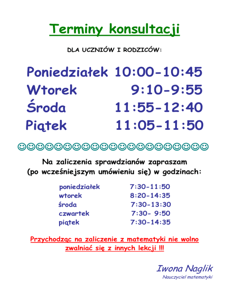 Terminy konsultacji DLA UCZNIÓW I RODZICÓW: Poniedziałek 10:00-10:45 Wtorek 9:10-9:55 Środa 11:55-12:40 Piątek 11:05-11:50 Na zaliczenia sprawdzianów zapraszam (po wcześniejszym umówieniu się) w godzinach: poniedziałek wtorek środa czwartek piątek 7:30-11:50 8:20-14:35 7:30-13:30 7:30- 9:50 7:30-14:35 Przychodząc na zaliczenie z matematyki nie wolno zwalniać się z innych lekcji !!! Iwona Naglik Nauczyciel matematyki