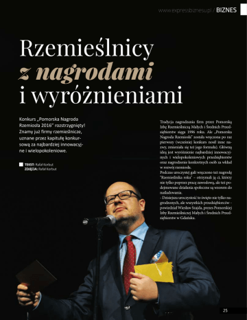 www.expressbiznesu.pl / BIZNES Rzemieślnicy z nagrodami i wyróżnieniami Konkurs „Pomorska Nagroda Rzemiosła 2016” rozstrzygnięty! Znamy już firmy rzemieślnicze, uznane przez kapitułę konkursową za najbardziej innowacyjne i wielopokoleniowe. TEKST: Rafał Korbut ZDjĘcIA: Rafał Korbut Tradycja nagradzania firm przez Pomorską Izbę Rzemieślniczą Małych i Średnich Przedsiębiorstw sięga 1996 roku. Ale „Pomorska Nagroda Rzemiosła” została wręczona po raz pierwszy (wcześniej konkurs nosił inne nazwy, zmieniała się też jego formuła). Główną ideą jest wyróżnienie najbardziej innowacyjnych i wielopokoleniowych przedsiębiorstw oraz nagrodzenie konkretnych osób za wkład w rozwój rzemiosła. Podczas uroczystej gali wręczono też nagrodę "Rzemieślnika roku" – otrzymali ją ci, którzy nie tylko poprzez pracę zawodową, ale też podejmowane działania społeczne są wzorem do naśladowania. - Dzisiejsza uroczystość to święto nie tylko nagrodzonych, ale wszystkich przedsiębiorców powiedział Wiesław Szajda, prezes Pomorskiej Izby Rzemieślniczej Małych i Średnich Przedsiębiorstw w Gdańsku. 25 BIZNES / www.expressbiznesu.pl 26 www.expressbiznesu.pl / BIZNES Szabla Kilińskiego - najwyższe odznaczenie rzemieślnicze nadawane przez Związek Rzemiosła Polskiego: RZEMIEŚLNIK ROKU: Podkategoria „senior rzemiosła”: s Nagroda - Kazimierz Piecuch, zakład ślusarski w Smętowie Granicznym, członek Cechu Rzemiosł Różnych w Starogardzie Gd. s Wyróżnienie - Bronisław Bertrand, zakład stolarski w Luzinie, członek Powiatowego Cechu Rzemiosł Małych i Średnich Przedsiębiorstw w Wejherowie NAGRODZENI: Firma innowacyjna: s Nagroda – firma Stolmach, członek Cechu Rzemiosł Różnych w Nowym Dworze Gd. s Wyróżnienie - Base Group, członek Klubu Biznesu Pomorskiej Izby Rzemieślniczej Firma wielopokoleniowa: s Nagroda - Zakład Produkcyjny Wyrób Mebli i Trumien Roman Stencel, członek Cechu Rzemiosł Różnych w Kartuzach s Wyróżnienie - Piekarnia Cukiernia Ryszard Kraskowski, członek Cechu Piekarzy i Cukierników w Gdańsku Podkategoria „debiut roku”: s Nagroda - firma Masterbud Bartosz Laszczka, członek Spółdzielni Produkcyjno-Usługowej RODŁO z Kwidzyna s Wyróżnienie - Studio Urody Bellezza Katarzyna Oskroba, członek Wojewódzkiego Cechu Rzemiosł Fryzjersko-Kosmetycznych w Gdańsku Podkategoria „osobowość roku”: s Nagroda - Zbigniew Ciecholewski, prezes zarządu spółki „Ciecholewski Wentylacje” s Wyróżnienie - Mirosław Makurat, właściciel firmy AutoMiras, członek Cechu Rzemiosł Różnych w Kartuzach s Zbigniew Stencel, zastępca prezesa Pomorskiej Izby Rzemieślniczej MSP i członek Zarządu Związku Rzemiosła Polskiego s Marian Wenta, sekretarz zarządu Pomorskiej Izby Rzemieślniczej MSP, Starszy Cechu w Kartuzach Złota odznaka Izby Rzemieślniczej „Rzemiosło – za zasługi”: s Krystyna Formela, dyrektor Zasadniczej Szkoły Zawodowej w Sierakowicach s Elżbieta Domańska, burmistrz miasta Dzierzgoń s Mieczysława Jamrozik, kierownik praktycznej nauki zawodu Zespołu Szkół Ponadgimnazjalnych w Kwidzynie s Halina Rybak, kierownik Wojewódzkiego Cechu Rzemiosł FryzjerskoKosmetycznych w Gdańsku s Andrzej Bona, dyrektor Zespołu Szkół Zawodowych im. mjr Henryka Dobrzańskiego HUBALA w Starogardzie Gd. Srebrna odznaka Izby Rzemieślniczej „Rzemiosło – za zasługi”: s Krystyna Stadnicka, dyrektor Centrum Kształcenia Zawodowego i Ustawicznego nr 2 w Gdyni s Marta Krawczyńska-Blacha, nauczycielka w Zespole Szkół Zawodowych im. Stanisława Staszica w Barlewiczkach 27