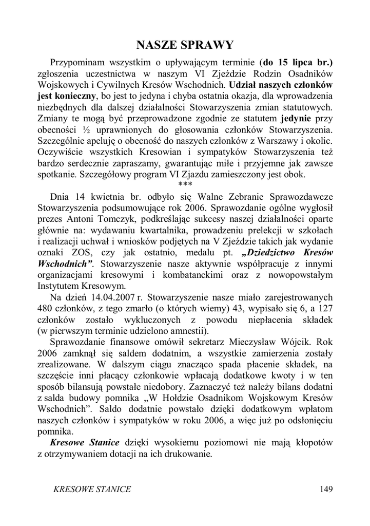 NASZE SPRAWY Przypominam wszystkim o upływającym terminie (do 15 lipca br.) zgłoszenia uczestnictwa w naszym VI Zjeździe Rodzin Osadników Wojskowych i Cywilnych Kresów Wschodnich. Udział naszych członków jest konieczny, bo jest to jedyna i chyba ostatnia okazja, dla wprowadzenia niezbędnych dla dalszej działalności Stowarzyszenia zmian statutowych. Zmiany te mogą być przeprowadzone zgodnie ze statutem jedynie przy obecności ½ uprawnionych do głosowania członków Stowarzyszenia. Szczególnie apeluję o obecność do naszych członków z Warszawy i okolic. Oczywiście wszystkich Kresowian i sympatyków Stowarzyszenia też bardzo serdecznie zapraszamy, gwarantując miłe i przyjemne jak zawsze spotkanie. Szczegółowy program VI Zjazdu zamieszczony jest obok. *** Dnia 14 kwietnia br. odbyło się Walne Zebranie Sprawozdawcze Stowarzyszenia podsumowujące rok 2006. Sprawozdanie ogólne wygłosił prezes Antoni Tomczyk, podkreślając sukcesy naszej działalności oparte głównie na: wydawaniu kwartalnika, prowadzeniu prelekcji w szkołach i realizacji uchwał i wniosków podjętych na V Zjeździe takich jak wydanie oznaki ZOS, czy jak ostatnio, medalu pt. „Dziedzictwo Kresów Wschodnich”. Stowarzyszenie nasze aktywnie współpracuje z innymi organizacjami kresowymi i kombatanckimi oraz z nowopowstałym Instytutem Kresowym. Na dzień 14.04.2007 r. Stowarzyszenie nasze miało zarejestrowanych 480 członków, z tego zmarło (o których wiemy) 43, wypisało się 6, a 127 członków zostało wykluczonych z powodu niepłacenia składek (w pierwszym terminie udzielono amnestii). Sprawozdanie finansowe omówił sekretarz Mieczysław Wójcik. Rok 2006 zamknął się saldem dodatnim, a wszystkie zamierzenia zostały zrealizowane. W dalszym ciągu znacząco spada płacenie składek, na szczęście inni płacący członkowie wpłacają dodatkowe kwoty i w ten sposób bilansują powstałe niedobory. Zaznaczyć też należy bilans dodatni z salda budowy pomnika „W Hołdzie Osadnikom Wojskowym Kresów Wschodnich”. Saldo dodatnie powstało dzięki dodatkowym wpłatom naszych członków i sympatyków w roku 2006, a więc już po odsłonięciu pomnika. Kresowe Stanice dzięki wysokiemu poziomowi nie mają kłopotów z otrzymywaniem dotacji na ich drukowanie. KRESOWE STANICE 149 Sprawozdanie w imieniu redakcji KRESOWYCH STANIC przedstawił wiceprezes Janusz Szuba, podkreślając systematycznie powiększającą się objętość wydawanego kwartalnika, przy niezmienionym nakładzie i stałej, dość pokaźnej liczbie prenumeratorów (od 300 do380). Znaczącym osiągnięciem jest również prowadzenie strony internetowej naszego Stowarzyszenia, którą do dnia 14.04.2007 r. odwiedziło ponad 11.000 internautów. Jest to nasza wizytówka. W imieniu Komisji Rewizyjnej, jej przewodniczący Bolesław Siemiątkowski odczytał protokół i zawnioskował o udzielenie absolutorium zarządowi za 2006 rok działalności. Zebrani przyjęli wniosek jednogłośnie. Sprawozdanie Sądu Koleżeńskiego zasygnalizowało jedynie, że w roku 2006 nie było żadnego posiedzenia, bo nie było takiej potrzeby. Zebrani zatwierdzili: • budżet Stowarzyszenia na rok 2007 • szczegółowy program VI Zjazdu • regulamin Kapituły medalu „Dziedzictwo Kresów Wschodnich oraz samą kapitułę w składzie: A. Tomczyk, J. Szuba, J. Rudziński, M. Wójcik, B. Siemiątkowski. *** Witamy w naszym gronie nowych członków: 481. Jerzy Zalewski, os. Ułańska Dola, pow. Dubno, wnuk osadnika Walentego Beka 482. Irena Małmyga zd. Myczko-Myczkowska, os. Zapole, pow. Pińsk, córka osadnika Stefana Myczko-Myczkowskiego 483. Irena Borowska-Mikulicz, os. Zastawie, pow. Zdołbunów, wnuczka osadnika Jana Głazowskiego 484. Dudek Władysław, os. Stołowicze, pow. Baranowicze, syn osadnika Władysława Dudka 485. Nowacki Czesław, os. Szemiotówka, pow Kobryń, syn osadnika Dominika Nowackiego *** Wpłaty na działalność Stowarzyszenia od 2 lutego 2007 do 30 maja 2007r. Maliszewska Stanisława 74 zł Wasiewicz Stefania 24 zł Skowyra Rozalia 24 zł Szewczyk Maria 4 zł Karczemny Stanisław 24 zł Hryniewicz Helena 24 zł Kozaczuk Leokadia 24 zł Jancz Janina 24 zł Kilian Stanisława 100 zł Wierzbicki Romuald 64 zł Ursyn Niemcewicz Barbara 100 zł Spicewicz Barbara 24 zł 150 KRESOWE STANICE Łysy Helena 24 zł Maczko Izabella 24 zł Pawlak Krystyna 20 zł Hensolt Irena 24 zł Drożyńska Czesława 75 zł Skoczylas Helena i Tadeusz 38 zł Ferschke Alfreda 24 zł Janowczyk Tadeusz 24 zł Szymański Kazimierz 24 zł Misztal Franciszek 24 zł Spitzbarth Maria 60 zł Hajduk Jerzy 24 zł Klęk Stanisław 35 zł Zielonka Kazimiera 160 zł Matraszek Zenon 24 zł Bielska Irena 30 zł Harasimowicz Konrad 24 zł Witwicka Jadwiga 80 zł Zalewski Jerzy 10 zł Szafałowicz Anna 24 zł Wojciechowicz Janina 74 zł Skrzypecki Piotr 24 zł Golema Józef 24 zł Grabowska Irena 10 zł Siemiątkowski Bolesław 24 zł Kocur Irena 44 zł Domagała Helena 14 zł Bernhardt Jerzy 76 zł Korbut Krystyna 30 zł Konieczna Kazimiera 24 zł Klęk Mieczysław 35 zł Kownacki Krzysztof 40 zł Baluch Jerzy 24 zł Sławek Jan 49 zł Muszyński Antoni 68 zł Tarchalski Edward 105 zł *** Wpłaty na kościół w Klecku na Białorusi od 2 lutego do 30 maja 2007 r.: Maliszewska Stanisława 100 zł *** Wpłaty na kościół w Żydomli na Białorusi od 2 lutego do 30 maja 2007 r.: Leokadia Wiśniewska 100 USD *** Zapraszamy na nasze otwarte zebrania zarządu. Oto najbliższe terminy zebrań w roku 2007: 30 lipca, 27 sierpnia, 24 września. Wszystkie zebrania odbywają się w Warszawie przy ul. Poznańskiej 13 m. 7 o godz. 16.00. Pełnimy stałe dyżury sekretariatu i redakcji w każdy czwartek od godz. 15.00 do 17.00. KRESOWE STANICE 151